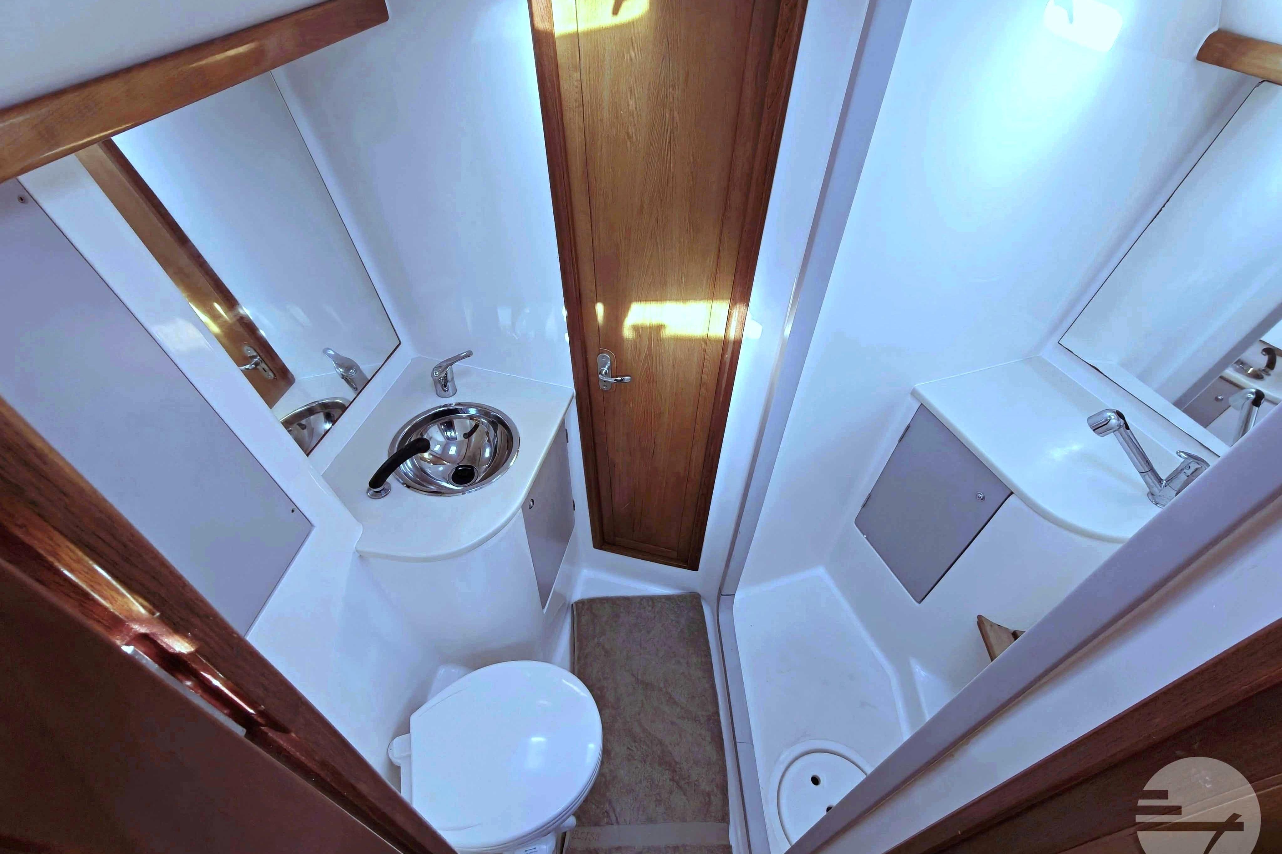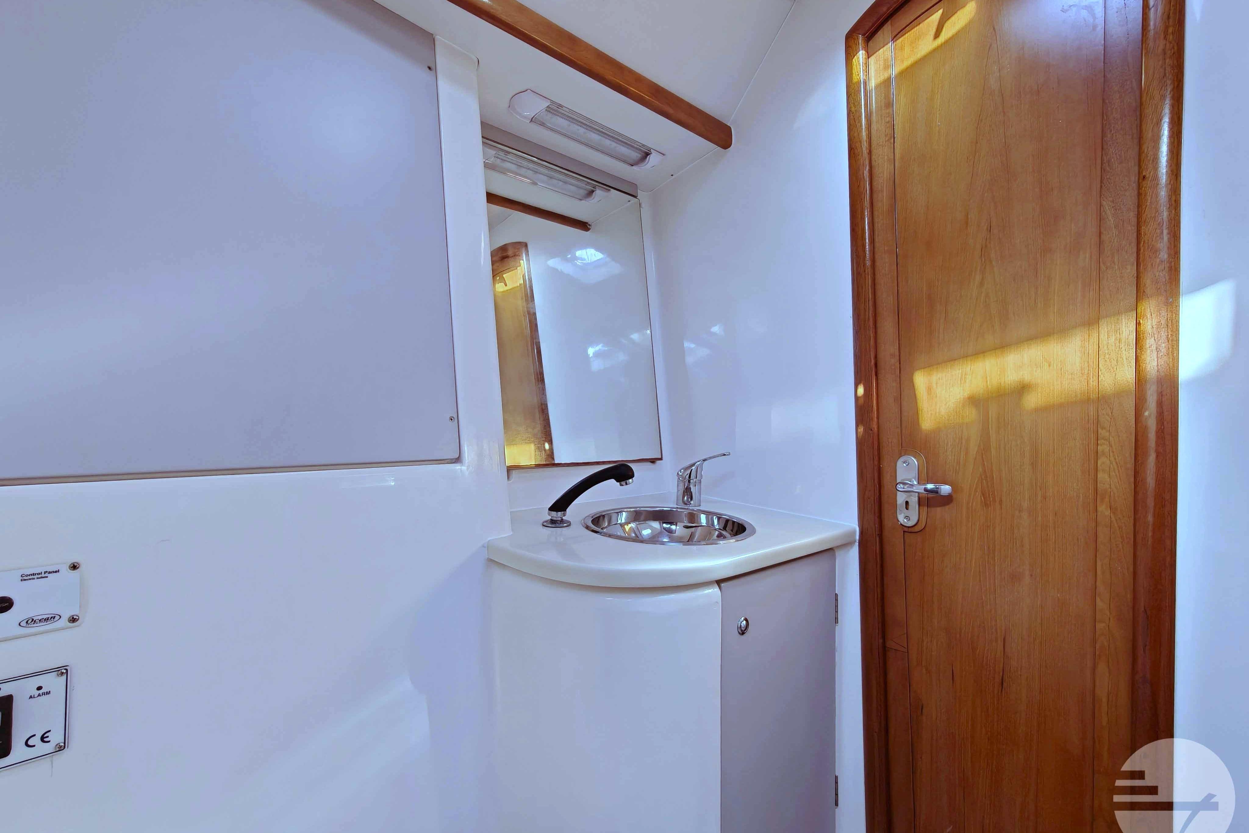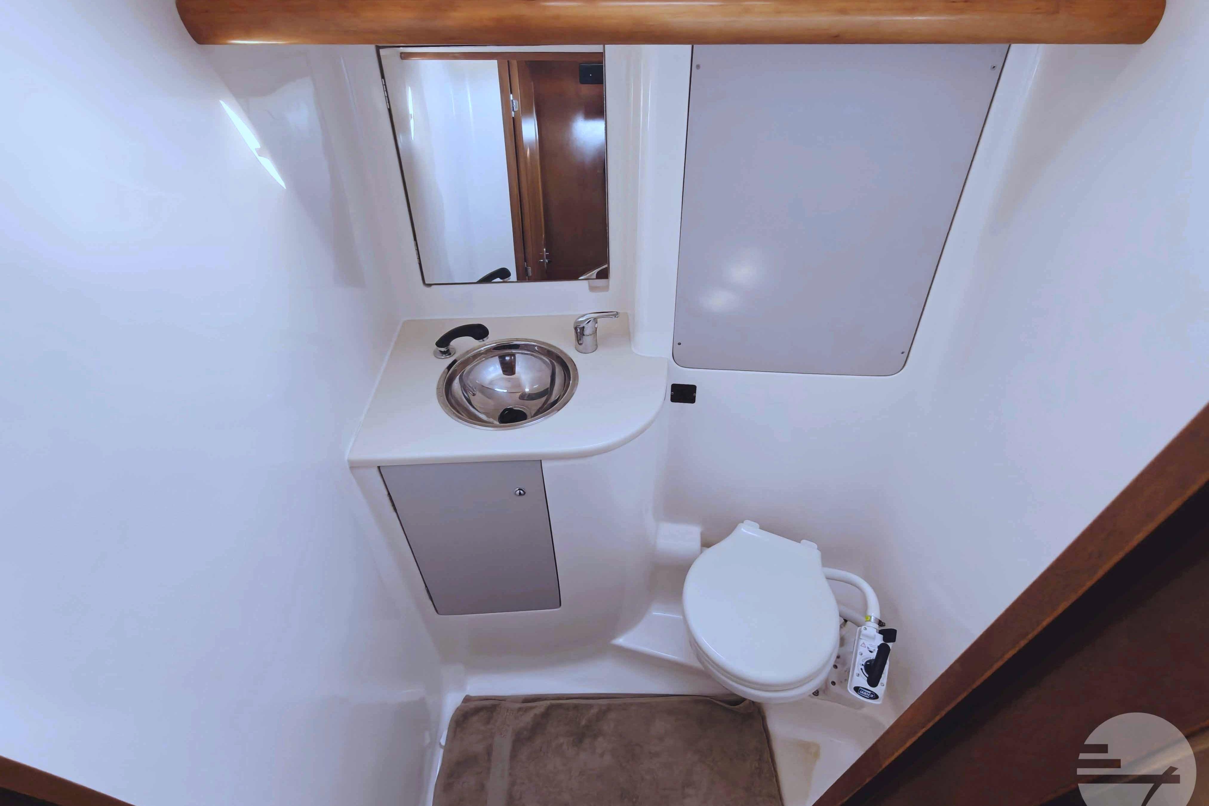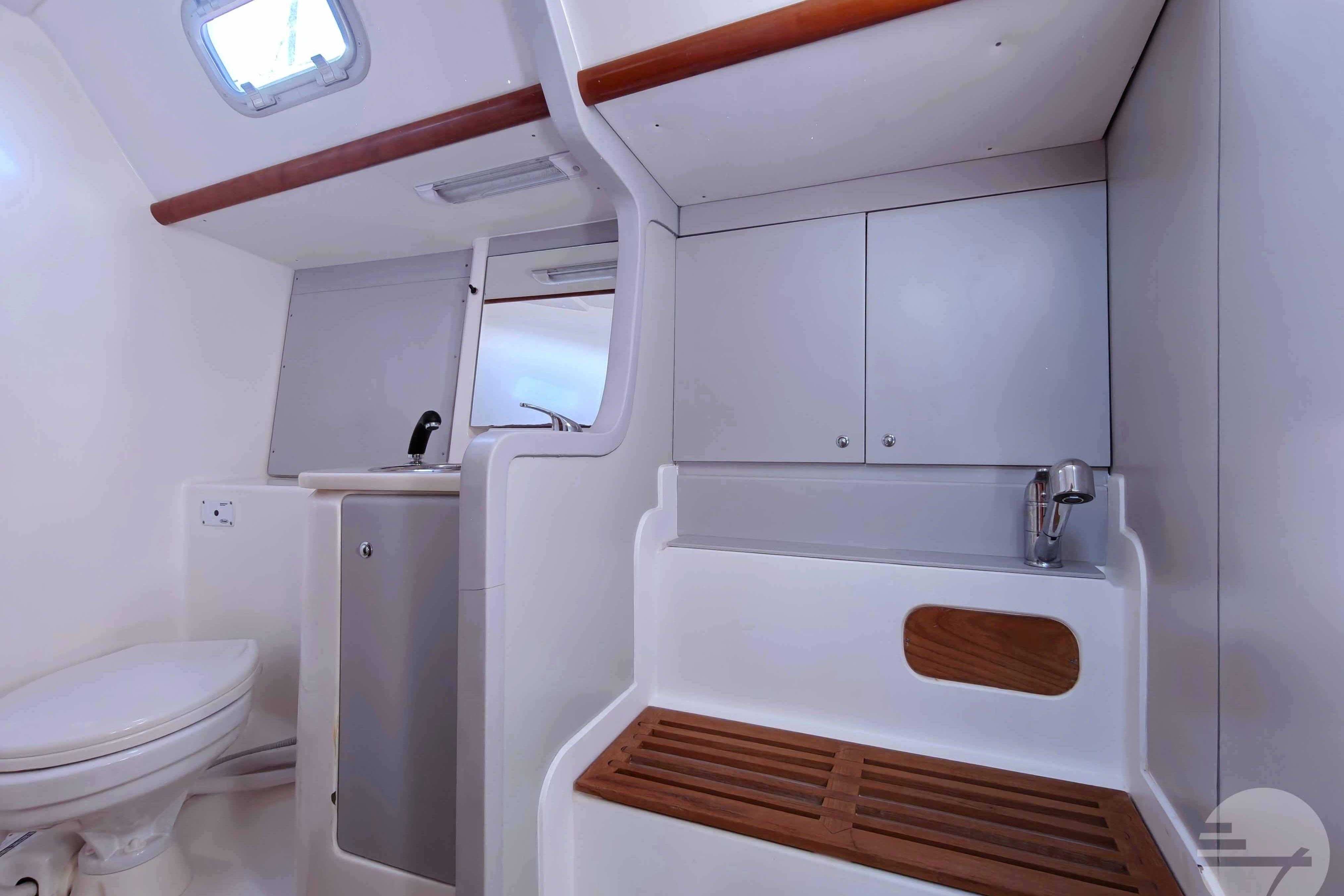 This yacht has two guest cabins, each with its own bathroom with toilet and shower. Forward is a large, nicely appointed owner's cabin with a double bed on the starboard side. The bed has a comfort mattress. There are many drawers and half-height closets. The sofa can be used as an extra bed. The bathroom has a space shower, toilet and sink.