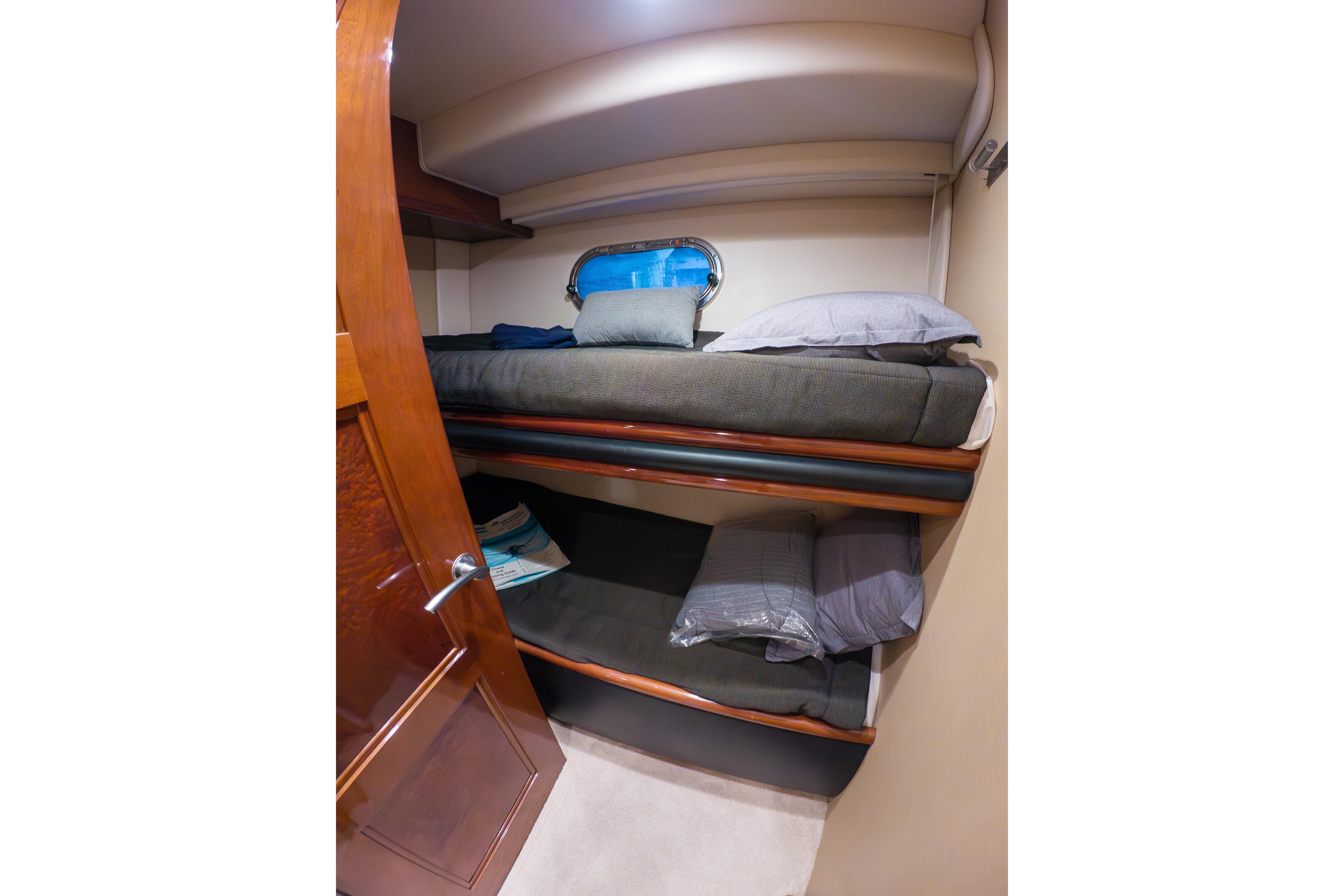 Both staterooms are so spacious, you wonder how Carver did it on a 59-footer—until you see the third stateroom, midway between the two and to port. It has bunks and a shallow (five inches deep) closet but is so small Carver had to design a bi-fold door so you can get in and out of it. This one is definitely more comfortable for kids.