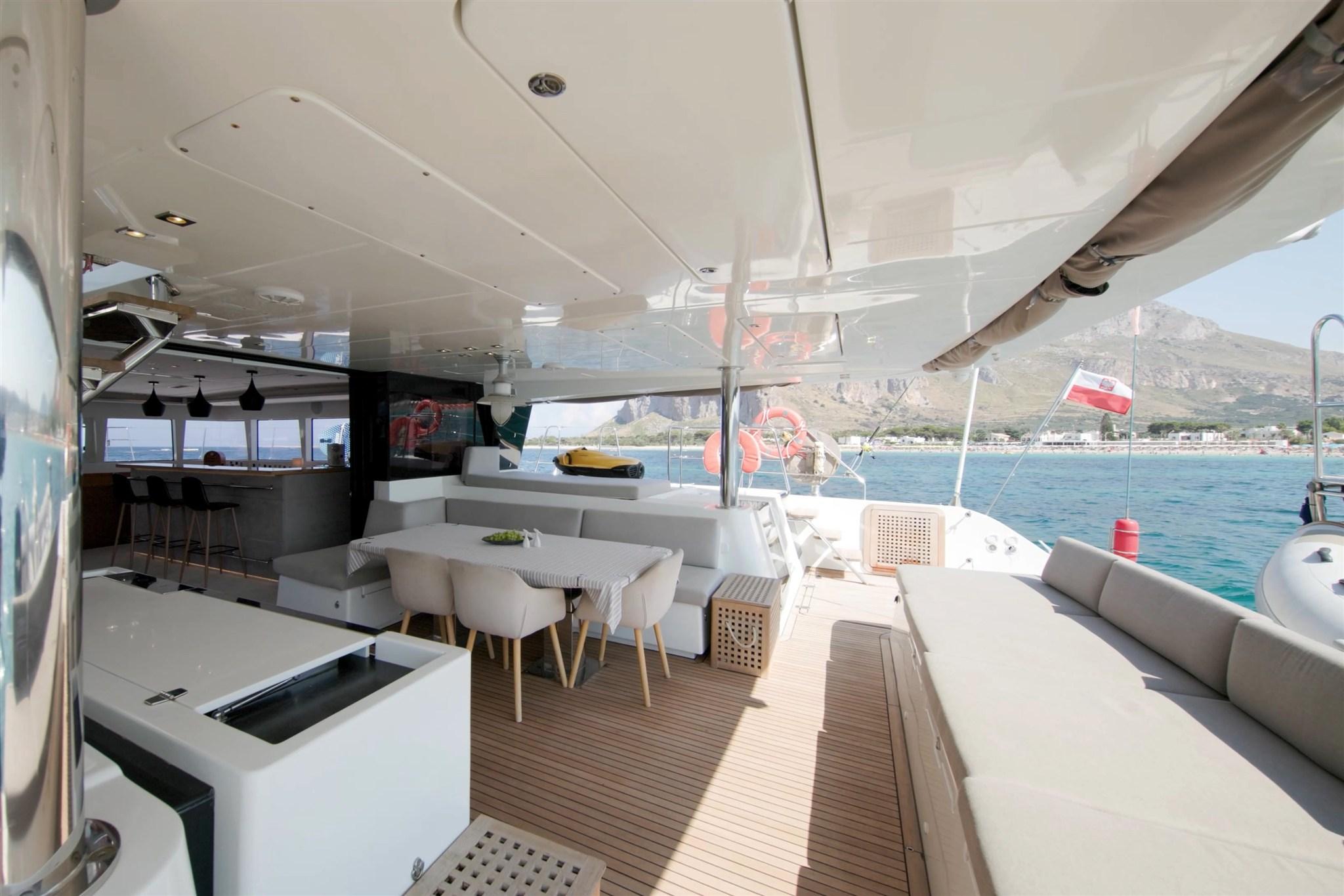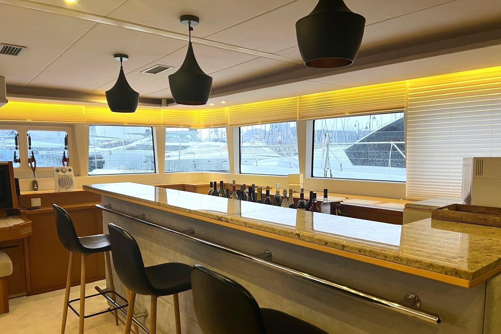 La tappezzeria e i materassi sono nuovi, in Alcantara chiara, scelta che amplifica luce e percezione degli spazi. Il salone è accogliente e conviviale, arricchito da un impianto audio professionale di design italiano e da un bar interno su misura con sgabelli, wine fridge ed espresso machine: setup perfetto per serate a bordo di livello superiore.