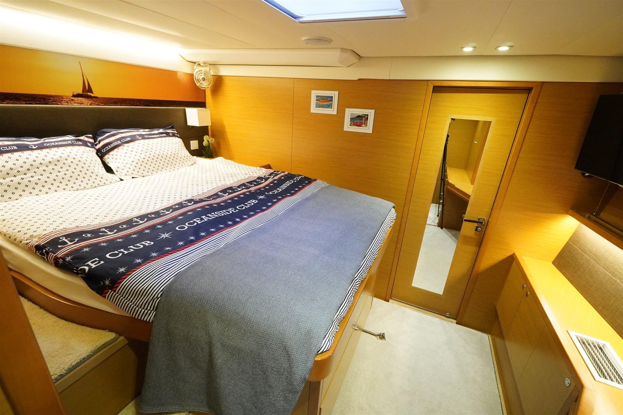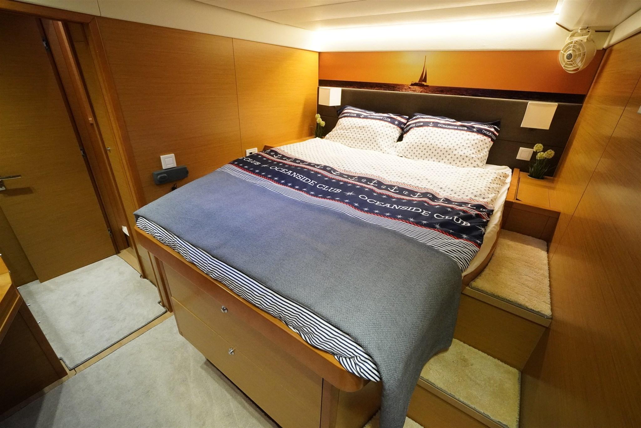 La configuración es la versión para propietarios, con cuatro camarotes, una principal y tres invitados, a los que se añaden dos camarotes delanteros convertibles para la tripulación. La cabina del propietario es la verdadera nave insignia: grande, luminosa, con una zona de oficina dedicada, baño privado con gran ducha y acceso directo a la plataforma de baños. Cada cabina dispone de aire acondicionado y calefacción independientes, baño privado y televisión dedicada.