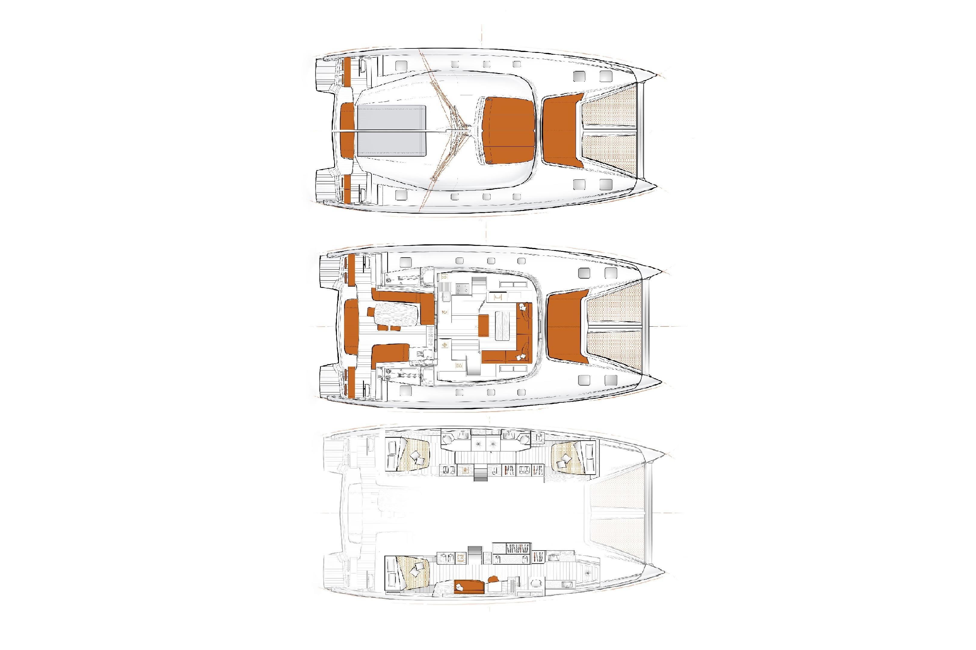 Elegant and comfortable living spaces with 3 cabins & 3 bathrooms version, ideal layout for long cruises and entertaining guests.