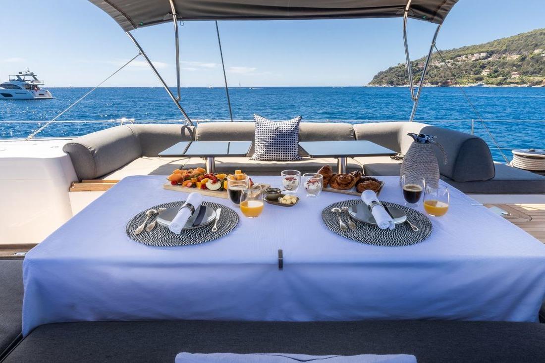 On board, up to 6 guests can be accommodated in 3 elegant cabins (up to 8 guests and 2 crew or 6 guests and 4 crew in 5 cabins), including a spacious owner’s suite. The generous saloon, fully equipped galley, modern amenities, and high-end finishes create a warm and sophisticated atmosphere.