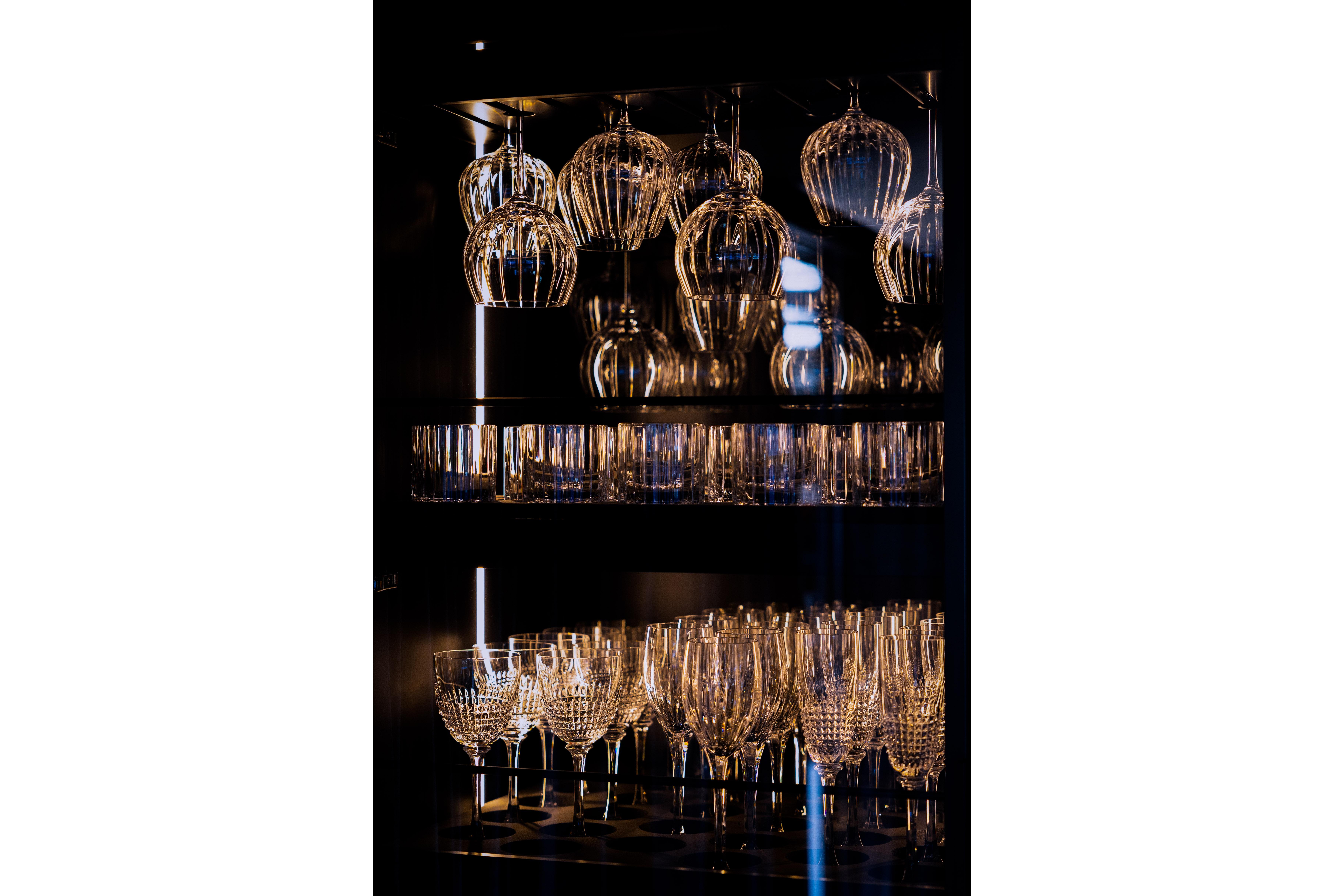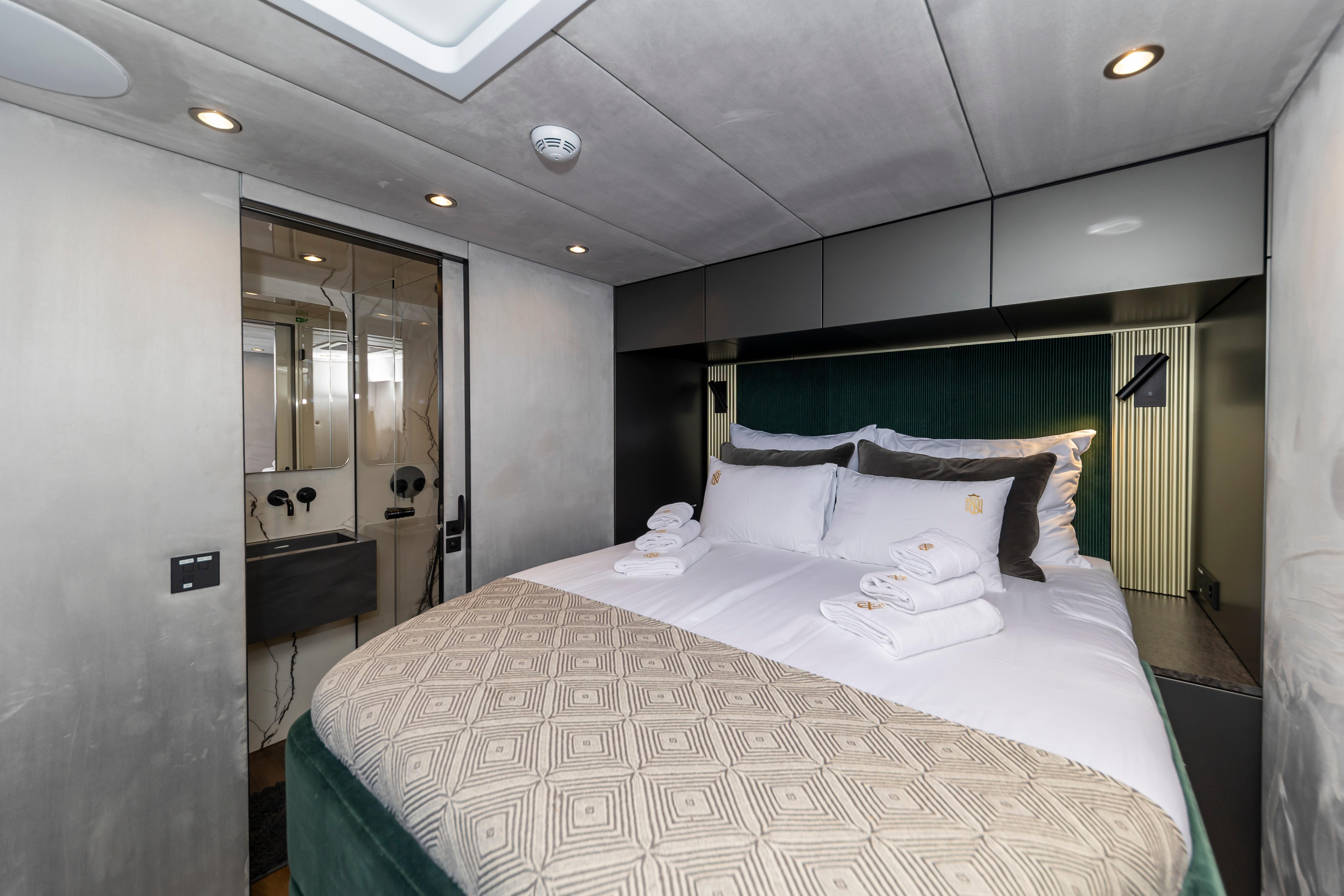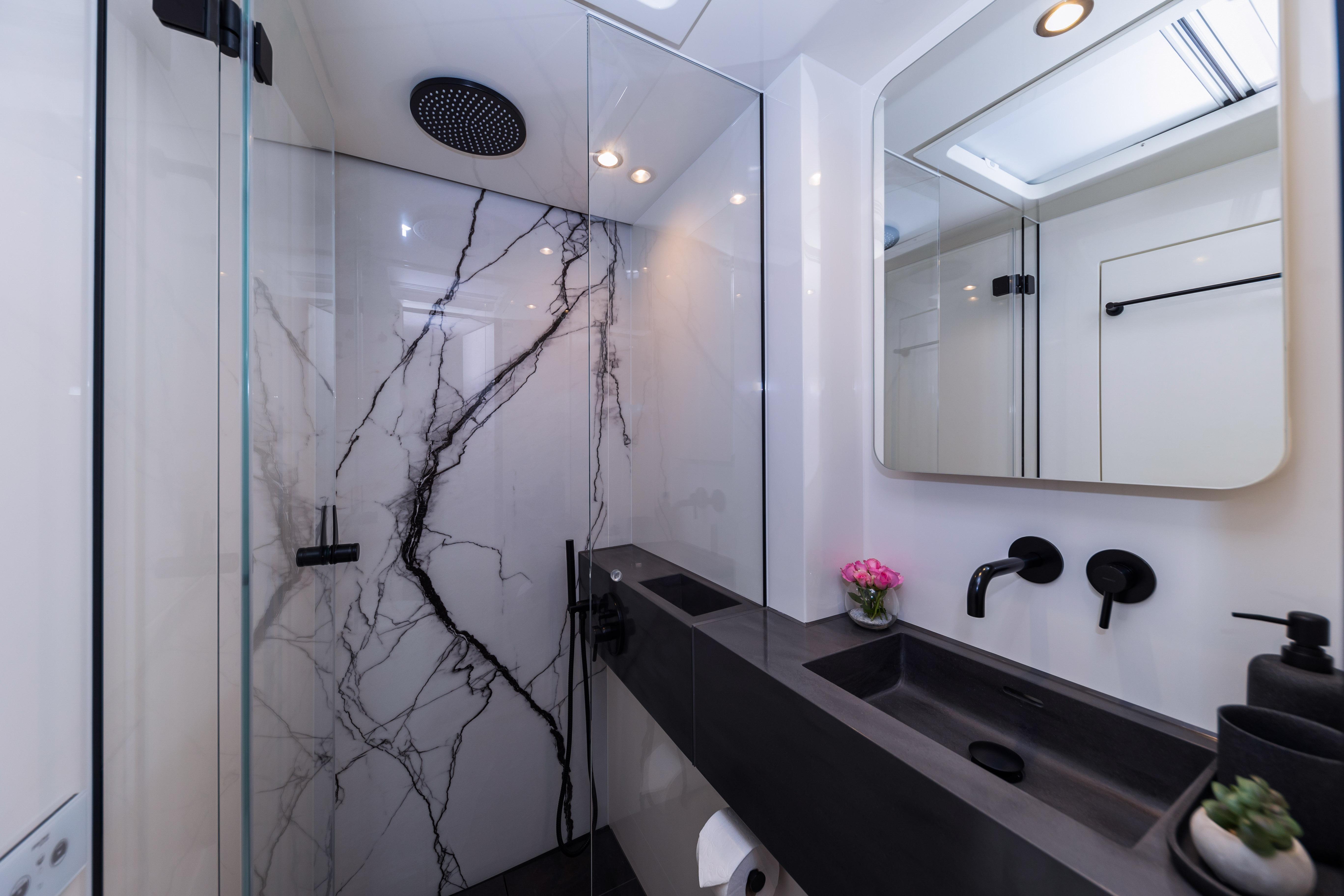 Accommodation is arranged in four guest cabins plus a separate crew cabin. A galley down configuration keeps service discreet and preserves the main deck as a clean, uninterrupted living space. The interior is fully bespoke, finished in premium materials with a confident palette of deep tones and warm gold accents.