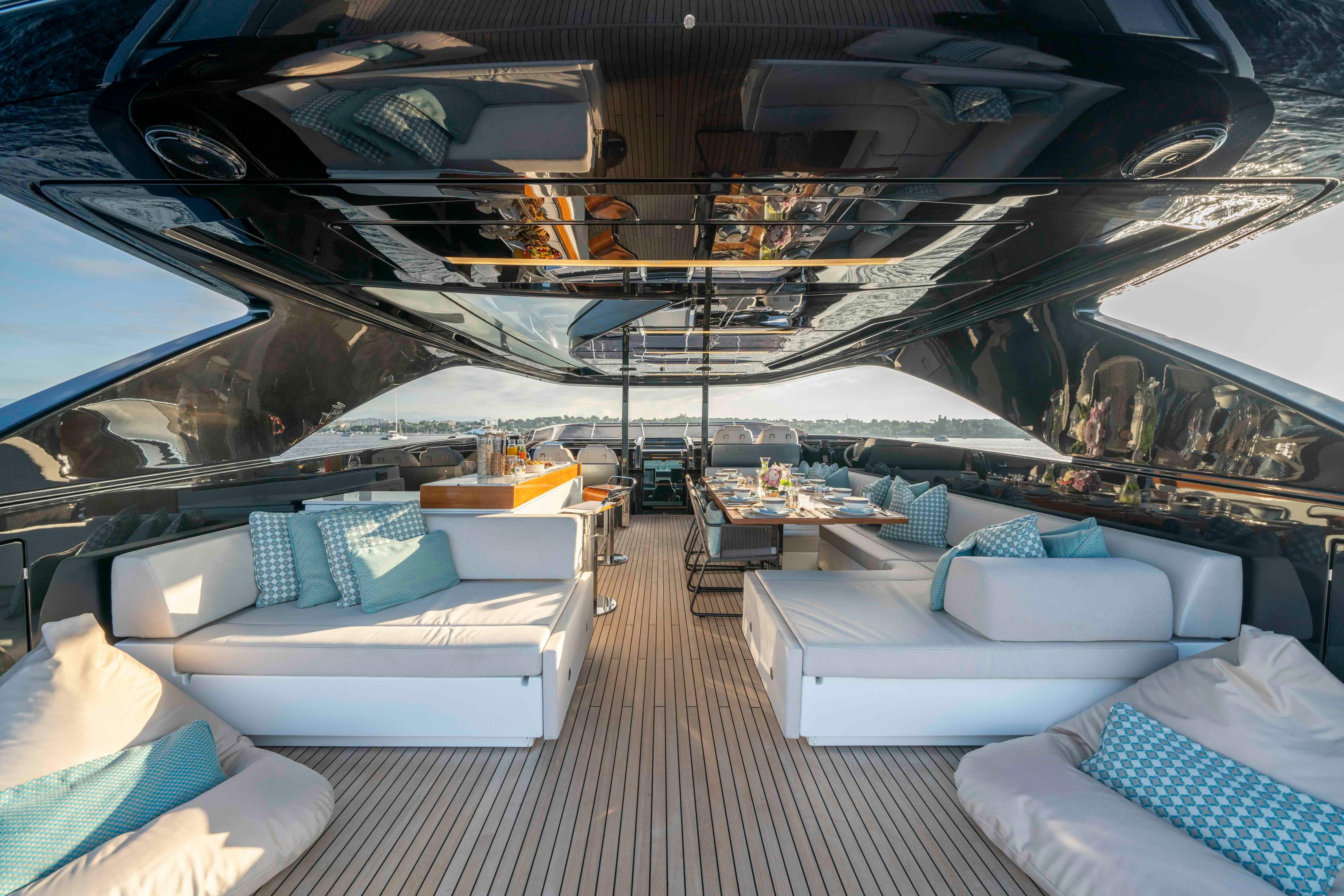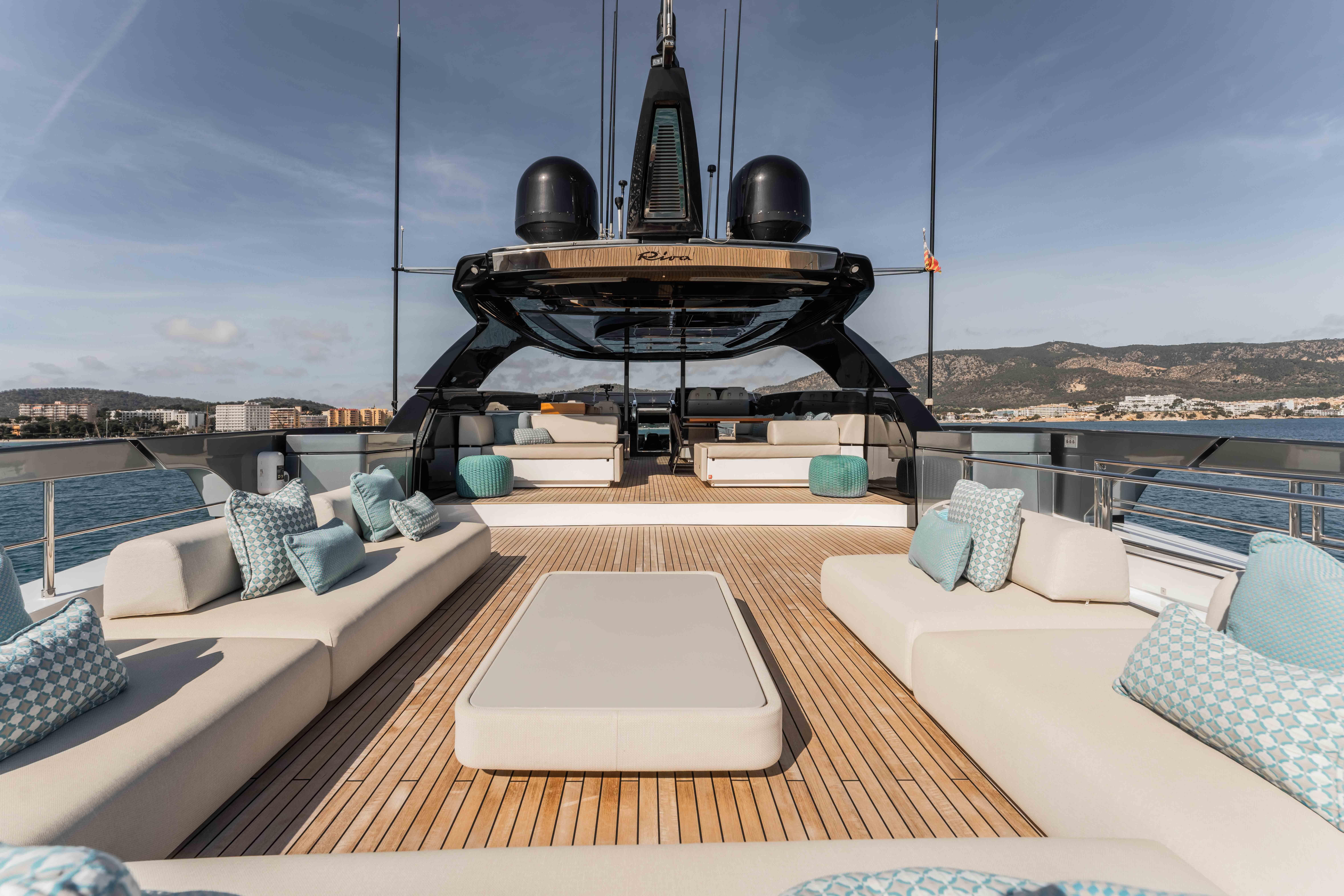 Her exterior styling, penned by Officina Italiana Design in collaboration with the Ferretti Group engineering team, delivers the clean, confident lines that define modern Riva design. Expansive deck spaces are arranged for comfortable outdoor living, with al fresco dining on two decks, integrated bars and multiple shaded lounging areas that work equally well for private use or charter operations.