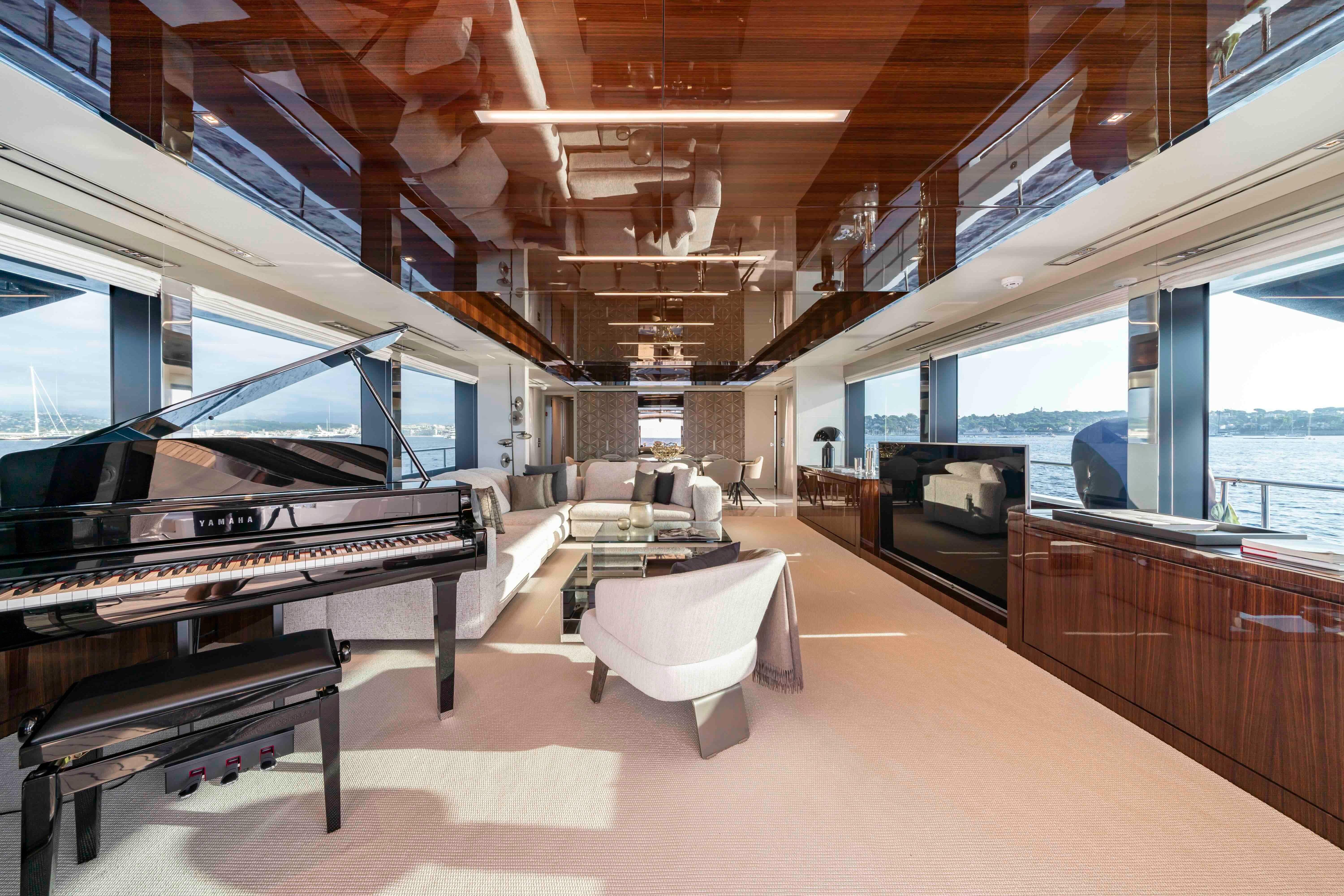 Riva’s reputation for combining speed, luxury and engineering refinement is fully expressed in ELYSIUM I. Beneath the GRP skin of her superstructure sits a stainless-steel structural framework, allowing for exceptionally large main-deck windows with minimal vertical pillars. The result is a main salon flooded with natural light and uninterrupted sea views, more akin to a contemporary waterfront apartment than a traditional flybridge yacht.