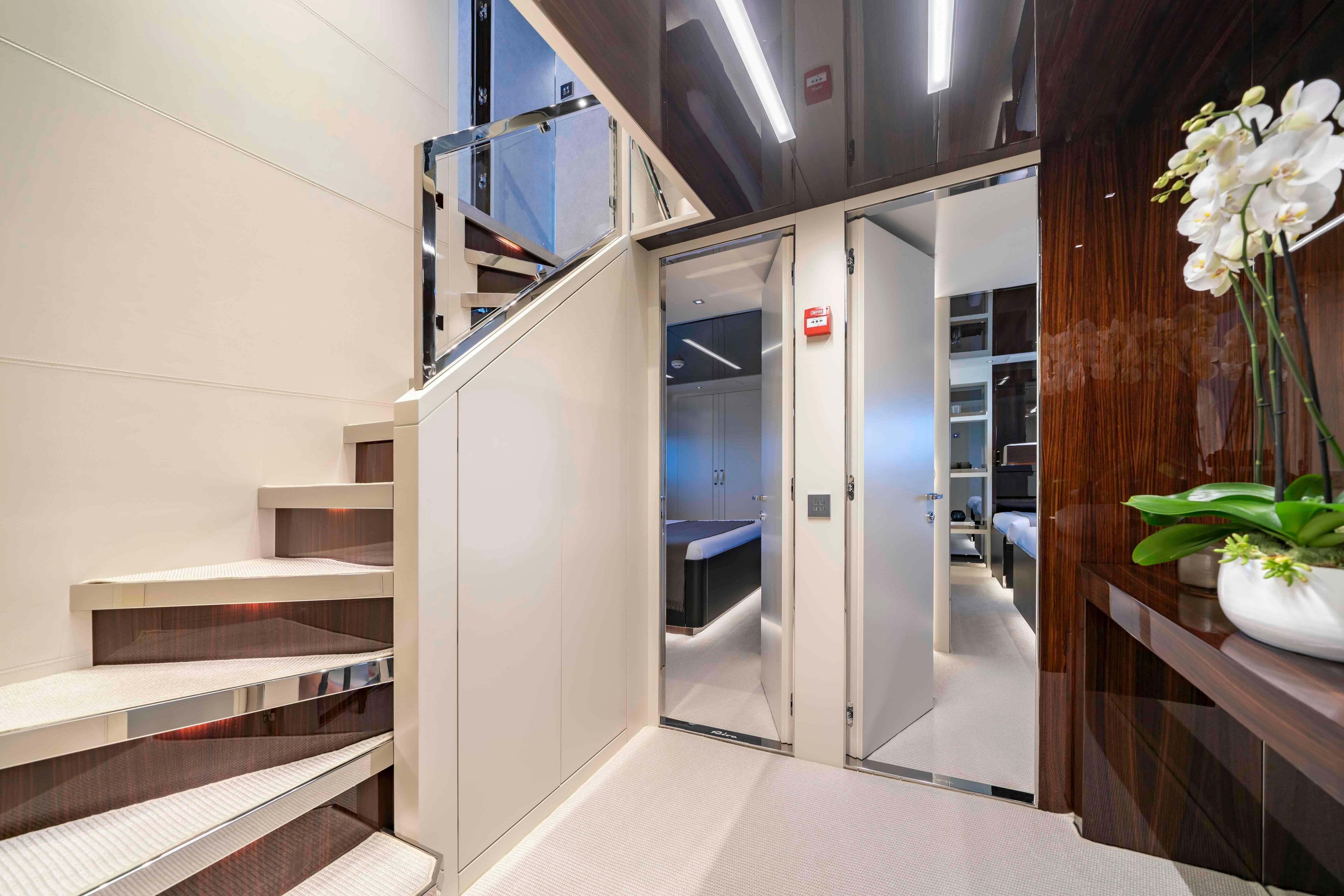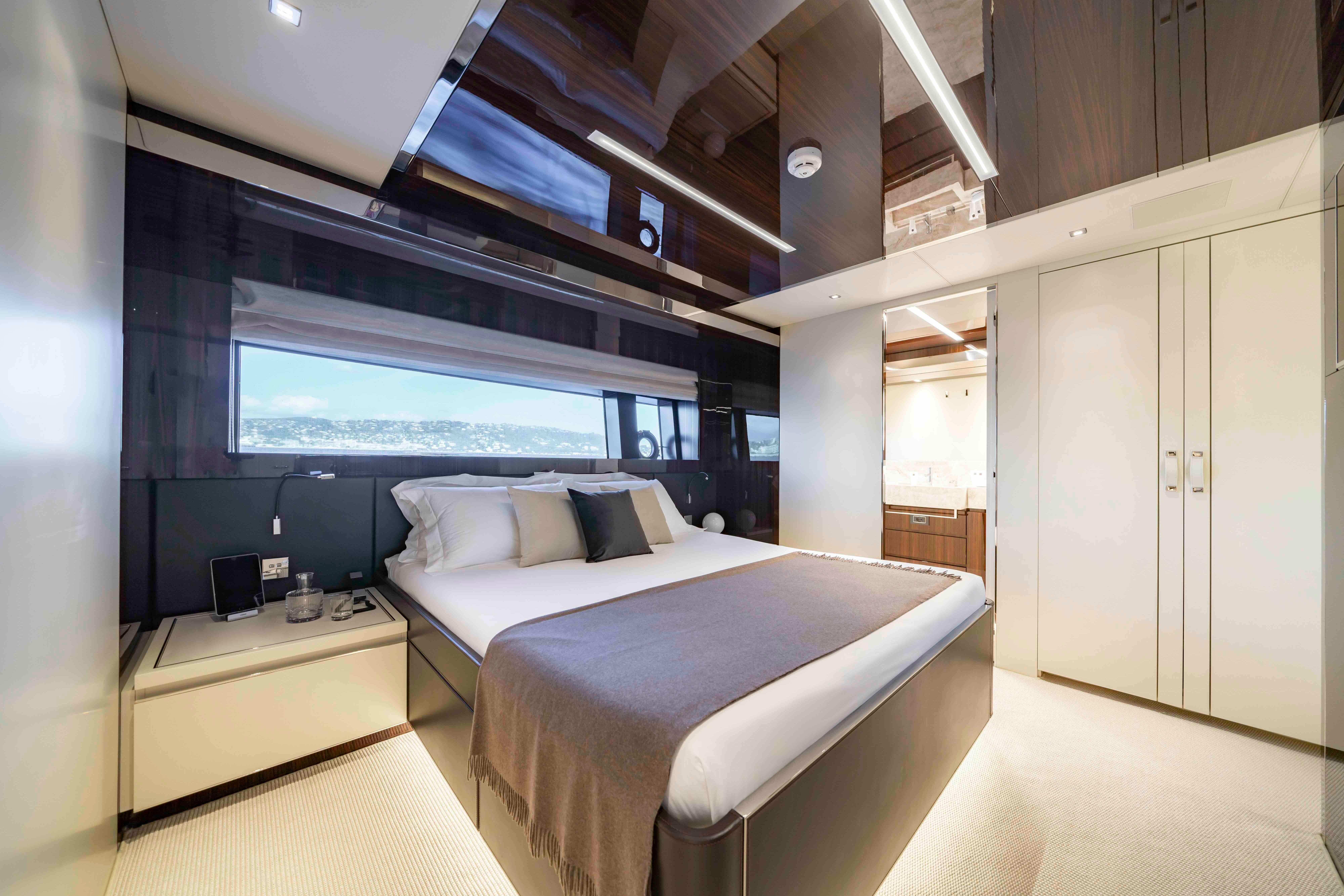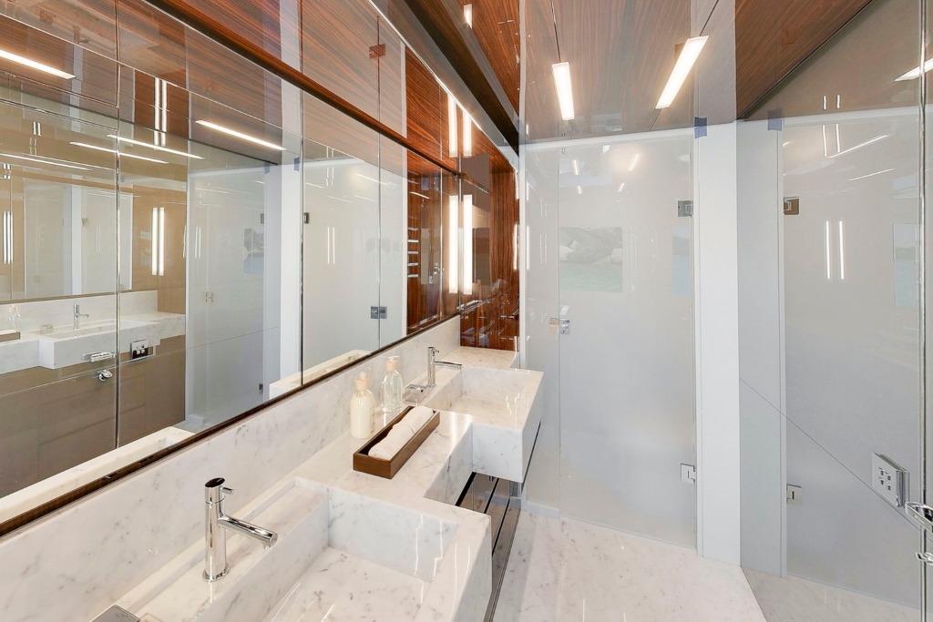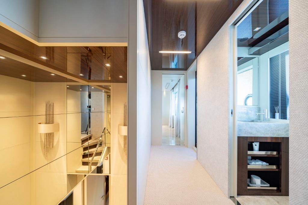 Accommodation is arranged for up to 11 guests across five cabins. The full-beam owner’s suite is located forward on the main deck and finished in striped tropical rosewood veneer, contrasting elegantly with white lacquer surfaces. Large windows, generous headroom, ample storage and a private en-suite create a calm and luxurious owner’s retreat. Four guest cabins are located on the lower deck, all comparable size and accessed from a central lobby. One cabin features sliding berths and an additional Pullman, providing flexibility for families or charter groups. Crew accommodation is arranged for five across three en-suite cabins, accessed discreetly via the galley.