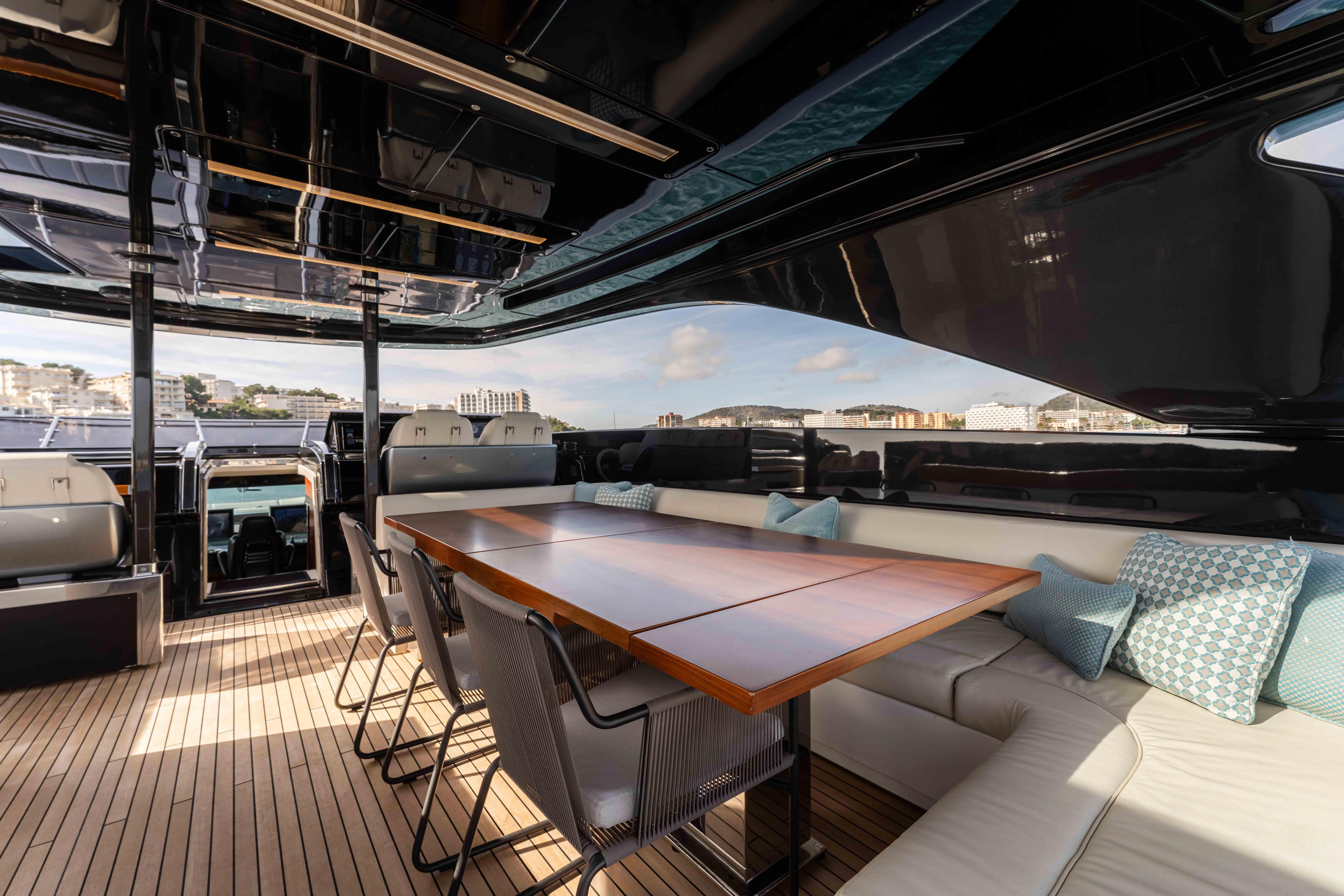 On deck, the main aft deck offers a shaded formal dining area, while the flybridge is divided into multiple social zones, including an informal lounge aft, a central bar and a generous dining table. A large, fixed hardtop provides shade across most of the deck. Forward, the foredeck offers private seating ahead of the bridge and two separate sunbathing areas leading toward the bow. At anchor, the aft garage door converts into a substantial bathing platform, enhancing access to the water.