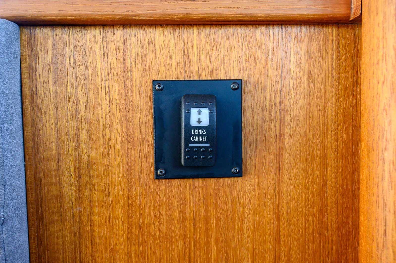 - Powered liquor cabinet in place of hi-low TV at fwd end of settee with 2 shelves for 14" (36cm) bottles (or tallest possible shelves)