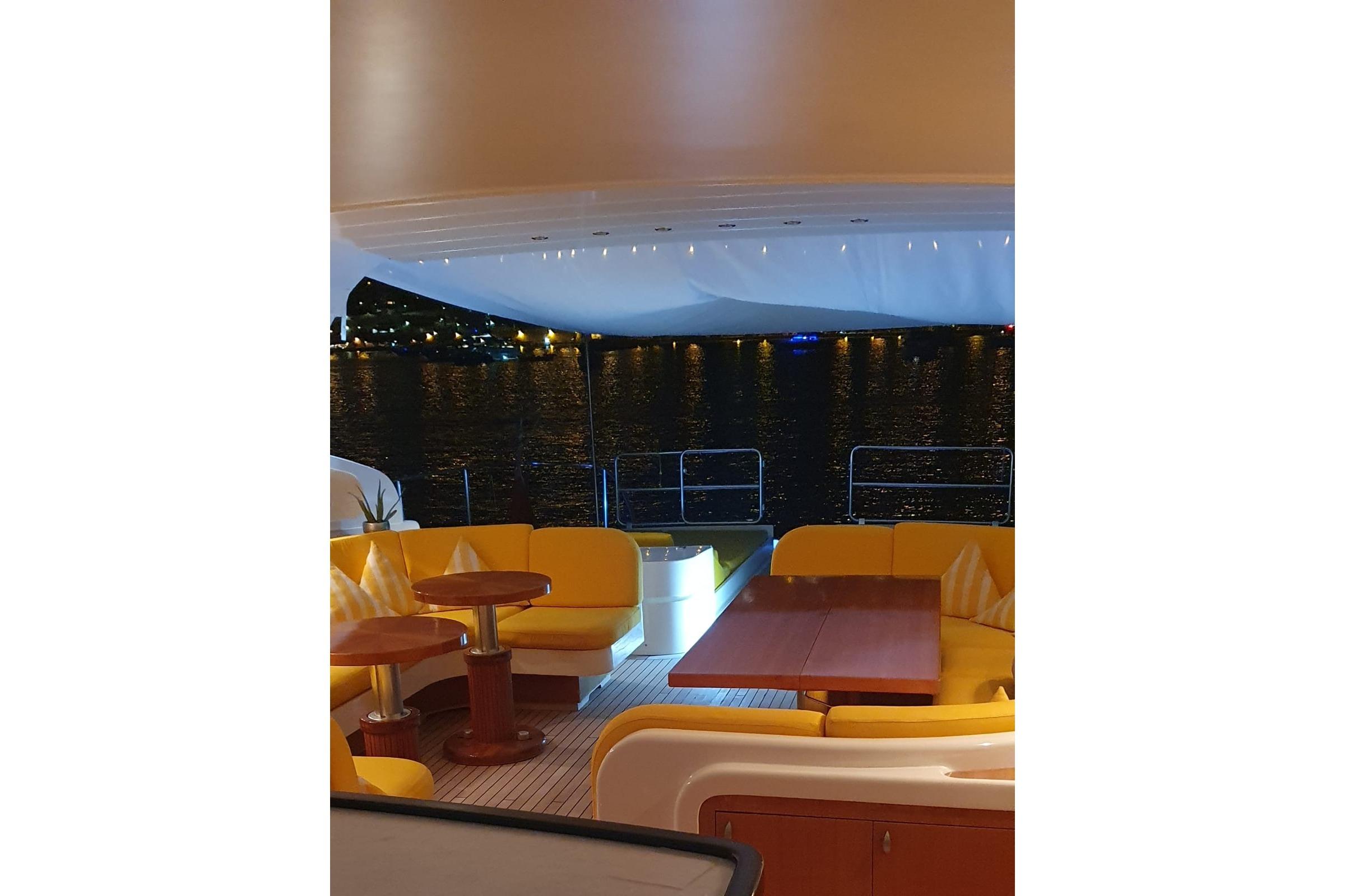 The upper saloon features an electric retractable roof, providing expansive views and additional space. Interior Hermes refit.