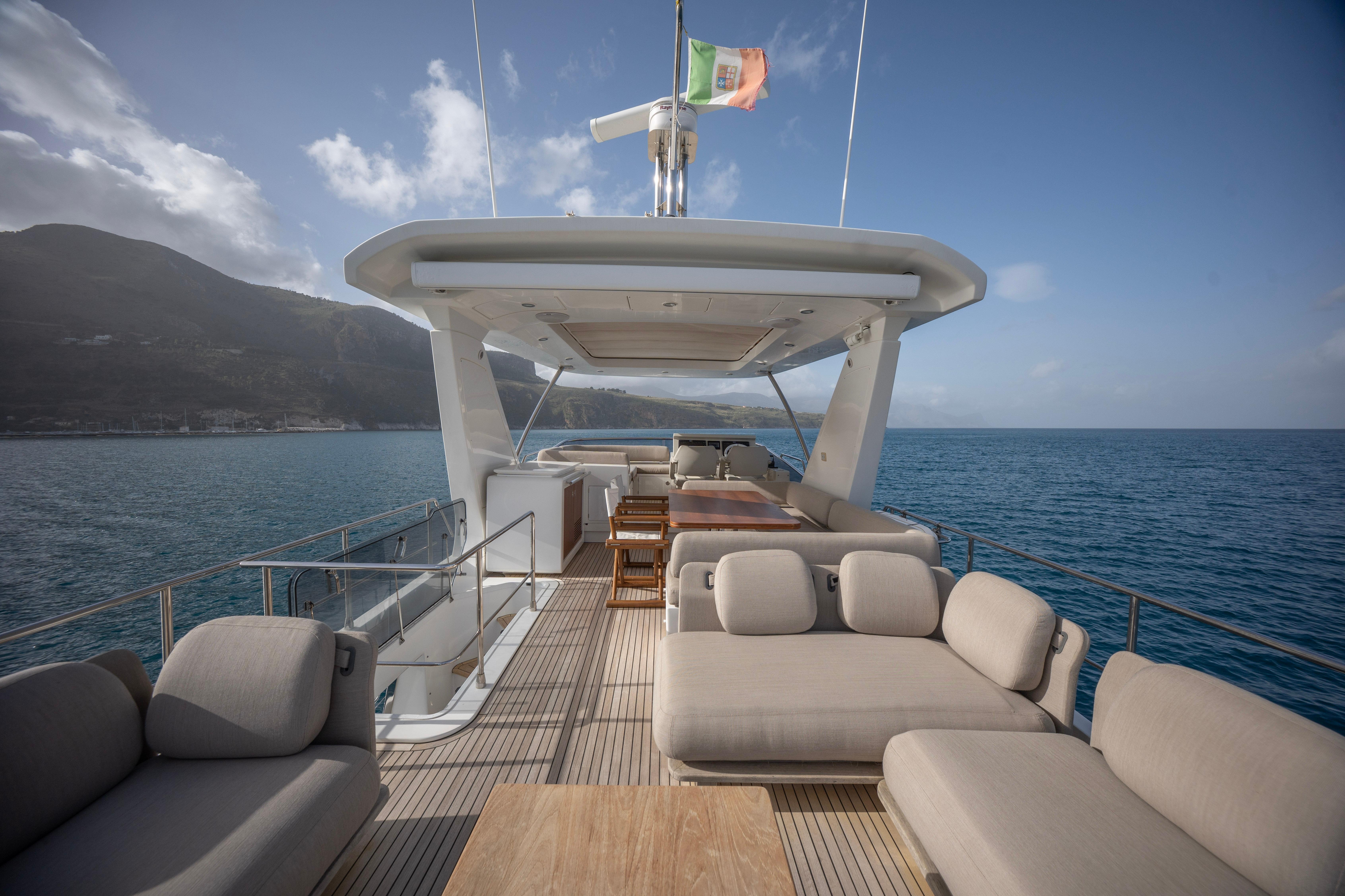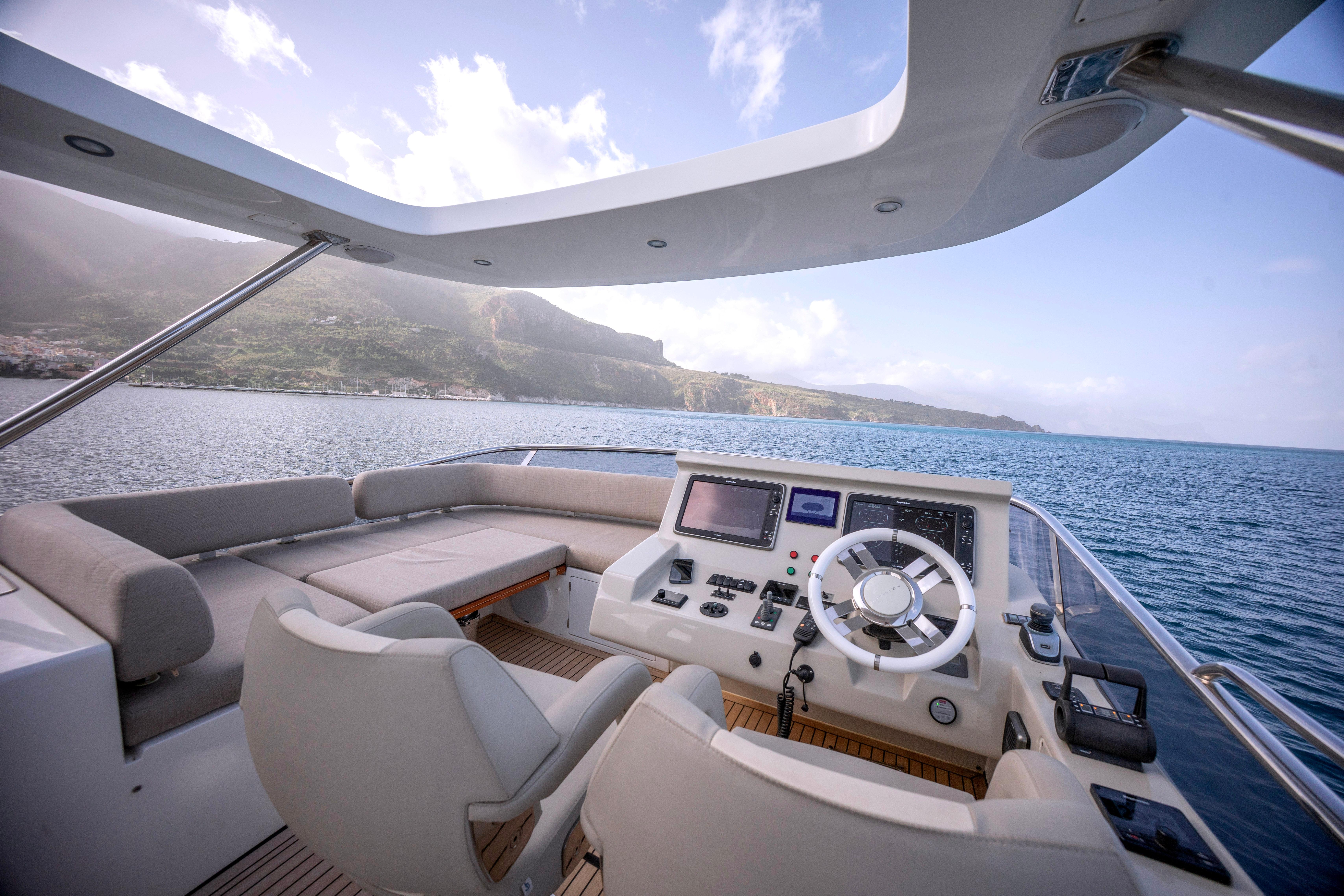 À l’extérieur, l’Azimut 66 est reconnu pour son flybridge d’environ 28 m², l’un des plus vastes de sa catégorie, conçu comme une véritable terrasse panoramique avec des espaces distincts dédiés au pilotage, au repas et au lounge. L’ensemble est complété par un wetbar / cuisine extérieure parfaitement dimensionné pour recevoir, avec zone de préparation, réfrigération et cuisson. Le teck présent sur le cockpit, la plateforme de bain et le flybridge renforce l’ADN “yacht lifestyle” de l’unité, tandis que les passavants et la proue en gelcoat antidérapant assurent une circulation pratique et sécurisée au quotidien.