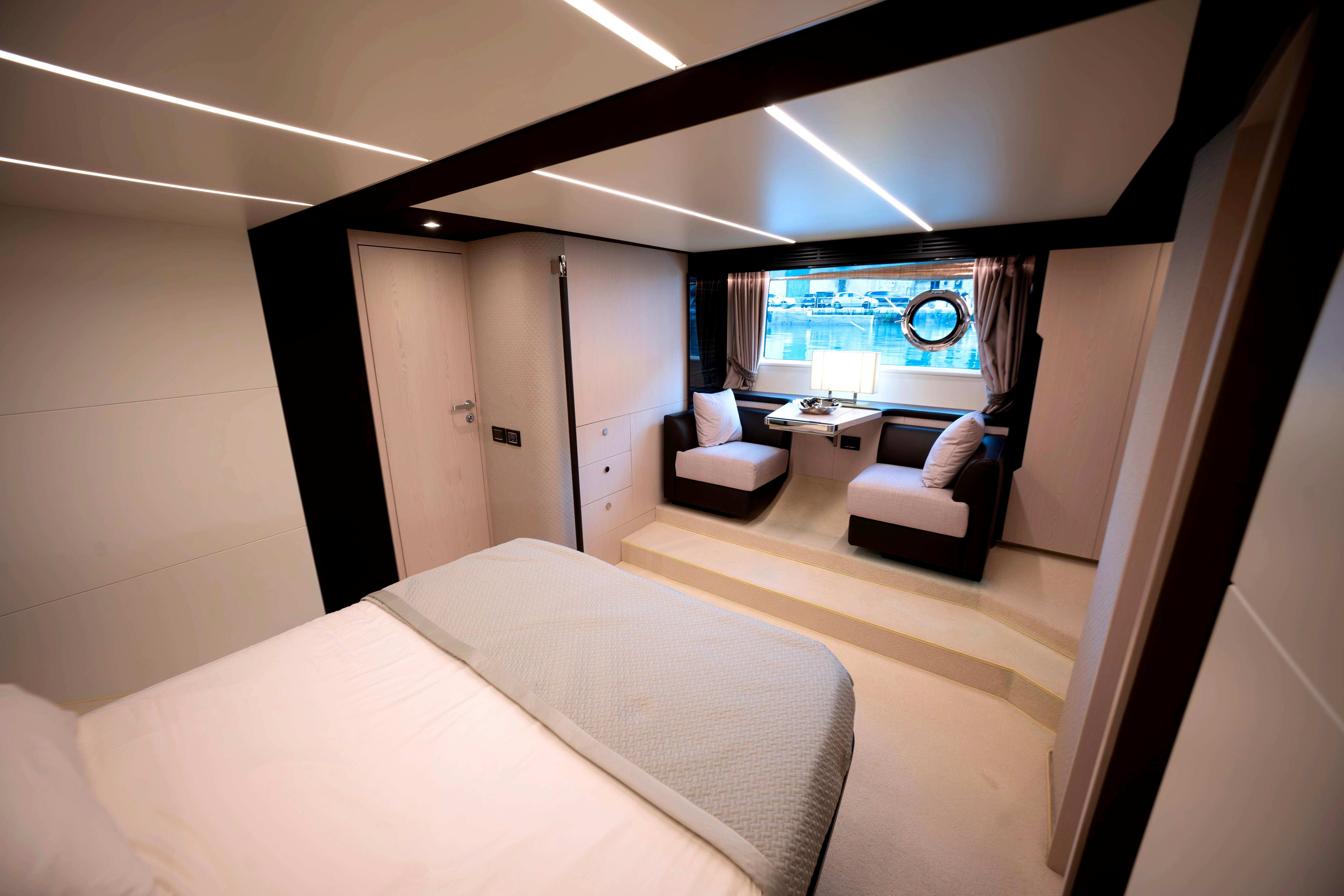 À l’intérieur, l’ambiance est lumineuse, contemporaine et raffinée, avec des finitions claires et une circulation particulièrement fluide. Le yacht propose un plan 4 cabines / 8 invités, comprenant une suite armateur full beam au centre, une VIP avant, ainsi que deux cabines invités, le tout complété par trois salles d’eau. Les quartiers équipage séparés, prévus pour deux personnes, assurent une exploitation discrète et confortable, idéale pour un propriétaire exigeant. L’autonomie à bord est renforcée par un générateur ONAN 19 kW, deux chargeurs de batteries pour la redondance, un dessalinisateur, ainsi qu’un pack électronique Raymarine complet incluant navigation et monitoring, complété par un système audio Fusion amélioré.
