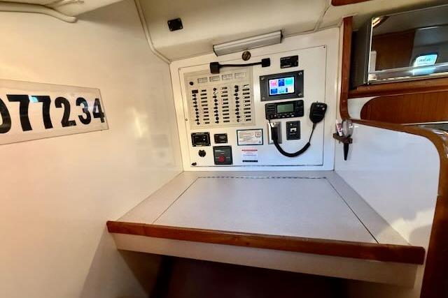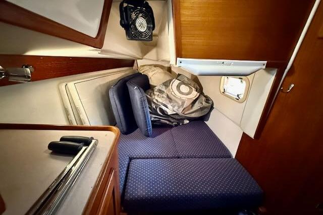 • Main Salon: Bright, airy, and richly finished in warm teak, the salon benefits from 6'5" headroom and the boat’s generous beam.A large, bulkhead-mounted folding table stows away completely, creating an open, spacious “living room” ideal for relaxing, voyage planning, or watching movies. When lowered and the leaf extended, it becomes a very comfortable dining table for six or more.Storage is exceptional: deep lockers above, below, and behind both settees, plus bookshelves with lee bars.The port L-shaped settee converts easily into a double berth for extra guests, while the starboard settee includes a lee cloth for use as a secure pilot berth under way.