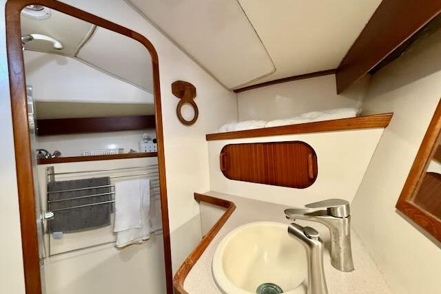 • Forward Owner’s Suite: Instead of the typical cramped V-berth, you’ll find a generous, offset queen-size Pullman berth to port, complete with a custom mattress and excellent storage drawers and lockers beneath. A bookshelf is mounted outboard above the berth.To starboard lies a large cedar-lined hanging locker with shelving, plus additional drawer storage under the berth.The private en-suite head is truly spacious and luxurious: it features a separate walk-in shower with a large Plexiglas door, a roomy vanity/sink area with generous counter space, and abundant storage both above and below.