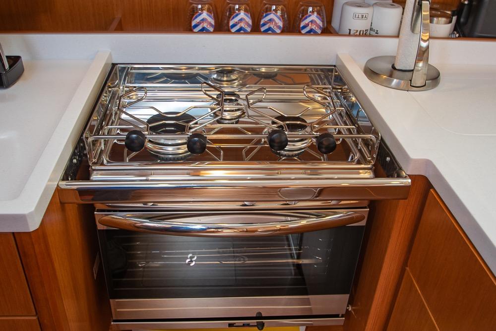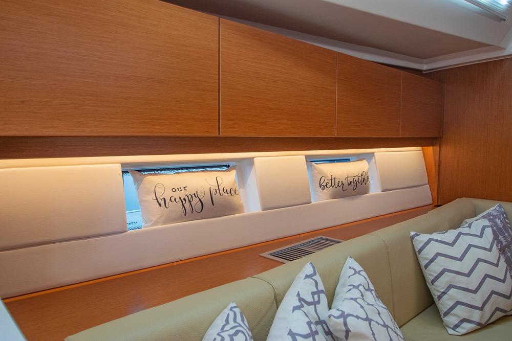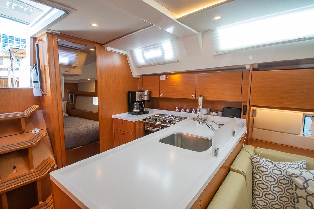 Below deck, the Bavaria C45 feels more like a luxury apartment than a sailboat. The open-plan saloon features panoramic hull windows, flooding the space with natural light. High-quality joinery, modern upholstery, and thoughtful storage make this yacht exceptionally livable.