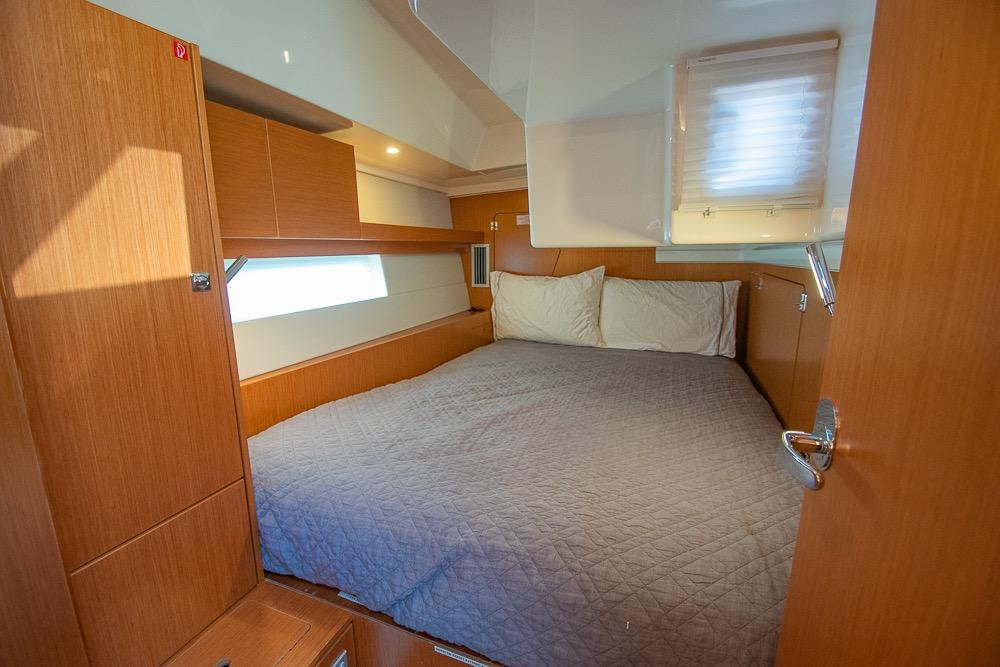The forward owner’s cabin offers a centerline island berth, private ensuite head with separate shower, and abundant storage. Two spacious aft cabins provide comfort for guests or family, with a second head easily accessible from the saloon.