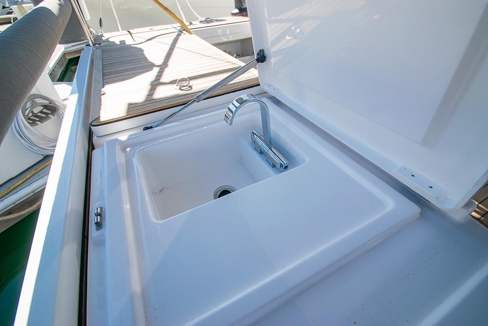 The C45’s wide beam carries aft, creating an expansive cockpit perfect for entertaining or long passages. Twin helms provide excellent visibility and control, while the generous cockpit table and teak finishes elevate comfort at anchor. The large electric swim platform transforms into a private beach, ideal for swimming or launching water toys.