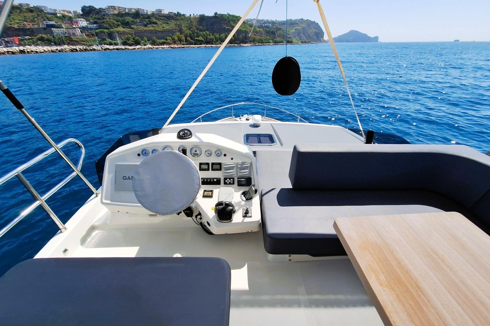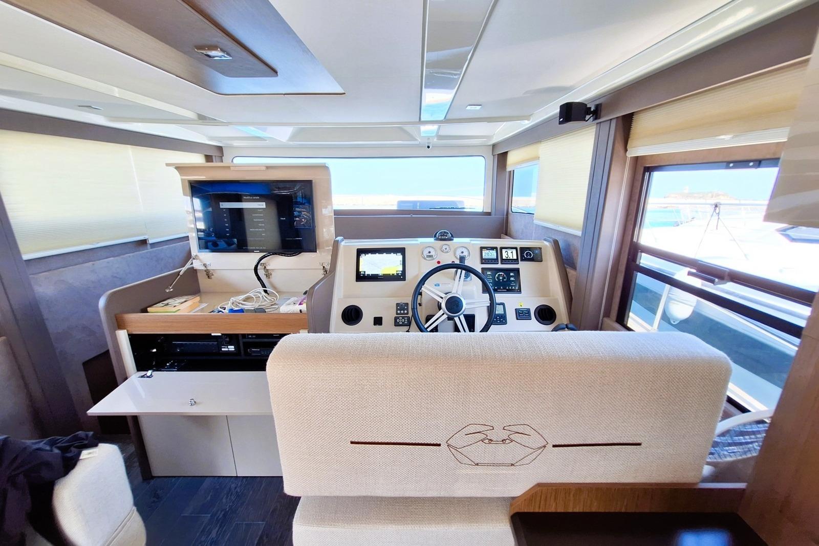 The interior layout is designed to comfortably accommodate up to 6 people.The living area on the port side includes a large, comfortable sofa with a telescopic andextendable dining table, which can also be converted into an additional bed with Fusionstereo system with Denon amplifier, Blu-ray player, and Samsung 32” smart TV.The kitchen area, located on the starboard side opposite the dinette, is fully equipped witha sink, refrigerator, Foster induction hob, Samsung combination oven, and Faber extractor hood.The helm station is forward, featuring a complete Garmin instrumentation package.The forward master cabin has a central double bed, private bathroom with separateshower box, smart TV, and CD/MP3 player.