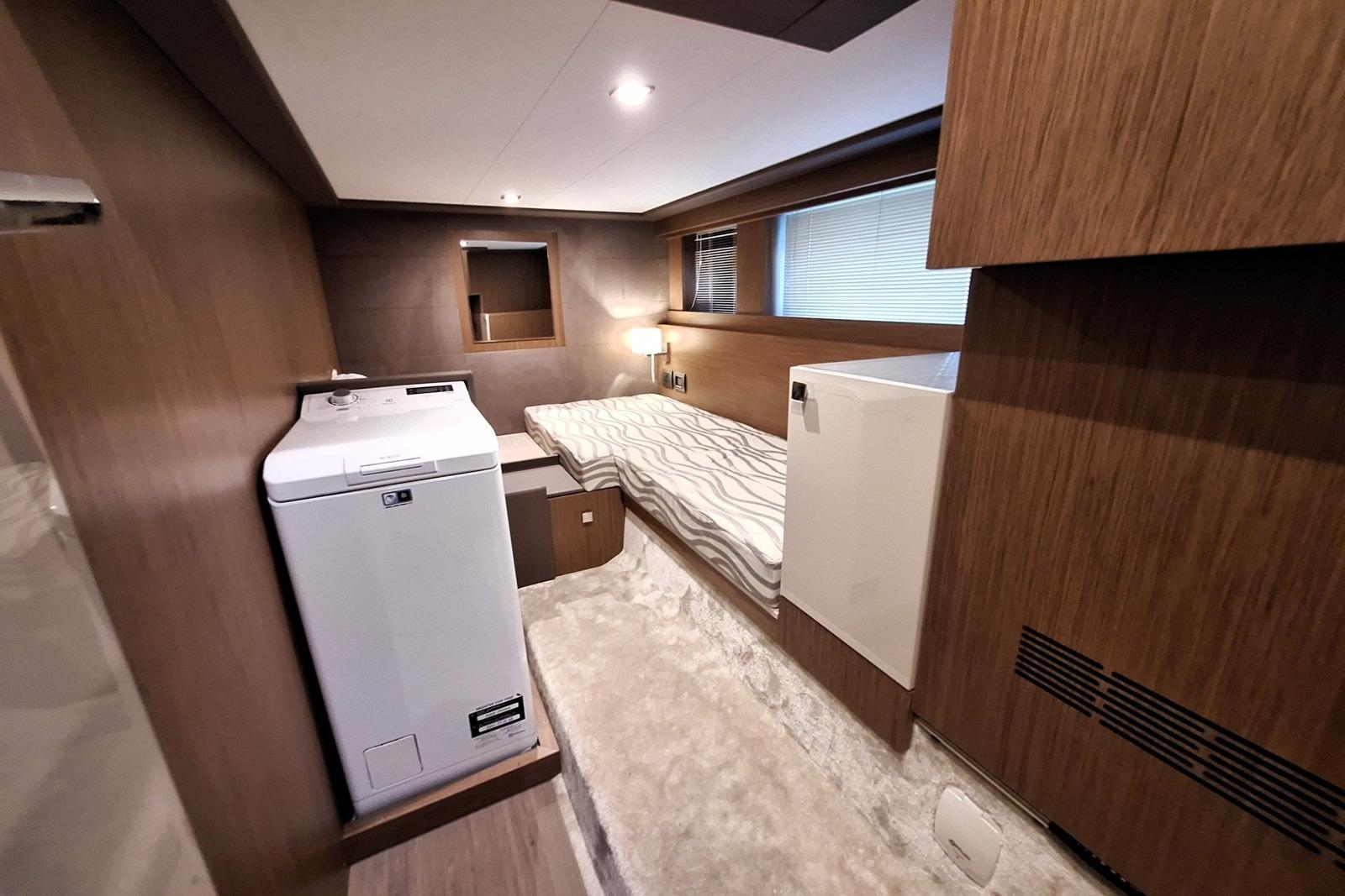 There are 2 guest cabins aft: one double with single beds that can convert into a doublebed, and one single cabin with ample storage space, including an Electrolux washer-dryer.
