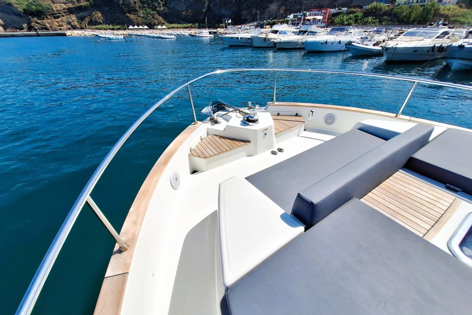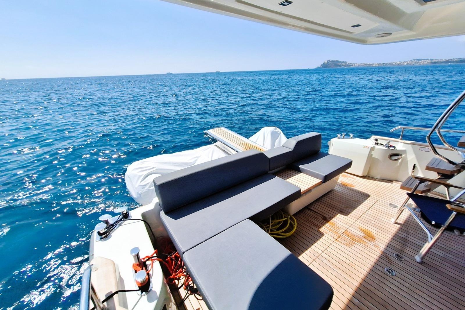 The teak deck features sofas and a foldable table in the cockpit, with Silvertex cushions and thepossibility to enclose the cockpit with removable covers.At the bow, two large modular sunpads with reclining backrests and a sea-facing sofa provide acomfortable lounging area.The hydraulic swim platform (tender lift) allows safe and easy access to the sea.