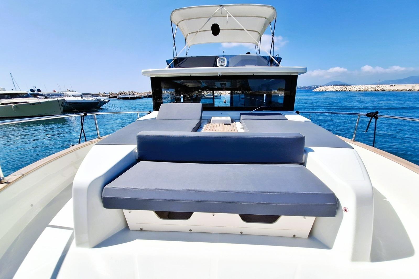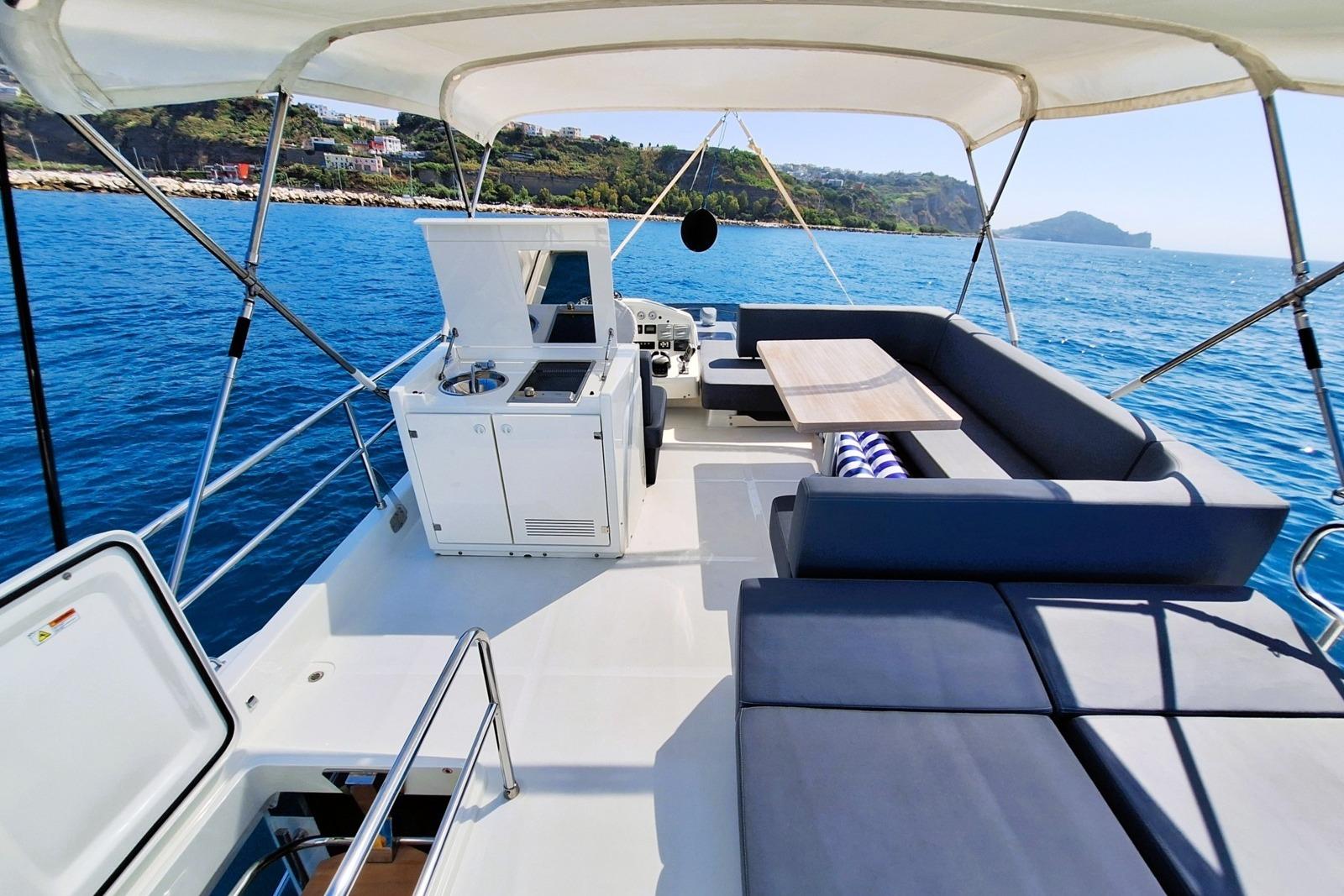 Equipped with a helm station, dinette, large sunbathing area, and a wet bar with a De Longhibarbecue, sink, refrigerator, and bimini top.