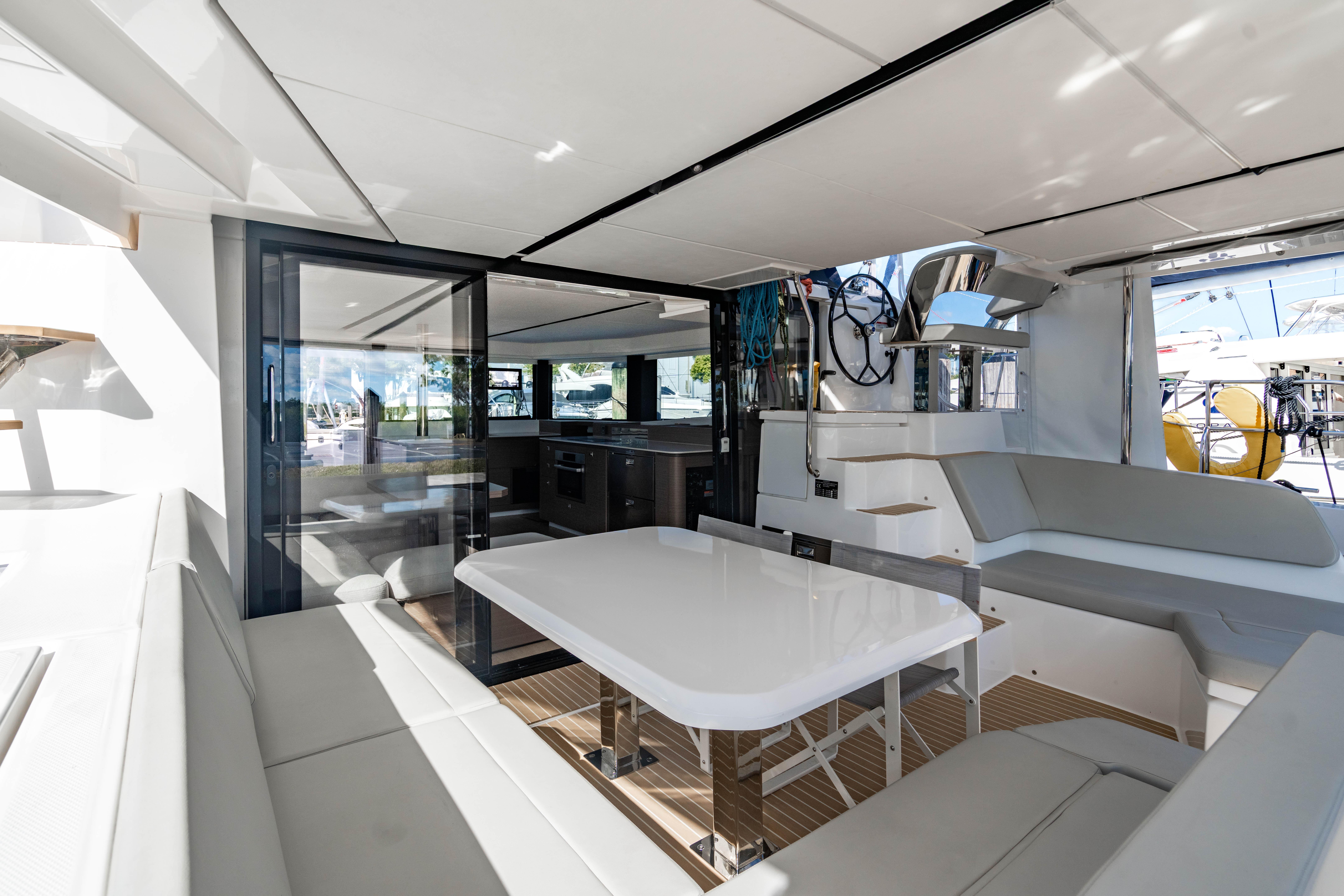 The stepped hulls and powerful rig with overlapping genoa provide superior handling in all wind conditions. The protected helm station is designed for offshore single-handed sailing, making it ideal for long-distance voyages.