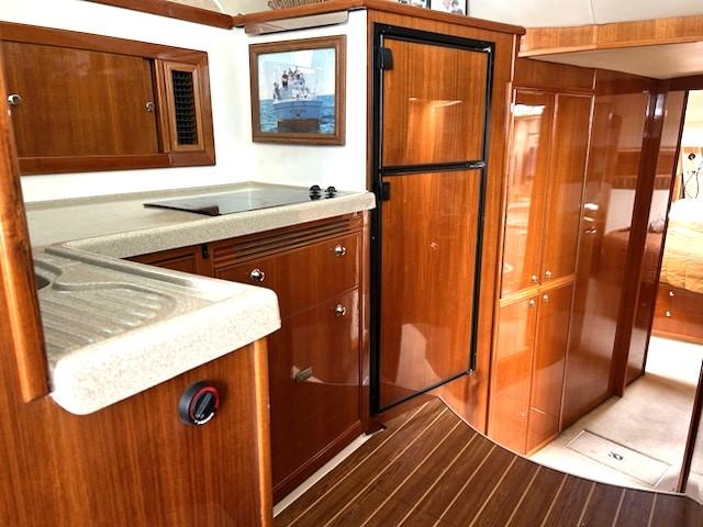 Galley-Down Configuration – Well-equipped with full-size fridge, microwave, cooktop, and ample storage.