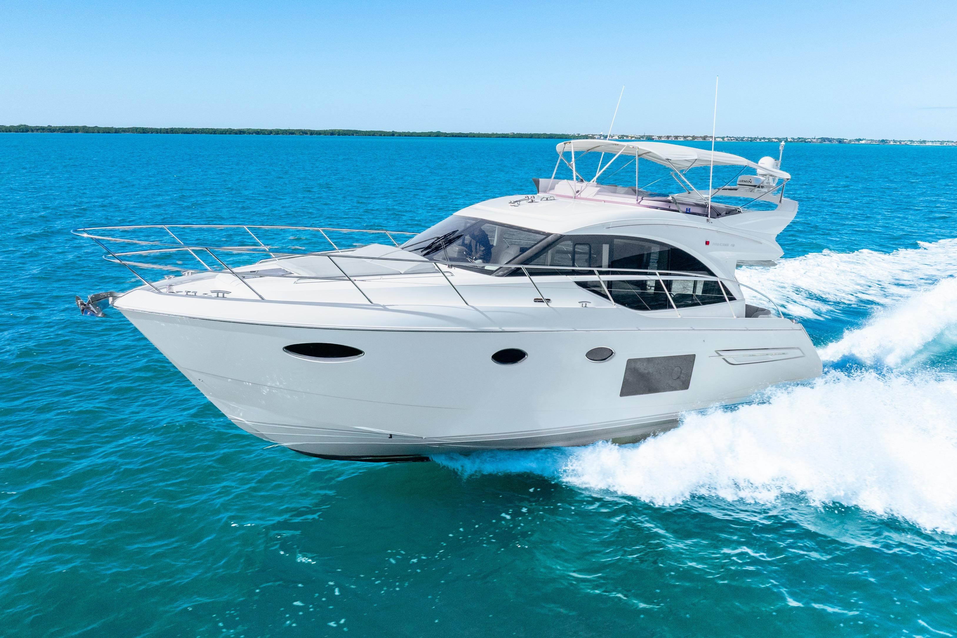 DisclaimerCutting through the waves at speeds up to 35 knots or cruising at a highly economical 30 knots, the new Princess 49 promises to be sublimely enjoyable. She combines the latest IPS pod drive system with a new modified deep-V hull providing ease of handling and manoeuvrability. Her social flybridge arrangement enjoys a twin helm seat, convertible L-shaped sofa and generous seating aft. The spacious deck saloon comes alive with light from the panoramic windows and has an ingenious aft-galley layout which can be fitted with a full-height fridge/freezer. Below deck, there’s a full beam owner’s stateroom, a forward guest cabin with the option of scissors berths and a generous two berth starboard cabin. Quite simply, a yacht that feels like it’s in a class of its own.
