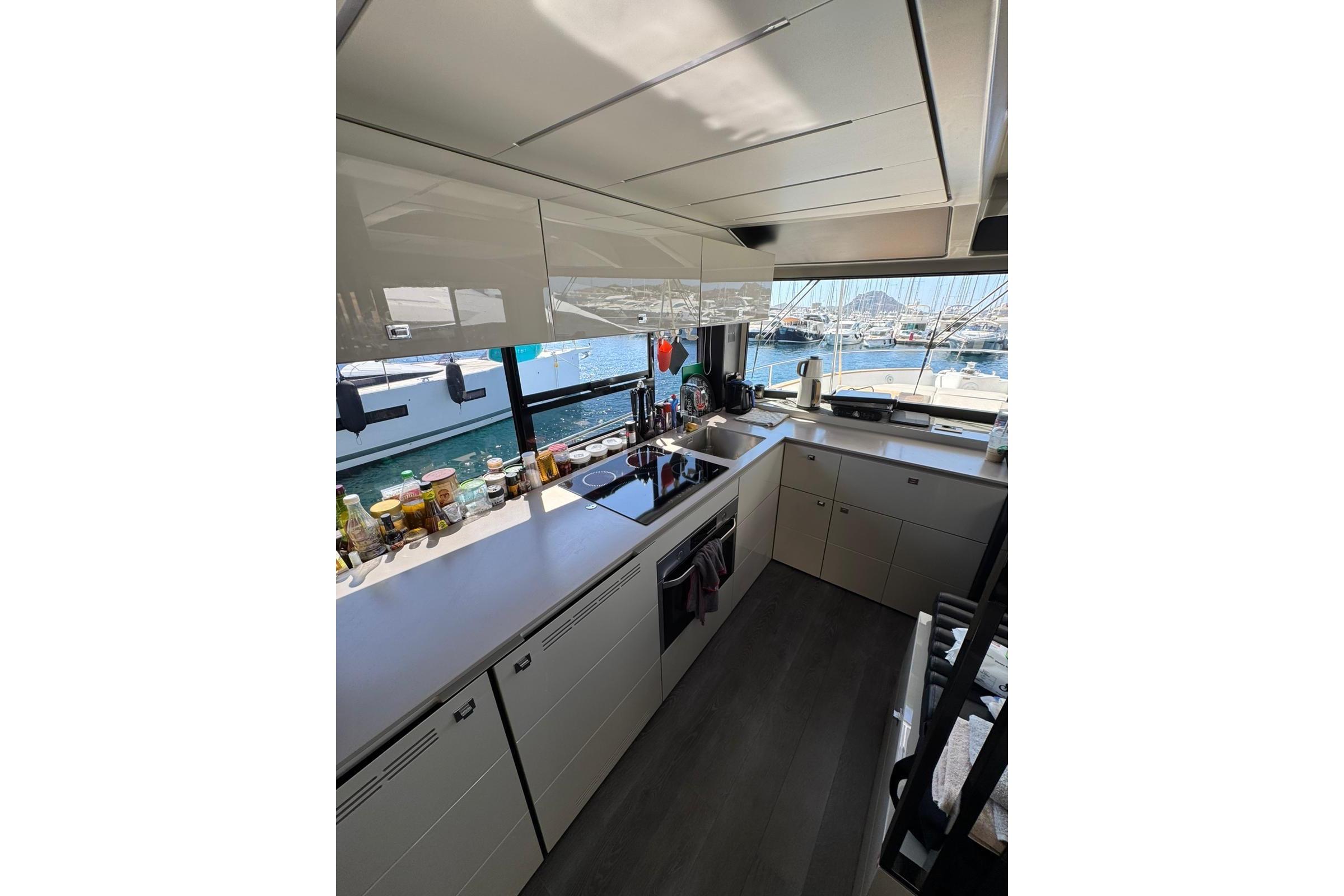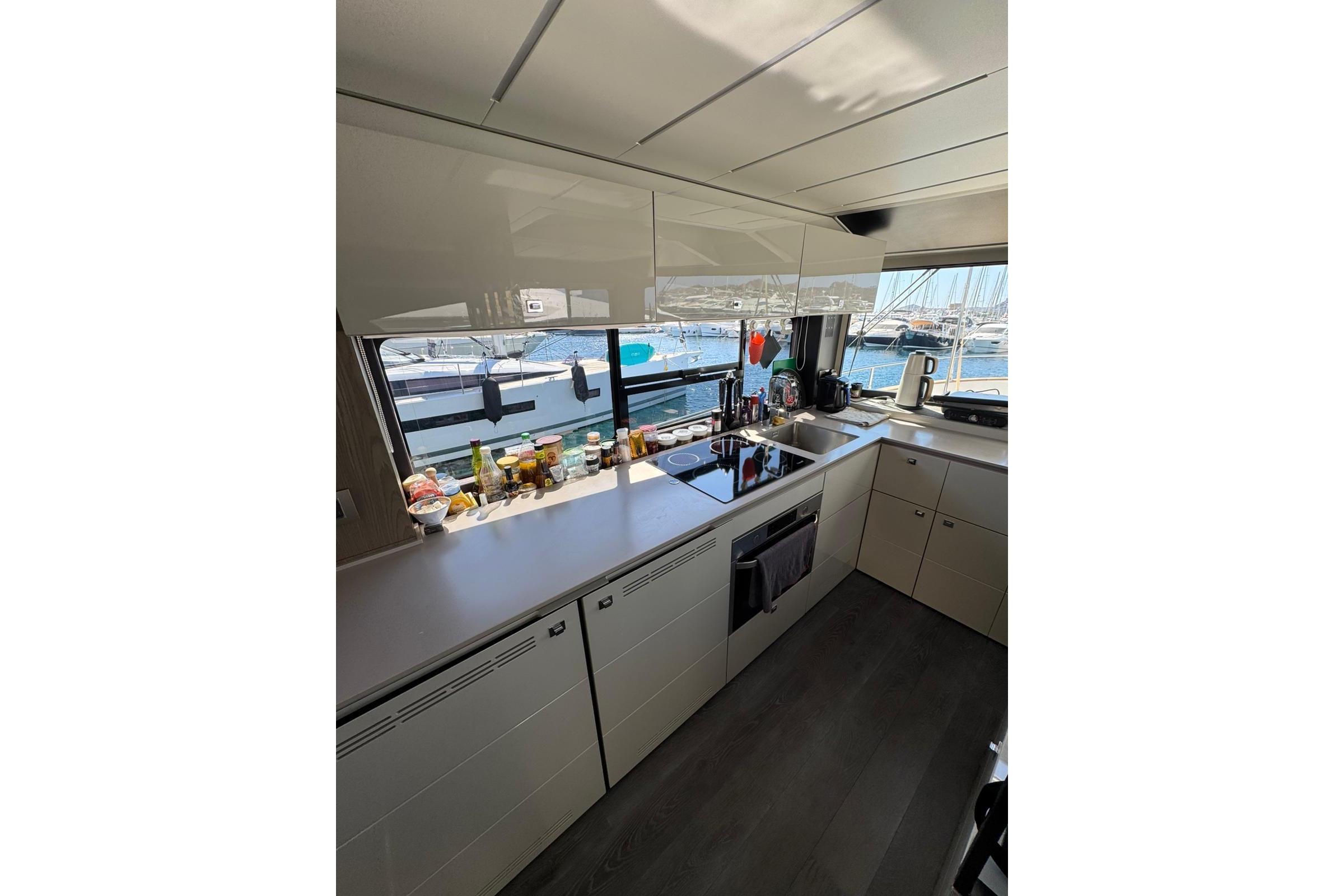 Life on board the T55 Eco Trawler ensures total comfort and freedom of movement. The Flybridge, in particular, presents a space with seemingly infinite options; equipped with a large sun deck, a spacious lounge area with a table that seats eight people and a functional bar.