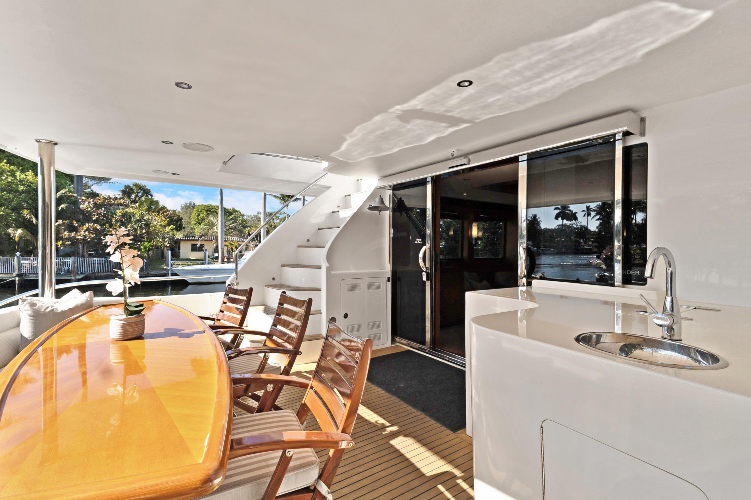 This popular motor yacht has many custom interior features throughout. Some of these features you will not find on any other 74'/78' OA. Her aft deck offers seating for eight around a large, adjustable hi-gloss finished oval teak table. In addition, there is a refrigerator under the stairs to the flybridge, a stainless steel sink and faucet, pop-up aft engines, and bow and stern thruster controls. Her covered and wide side decks offer full walk-around access to the bow area. There are sideboarding doors aft and gates forward.
