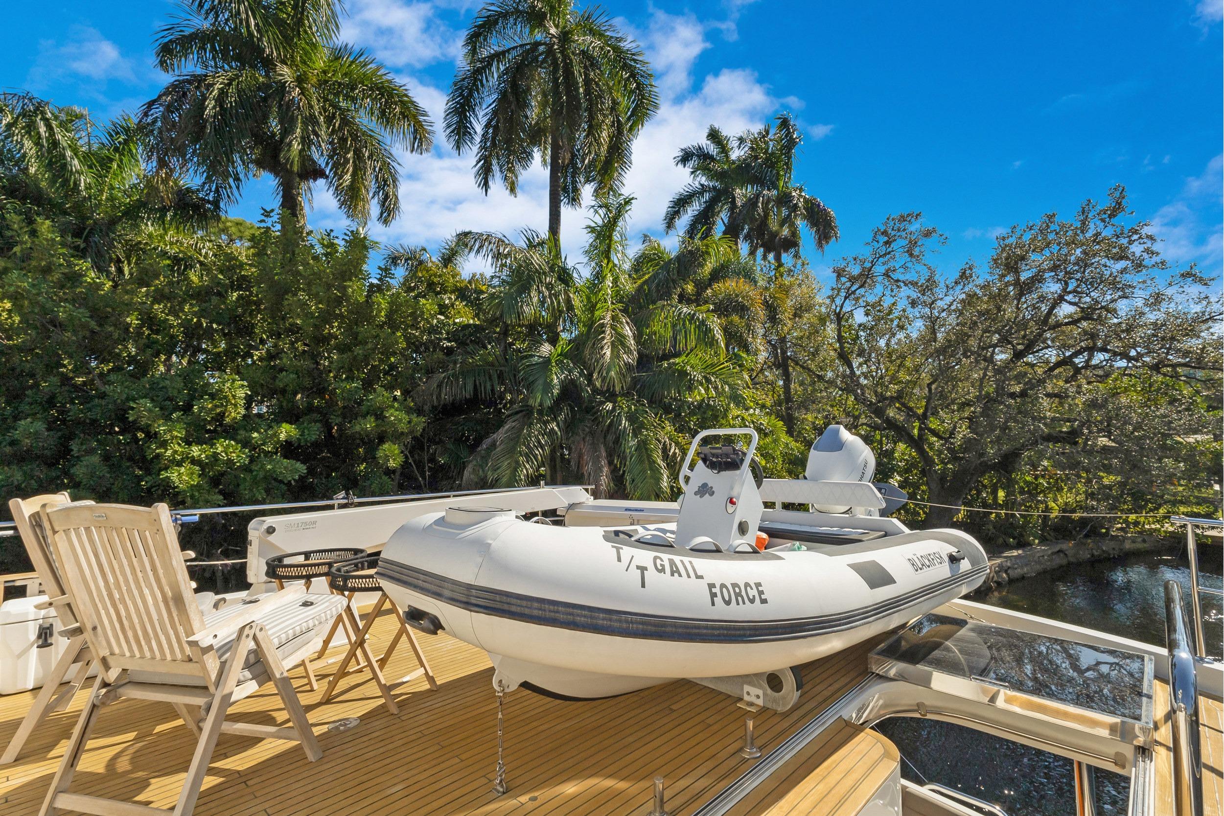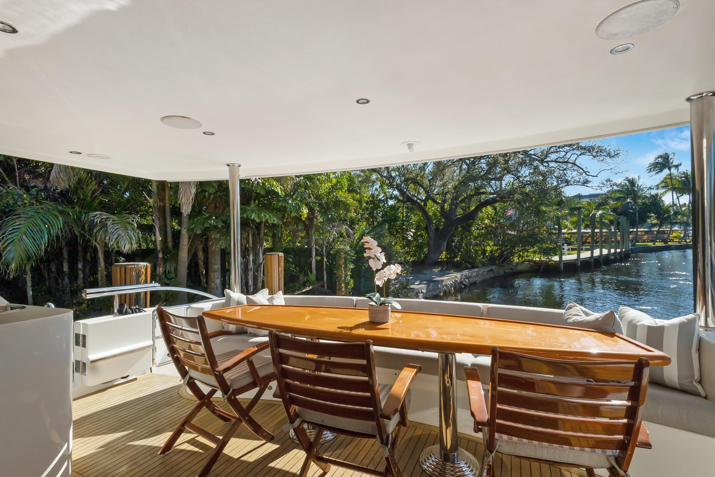 The Flybridge with hardtop can be accessed from the Galley or from the Aft Deck. She has ample Flybridge L-Shaped seating and storage with two (2) custom adjustable teak tables, and a full-function Tender Davit.