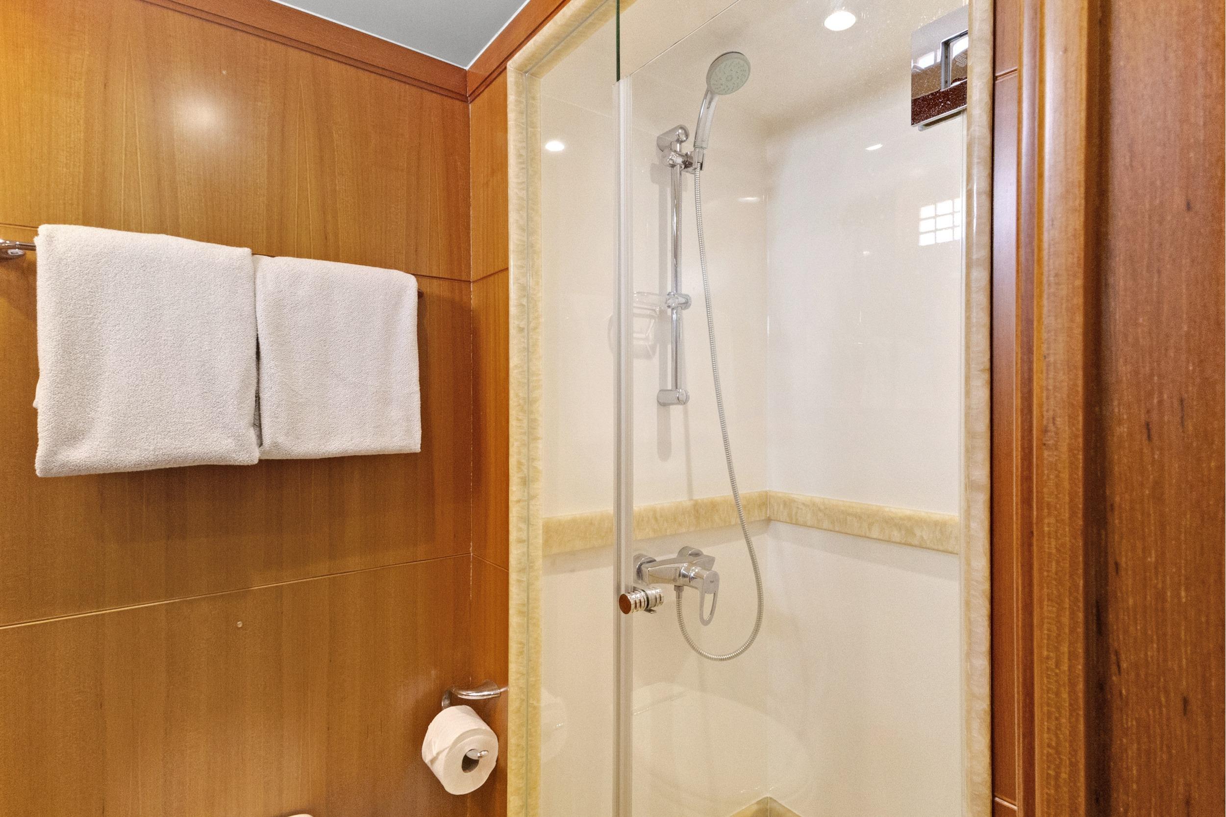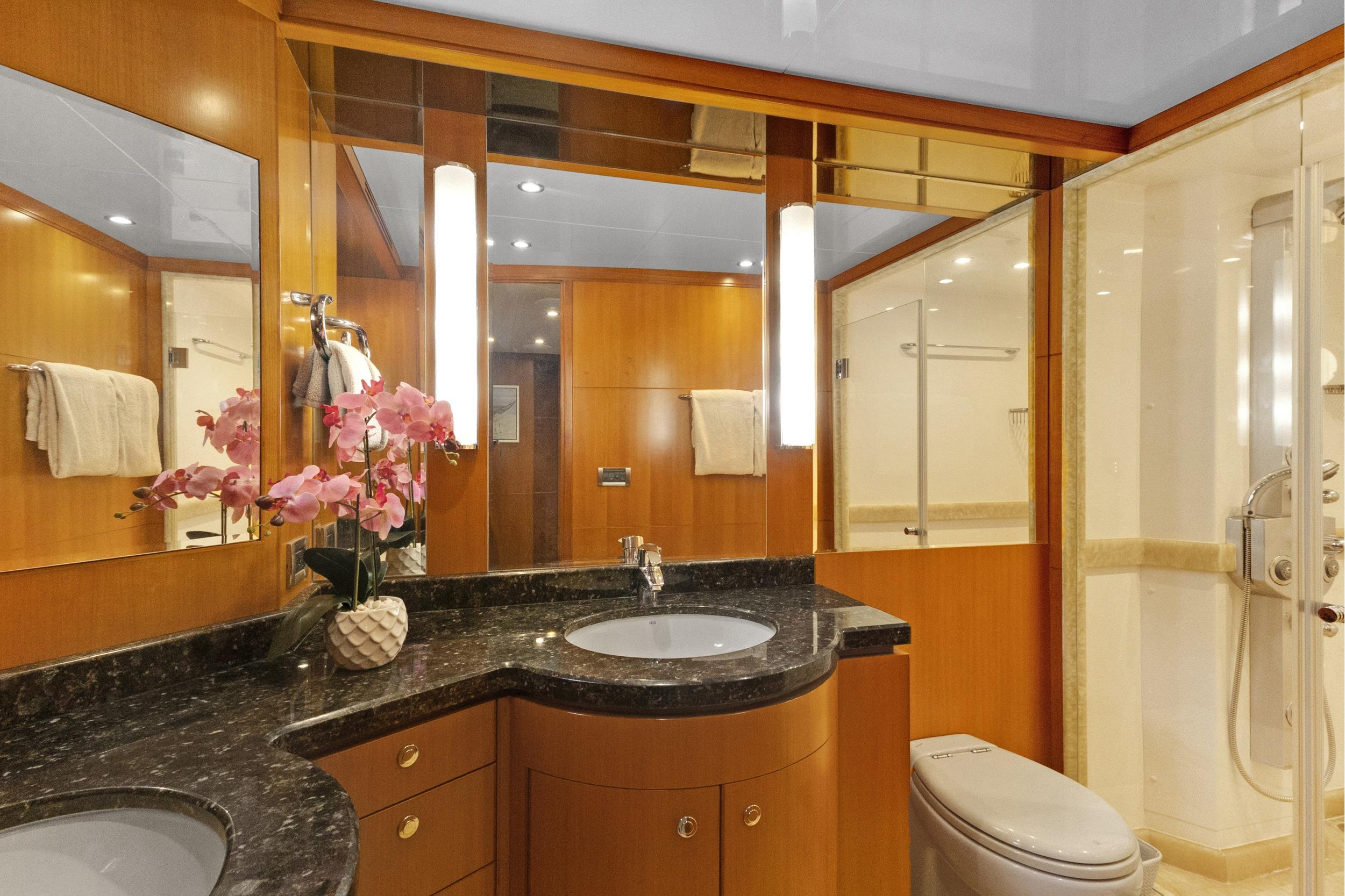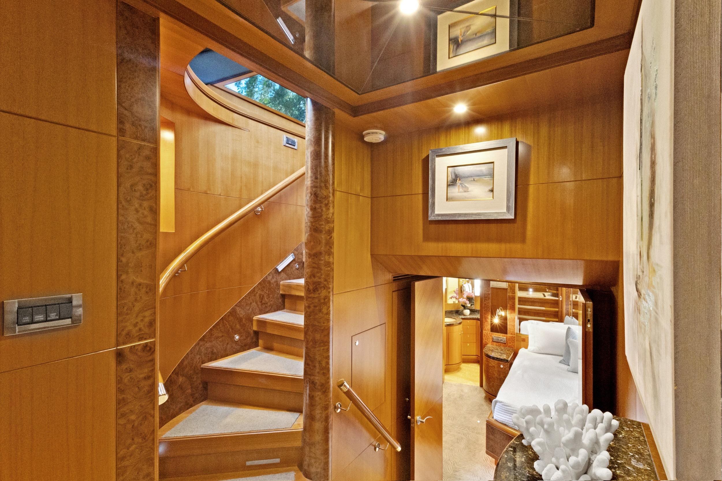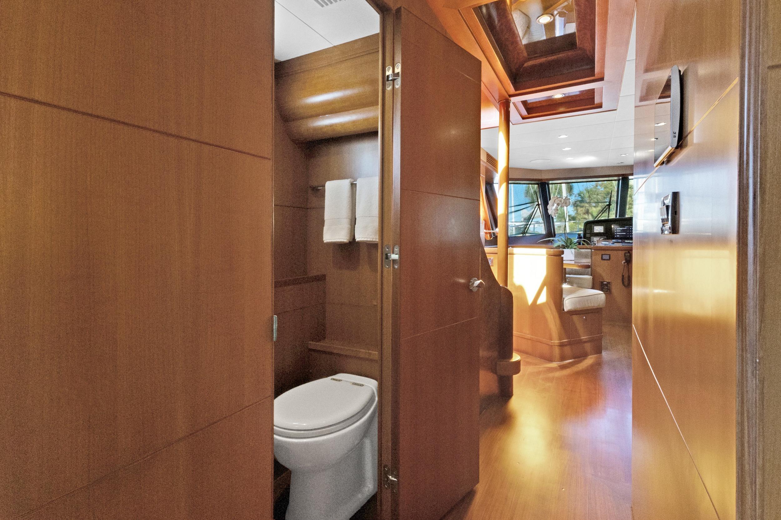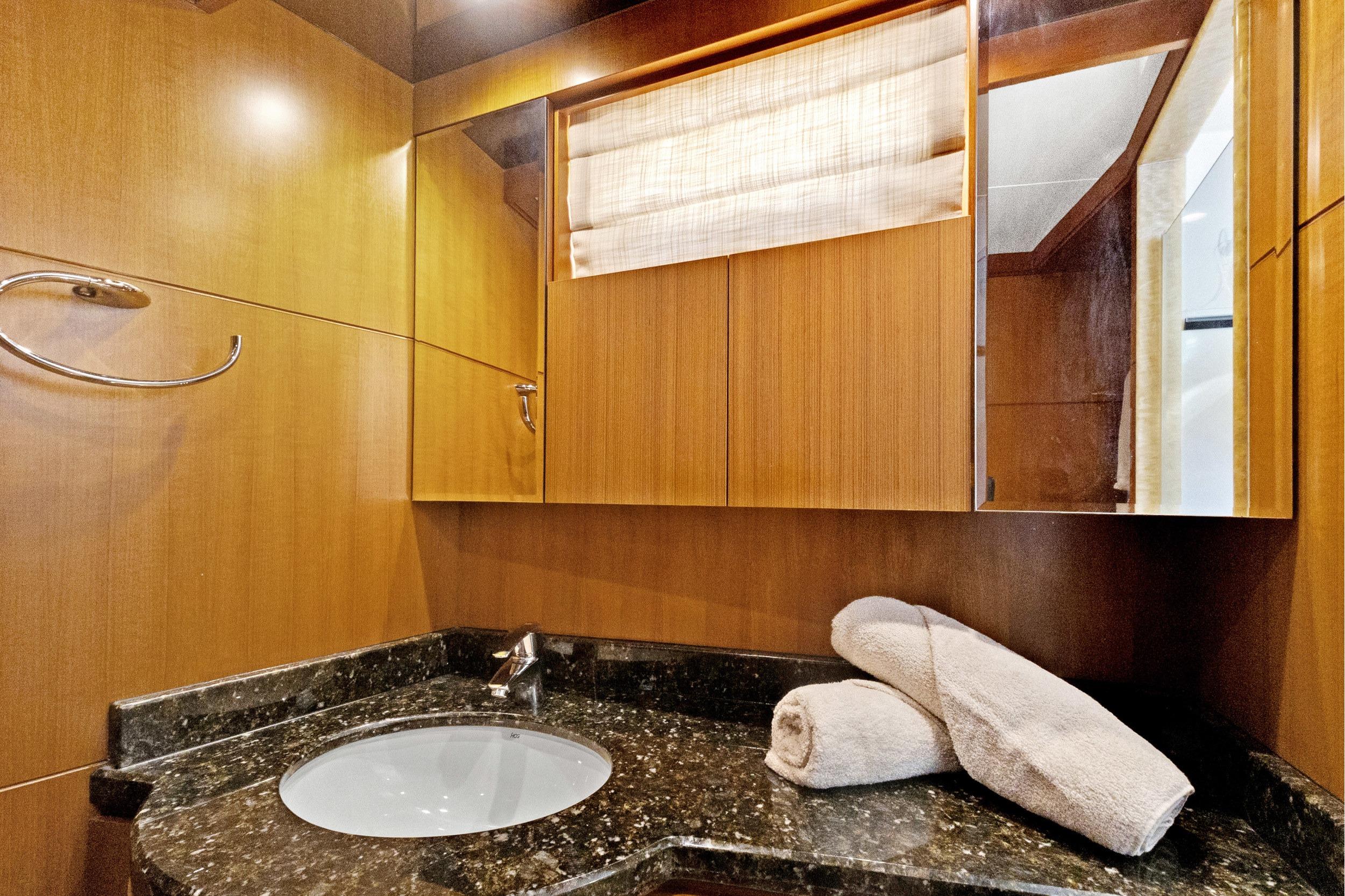Before you enter the Master Stateroom, there is a large washer and dryer on your left side. Access to the Master Stateroom is through double doors. The full-beam Master offers a king-size berth with storage and nightstands. There is a large cedar-lined walk-in closet with shelving and a safe to your port side. This Master offers a full entertainment system, an additional closet, and a chest of drawers located on both port and starboard sides. Her VIP and Guest Staterooms have en-suite full heads with granite flooring. Access to the crew for two (2) is from the Aft Deck or from the transom. The Crew Quarters offer a head with a separate shower, refrigerator, microwave oven, TV, and audio. Her Engine Room is behind a water-tight door.