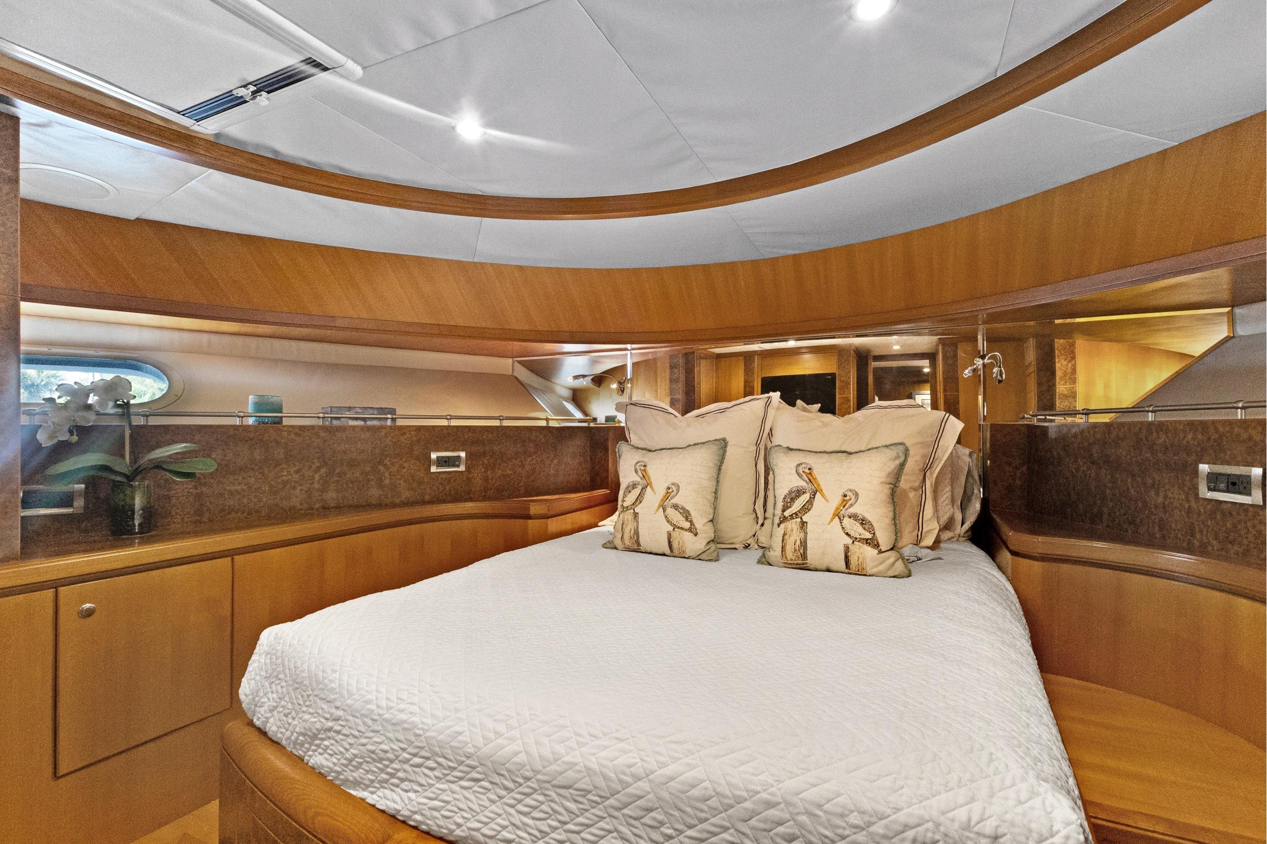 - Mid-ship Master Stateroom with king-sized berth and en-suite head, hanging locker, walk-in closet, and wall-mounted Sony HDTV with Denon DVD Player