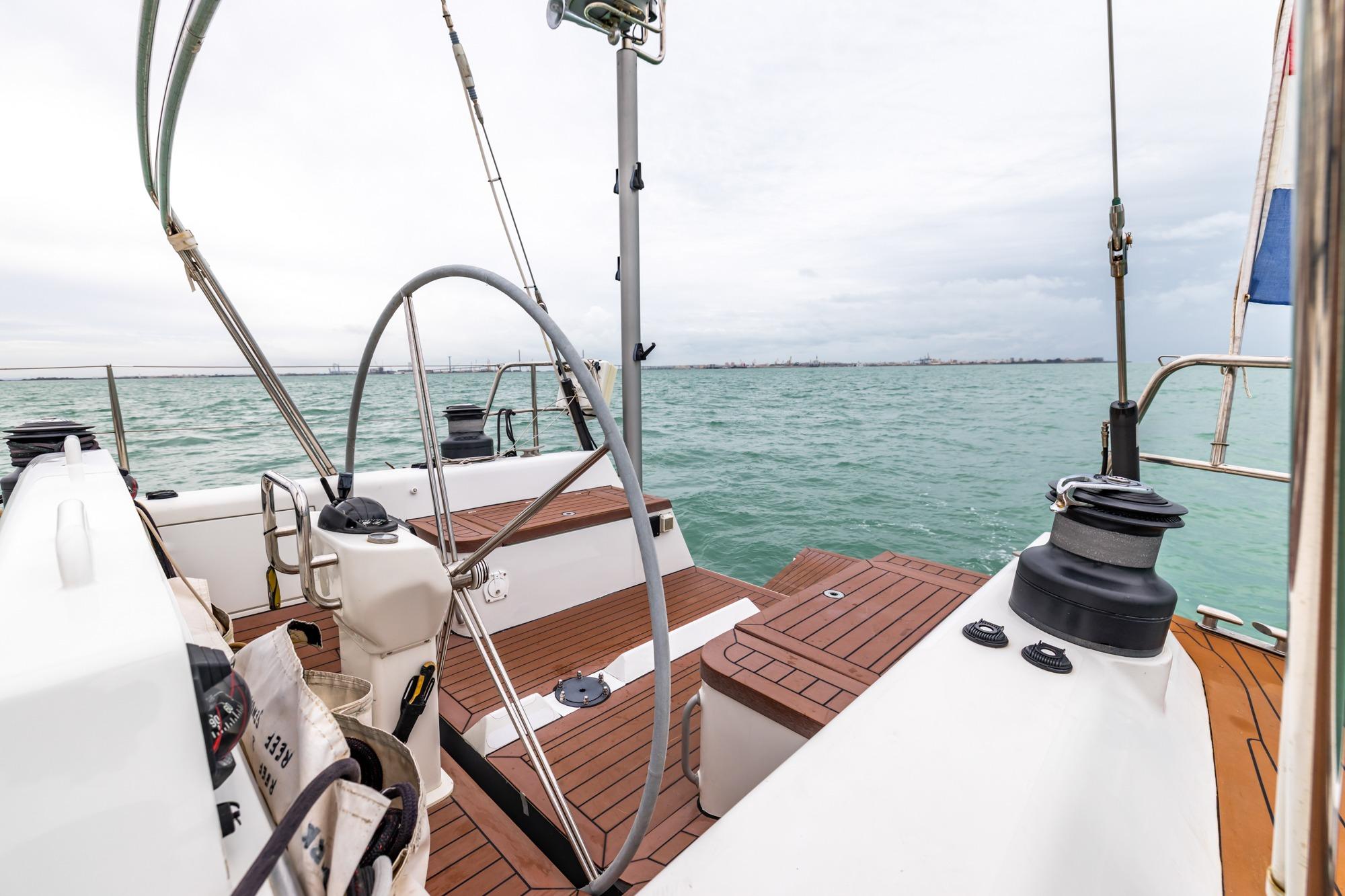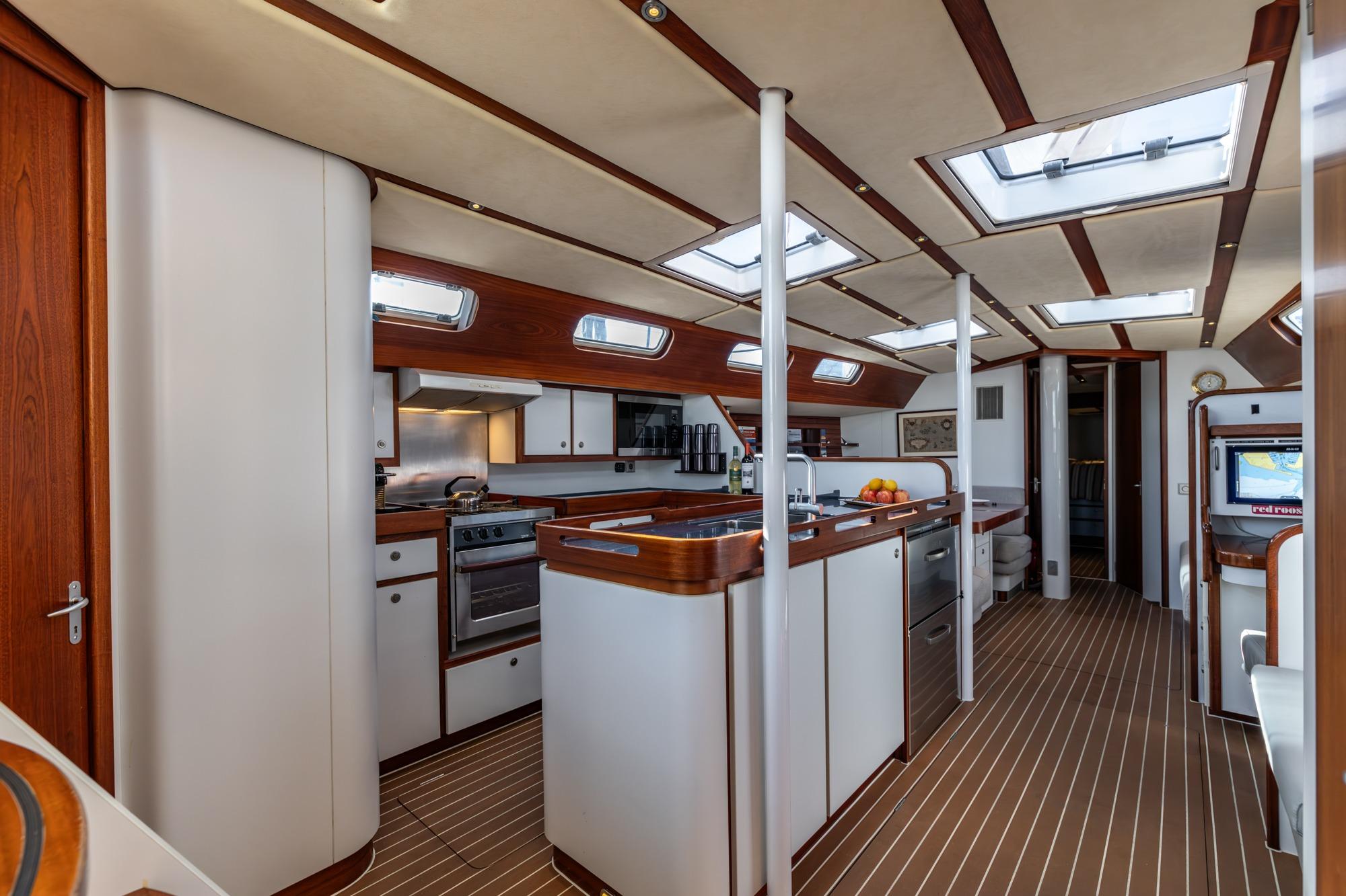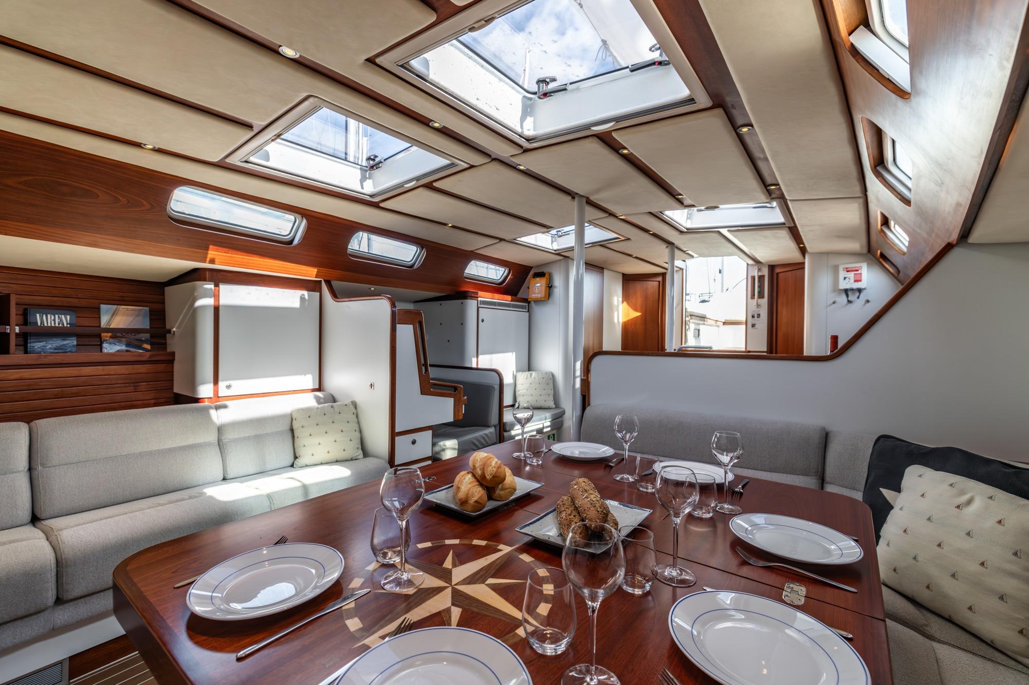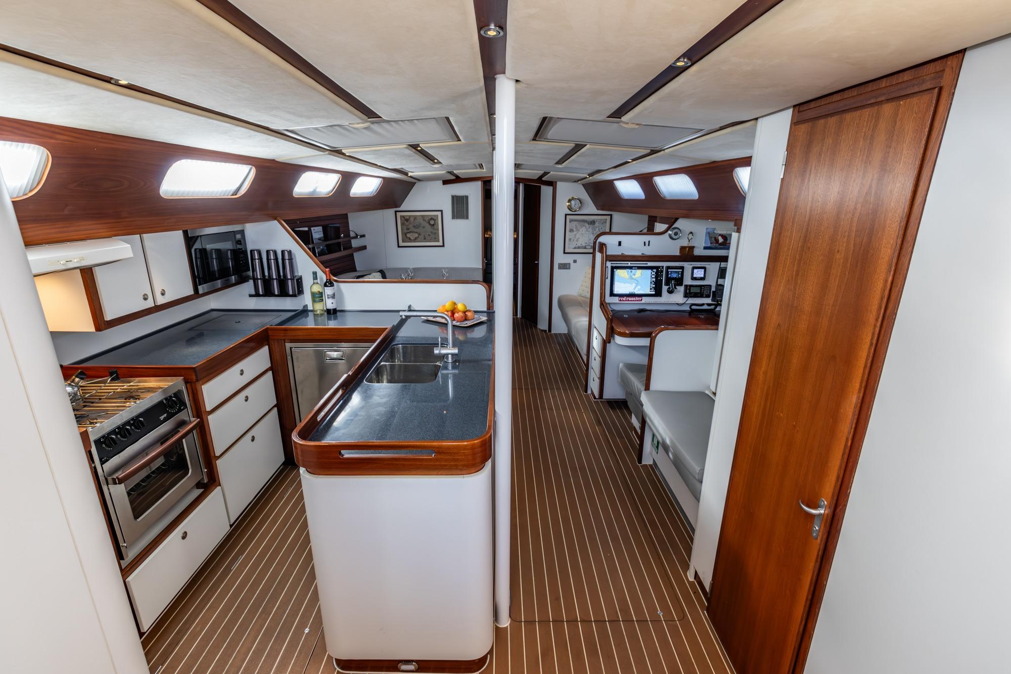 Her distinctive twin-cockpit layout features a dedicated working cockpit for efficient sailing and a well-protected cockpit under the doghouse for relaxed cruising. The deck is finished with new synthetic Ecodeck (installed 2018), combining a modern look with low maintenance.