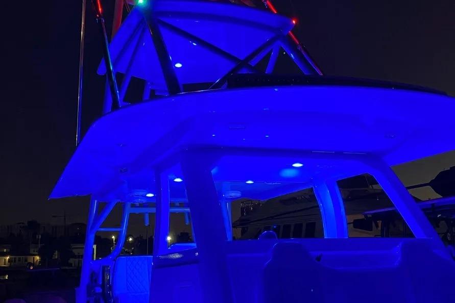 A full Custom Pipe Design gap tower sets this build apart, providing elevated visibility and expanded fishability. At the helm, dual 24” Simrad displays anchor a top-tier electronics package, with Starlink ensuring offshore connectivity. Release Marine seats, premium finishes, and a wide, open deck plan make long days on the water comfortable for crew and anglers alike.