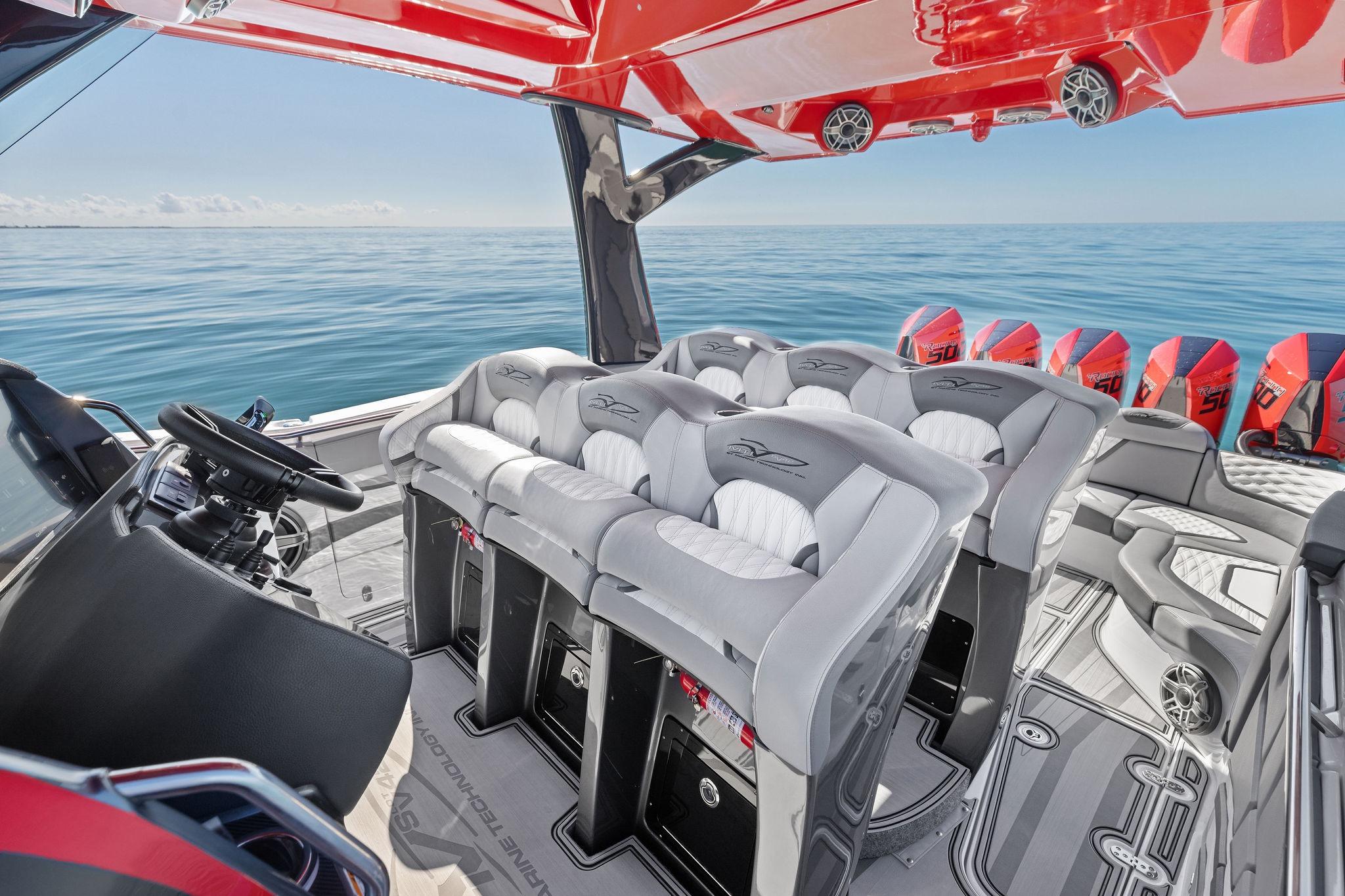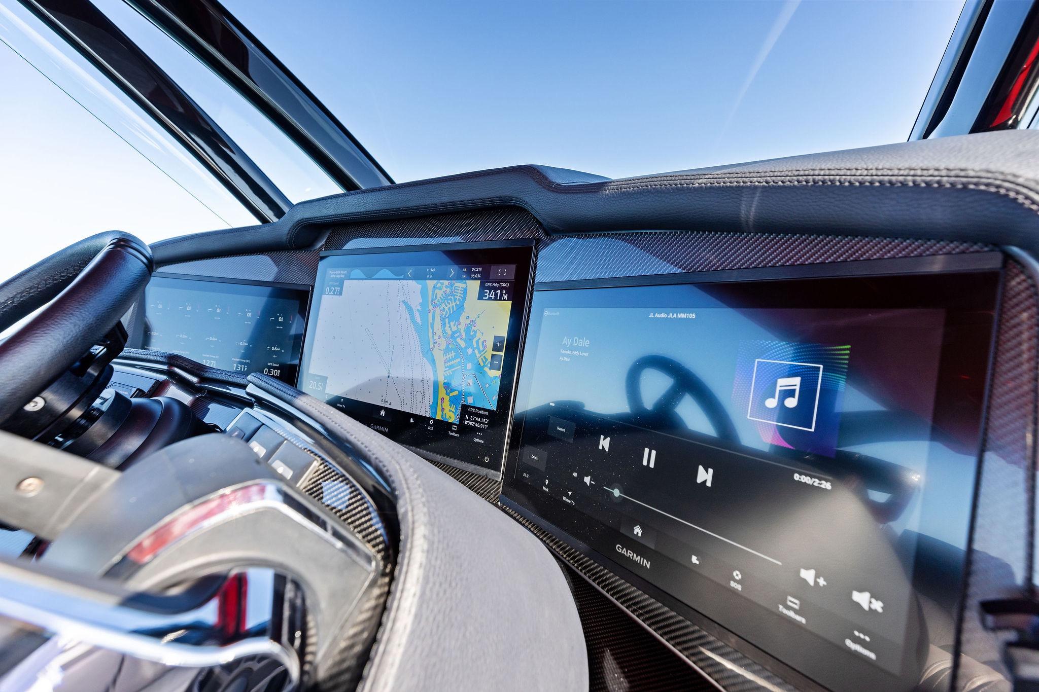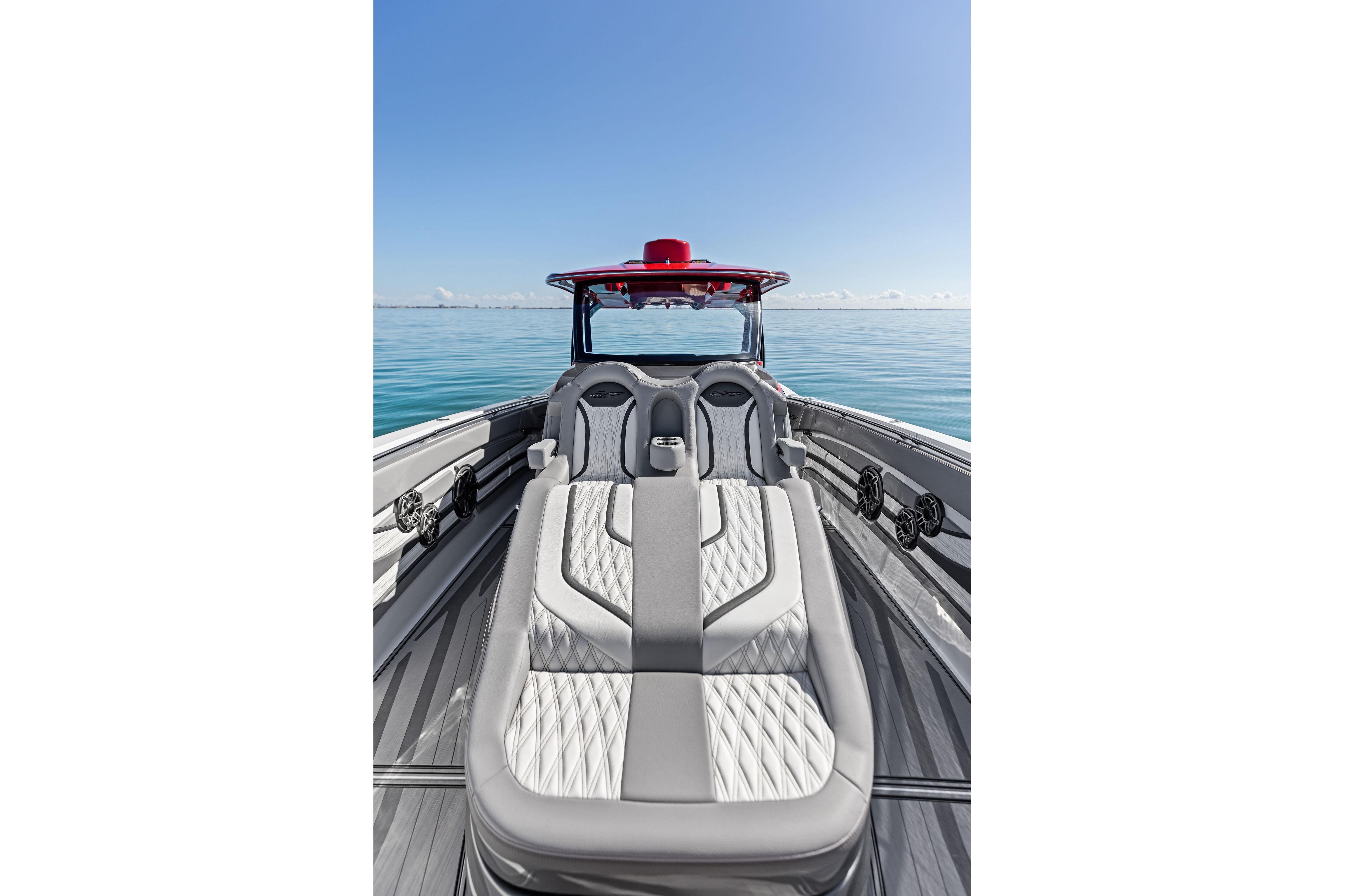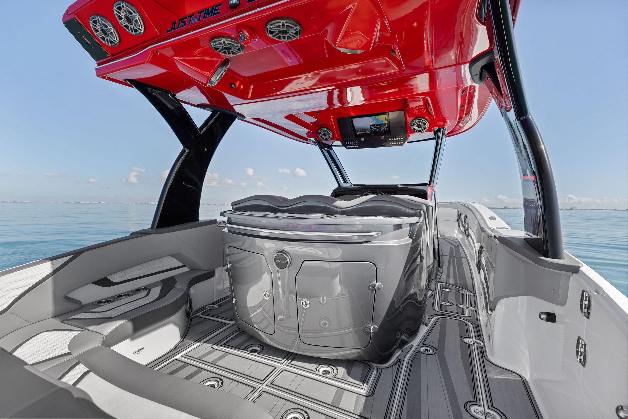 Colored Gel Coat Bottom. Stage 2 Paint job. Custom Painted Engine Body Panels. Cool Touch interior. SeaDek flooring. Cockpit Cooler and Storage. Chill Plate. Forward and Rear Shades. Stern Thruster. Full Boat Cover. Garmin 22 in center and Garmin 17’s on the sides. Garmin 22 above the helm. VHF Radio. 18-inch Garmin Radar Dome. Wireless Cellphone Charger on Dash. Stereo Stage 3. Wing Speakers. Bow Pop Up Speakers. Rear View Camera. GPS Tracking. Refrigerator in Cabin. SeaKeeper. Inverter with additional house batteries and Air Conditioning in Cabin. Large Aluminum Cleats. Bow Table with filler cushion for sun pad (table drops to floor). Helm Riser Pad. Single Point Engine Flush.