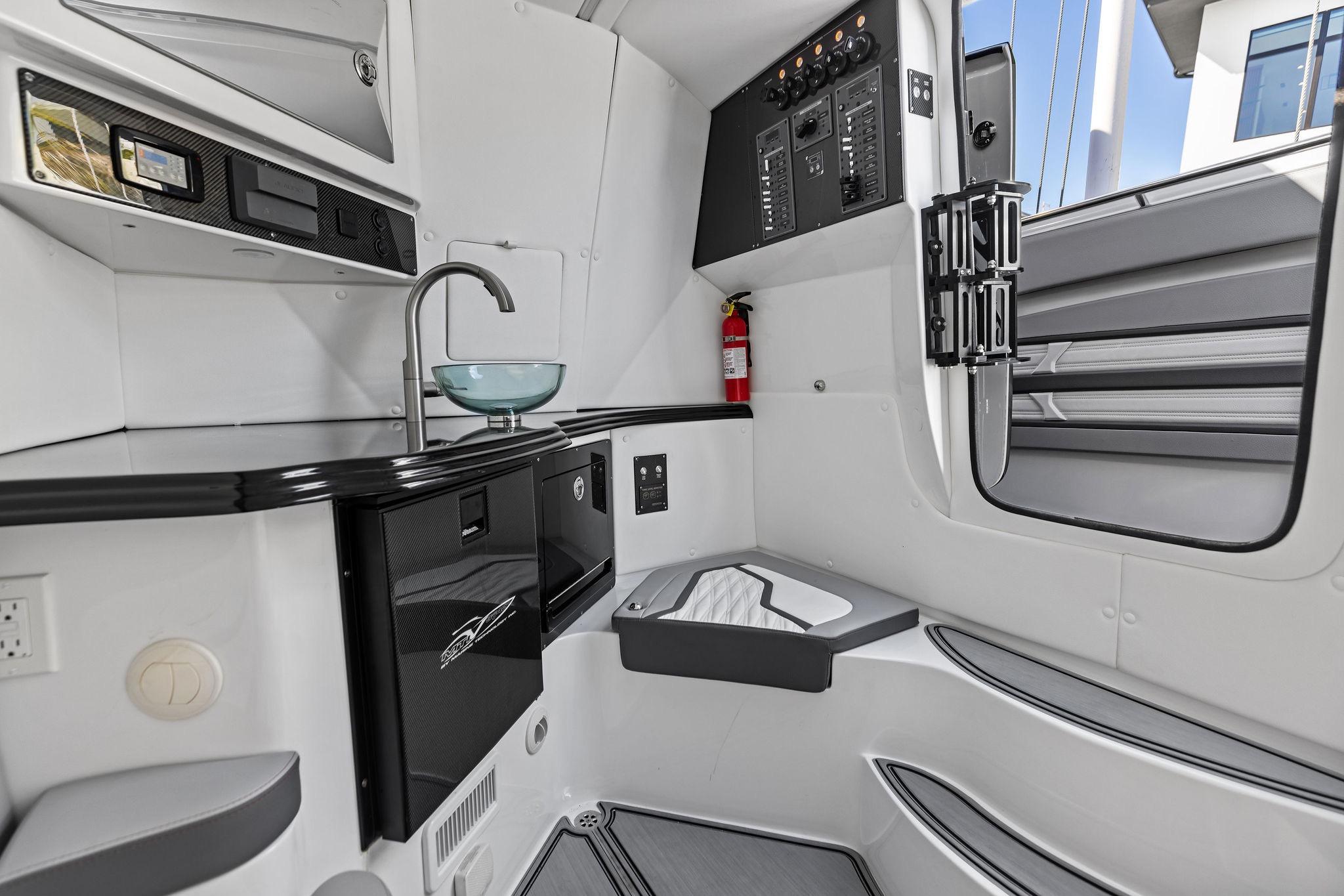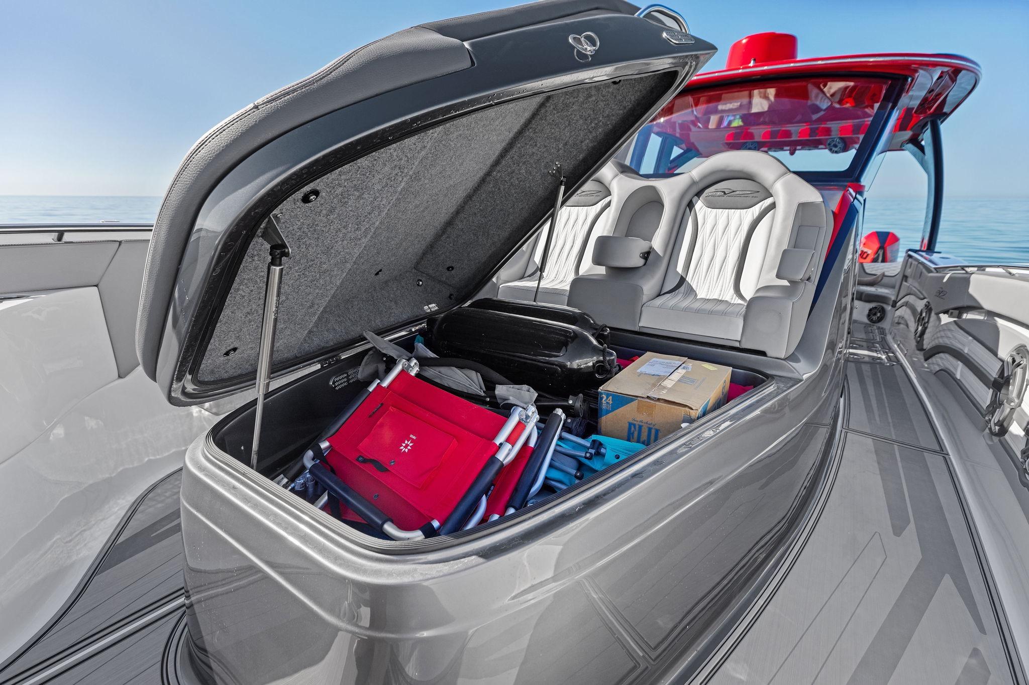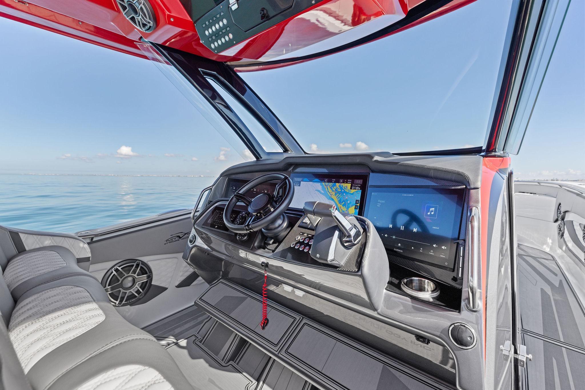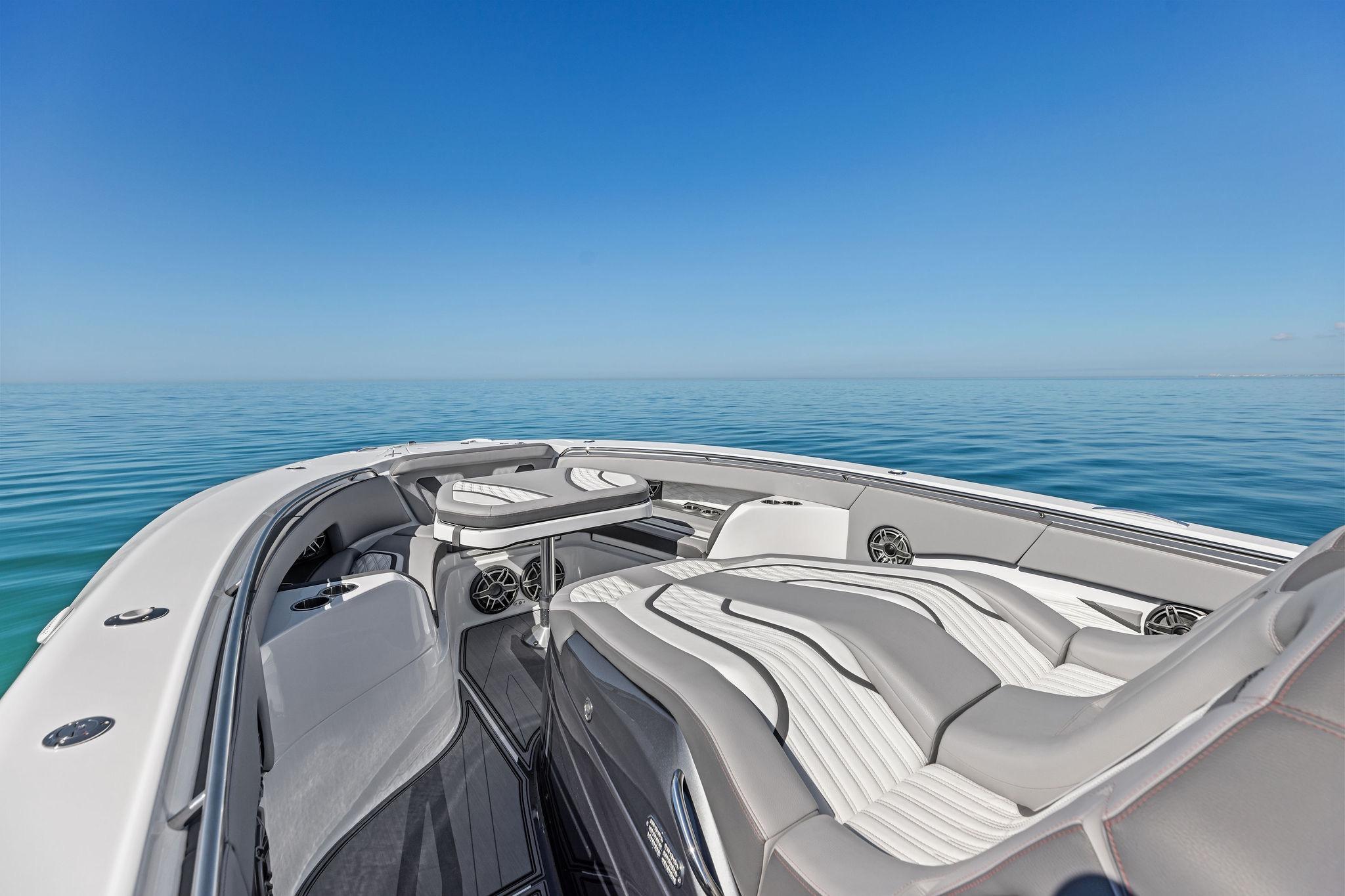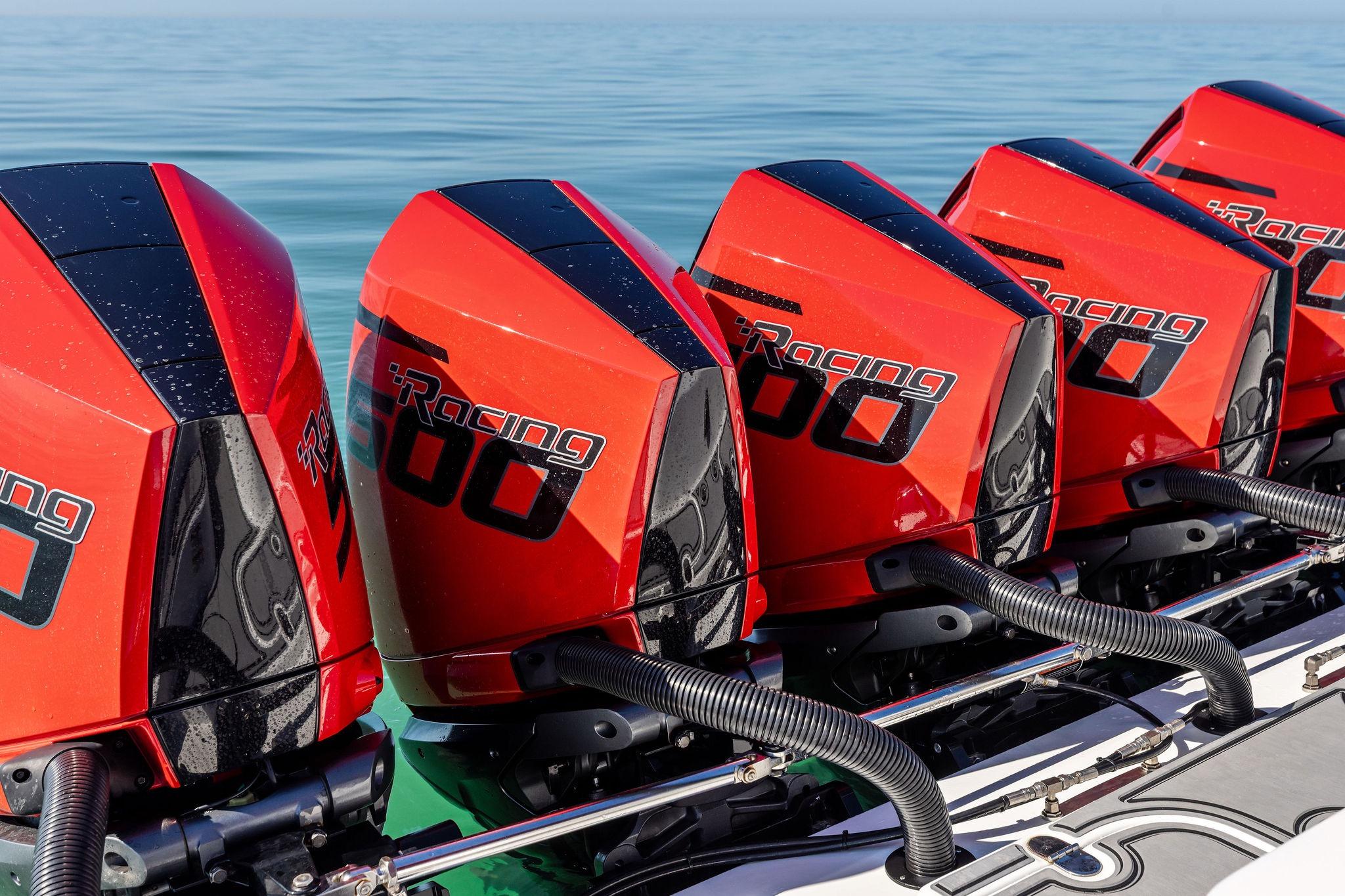Colored Gel Coat Bottom. Stage 2 Paint job. Custom Painted Engine Body Panels. Cool Touch interior. SeaDek flooring. Cockpit Cooler and Storage. Chill Plate. Forward and Rear Shades. Stern Thruster. Full Boat Cover. Garmin 22 in center and Garmin 17’s on the sides. Garmin 22 above the helm. VHF Radio. 18-inch Garmin Radar Dome. Wireless Cellphone Charger on Dash. Stereo Stage 3. Wing Speakers. Bow Pop Up Speakers. Rear View Camera. GPS Tracking. Refrigerator in Cabin. SeaKeeper. Inverter with additional house batteries and Air Conditioning in Cabin. Large Aluminum Cleats. Bow Table with filler cushion for sun pad (table drops to floor). Helm Riser Pad. Single Point Engine Flush.