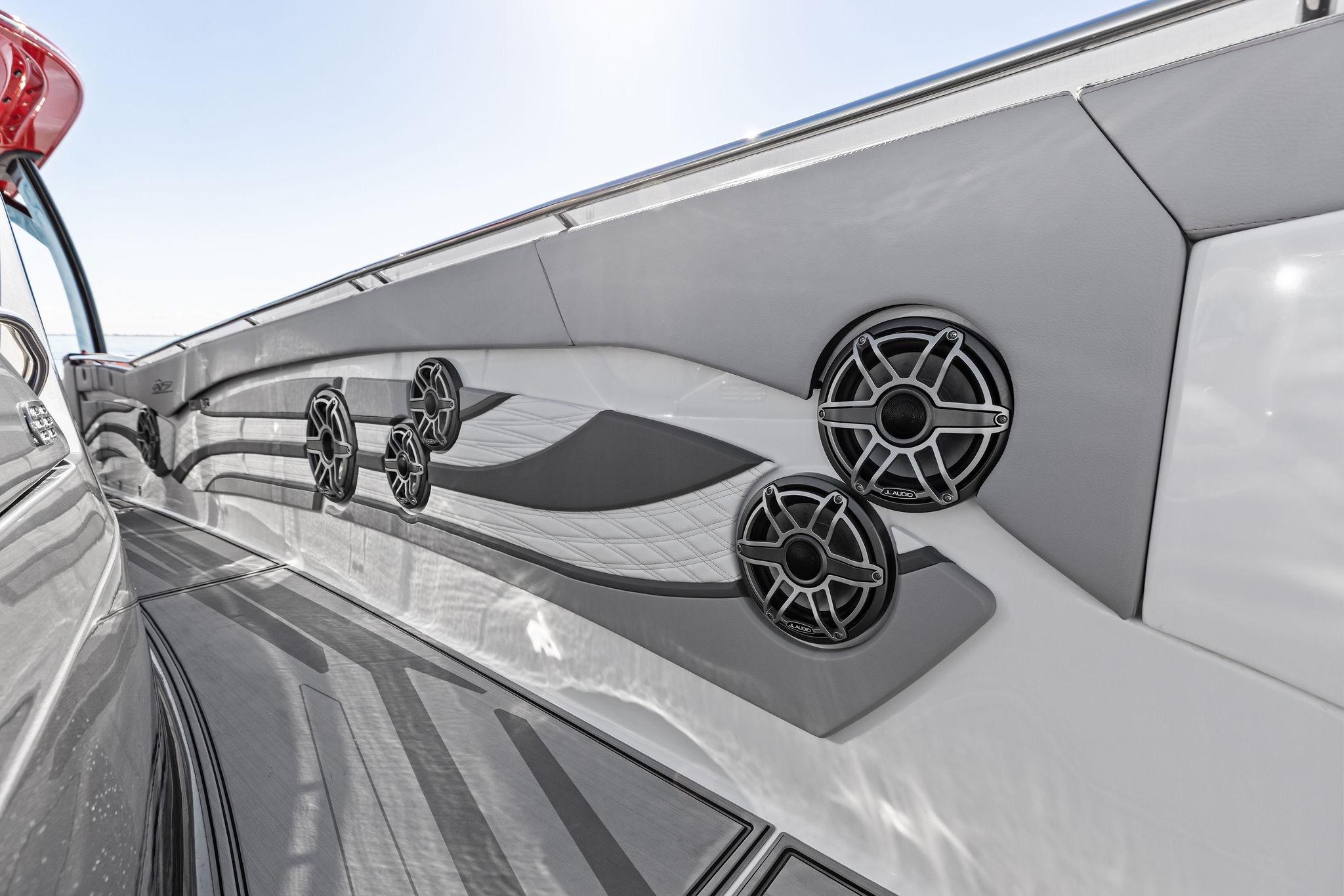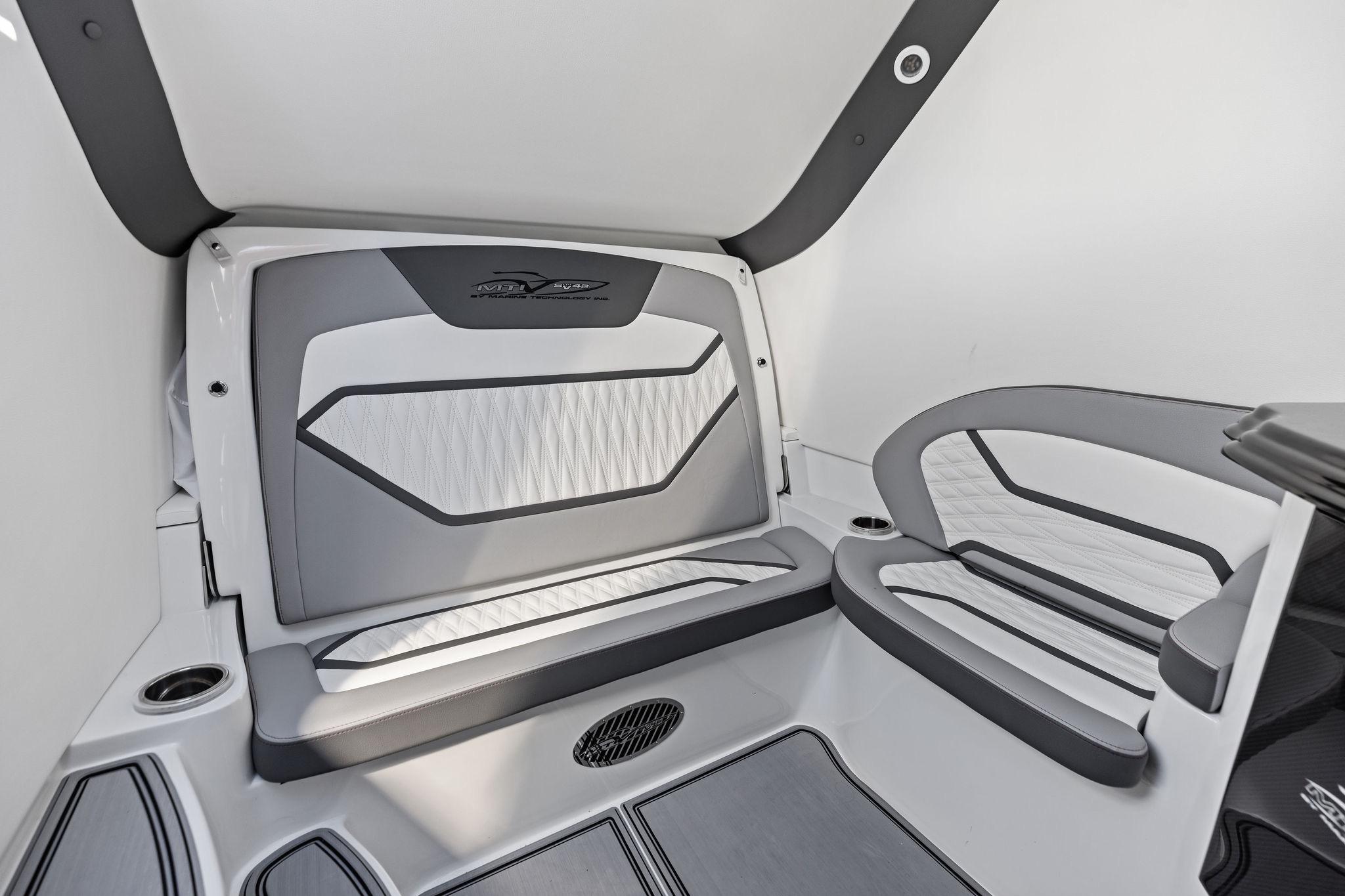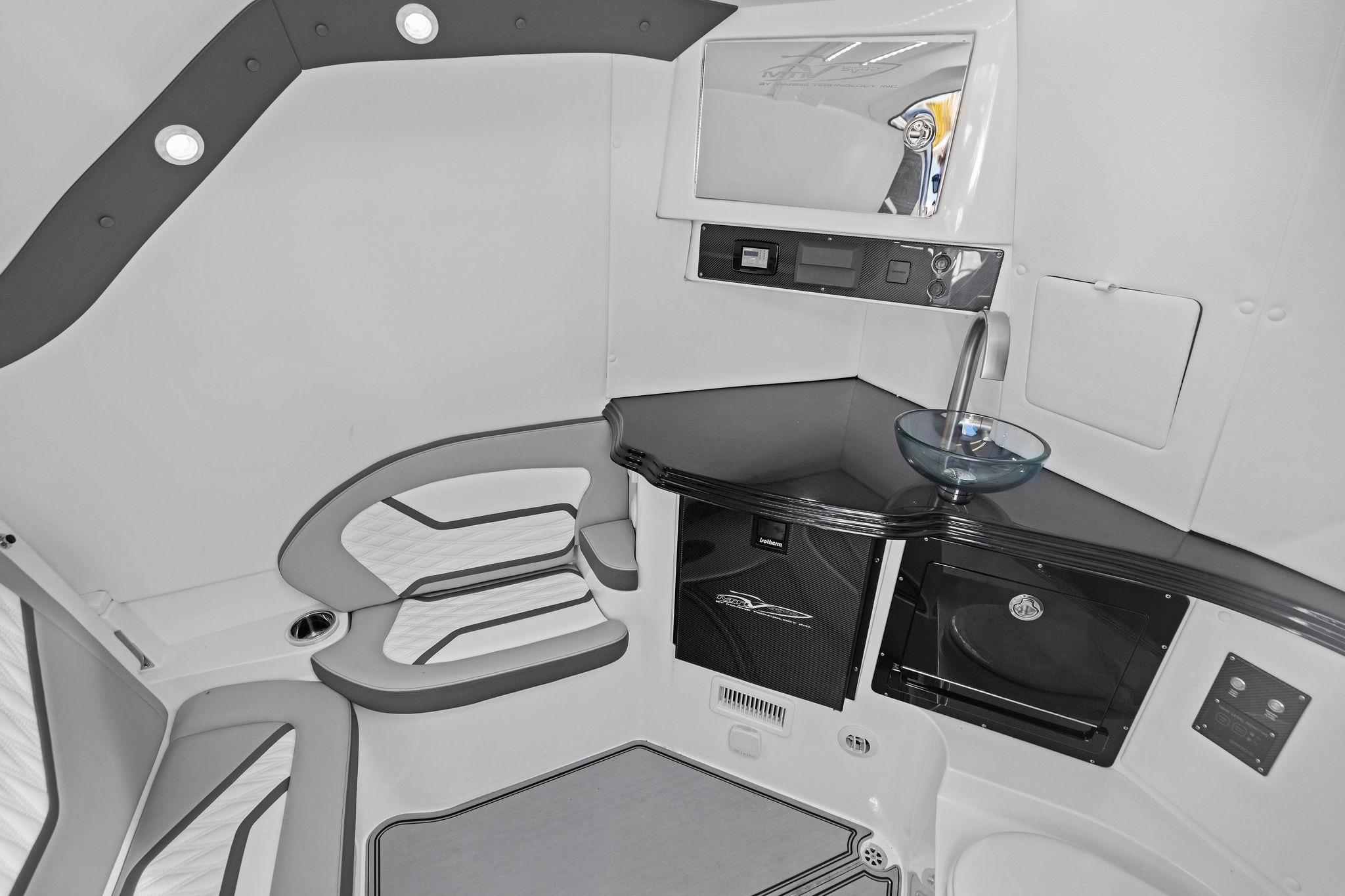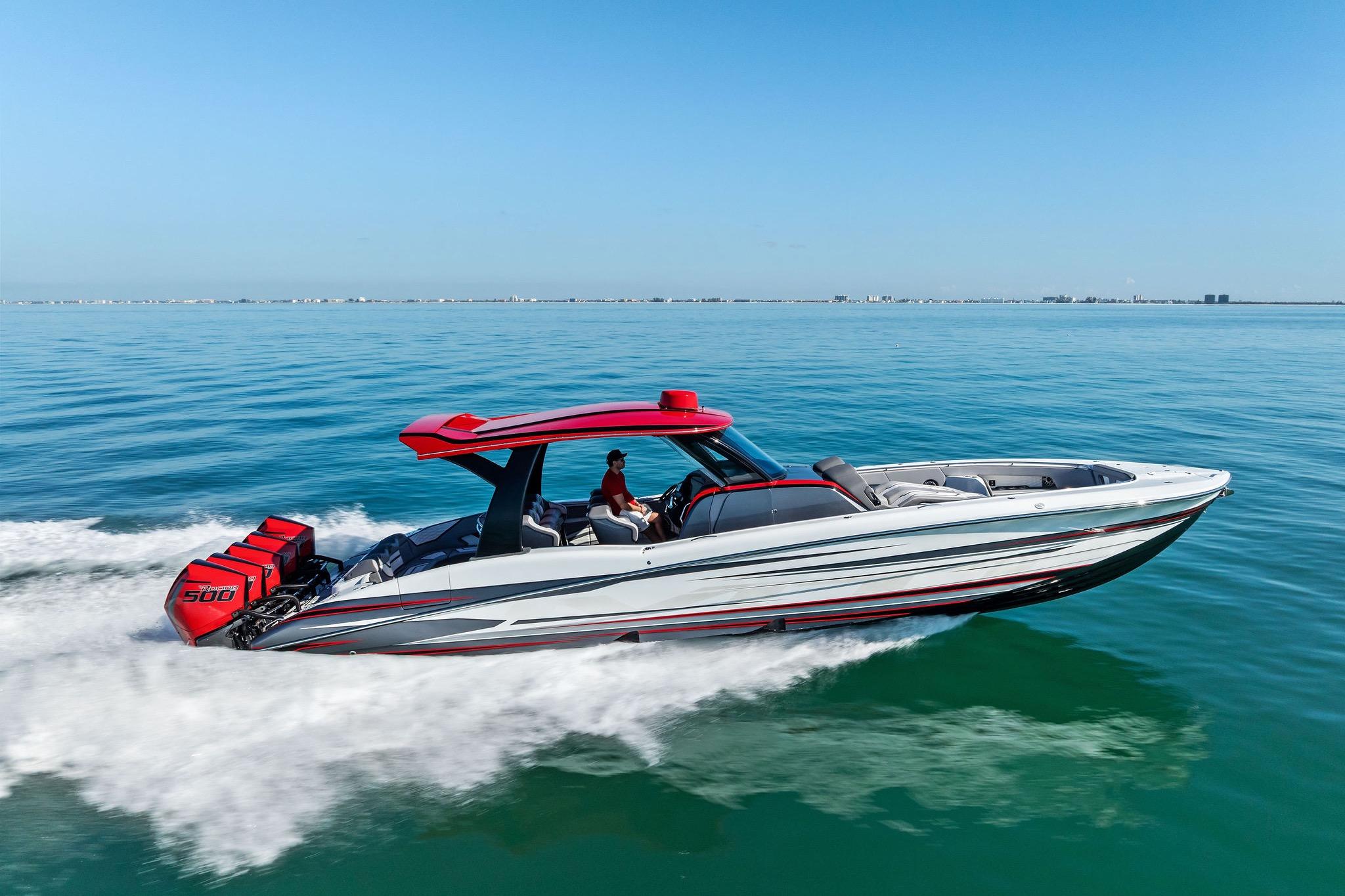 Colored Gel Coat Bottom. Stage 2 Paint job. Custom Painted Engine Body Panels. Cool Touch interior. SeaDek flooring. Cockpit Cooler and Storage. Chill Plate. Forward and Rear Shades. Stern Thruster. Full Boat Cover. Garmin 22 in center and Garmin 17’s on the sides. Garmin 22 above the helm. VHF Radio. 18-inch Garmin Radar Dome. Wireless Cellphone Charger on Dash. Stereo Stage 3. Wing Speakers. Bow Pop Up Speakers. Rear View Camera. GPS Tracking. Refrigerator in Cabin. SeaKeeper. Inverter with additional house batteries and Air Conditioning in Cabin. Large Aluminum Cleats. Bow Table with filler cushion for sun pad (table drops to floor). Helm Riser Pad. Single Point Engine Flush.