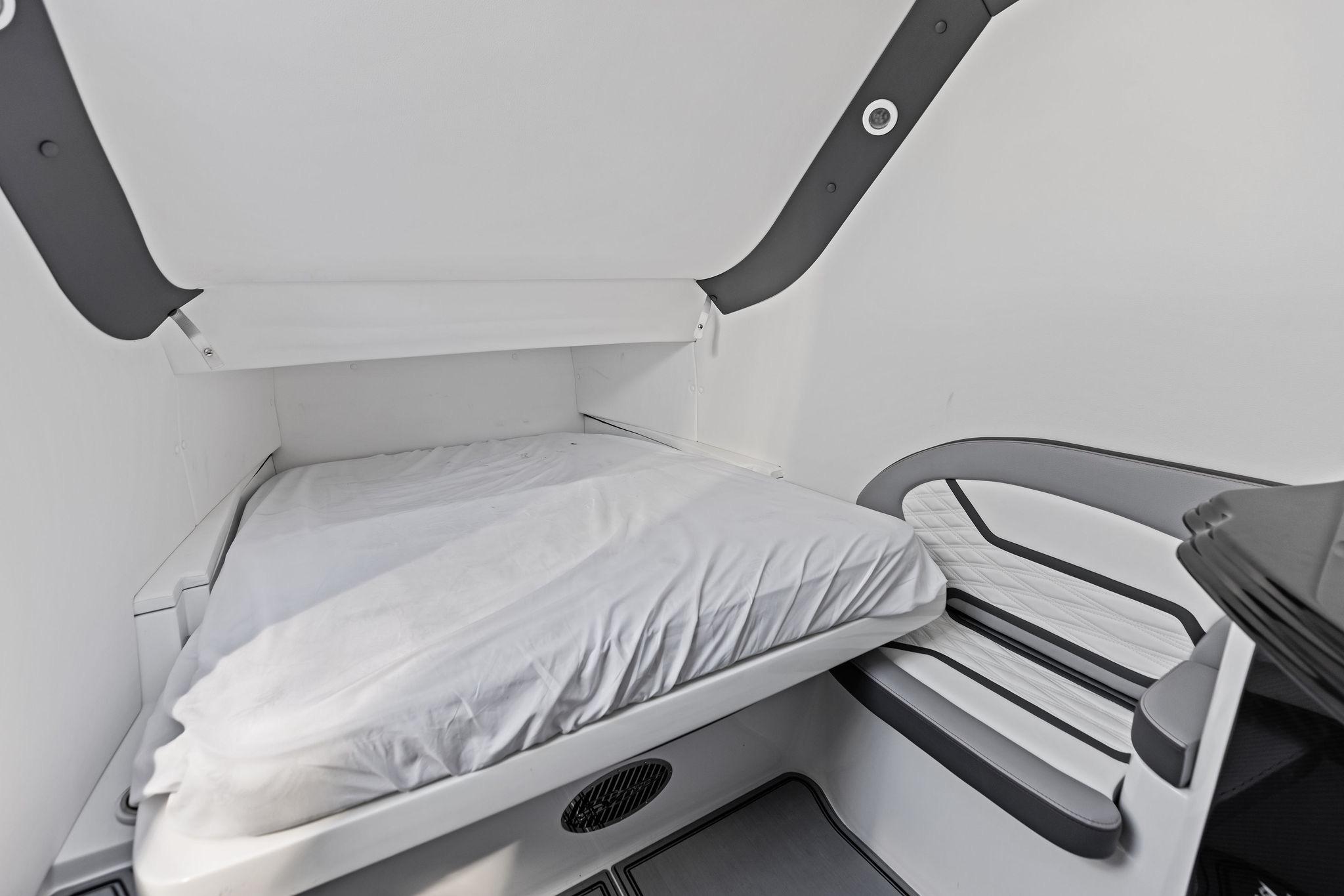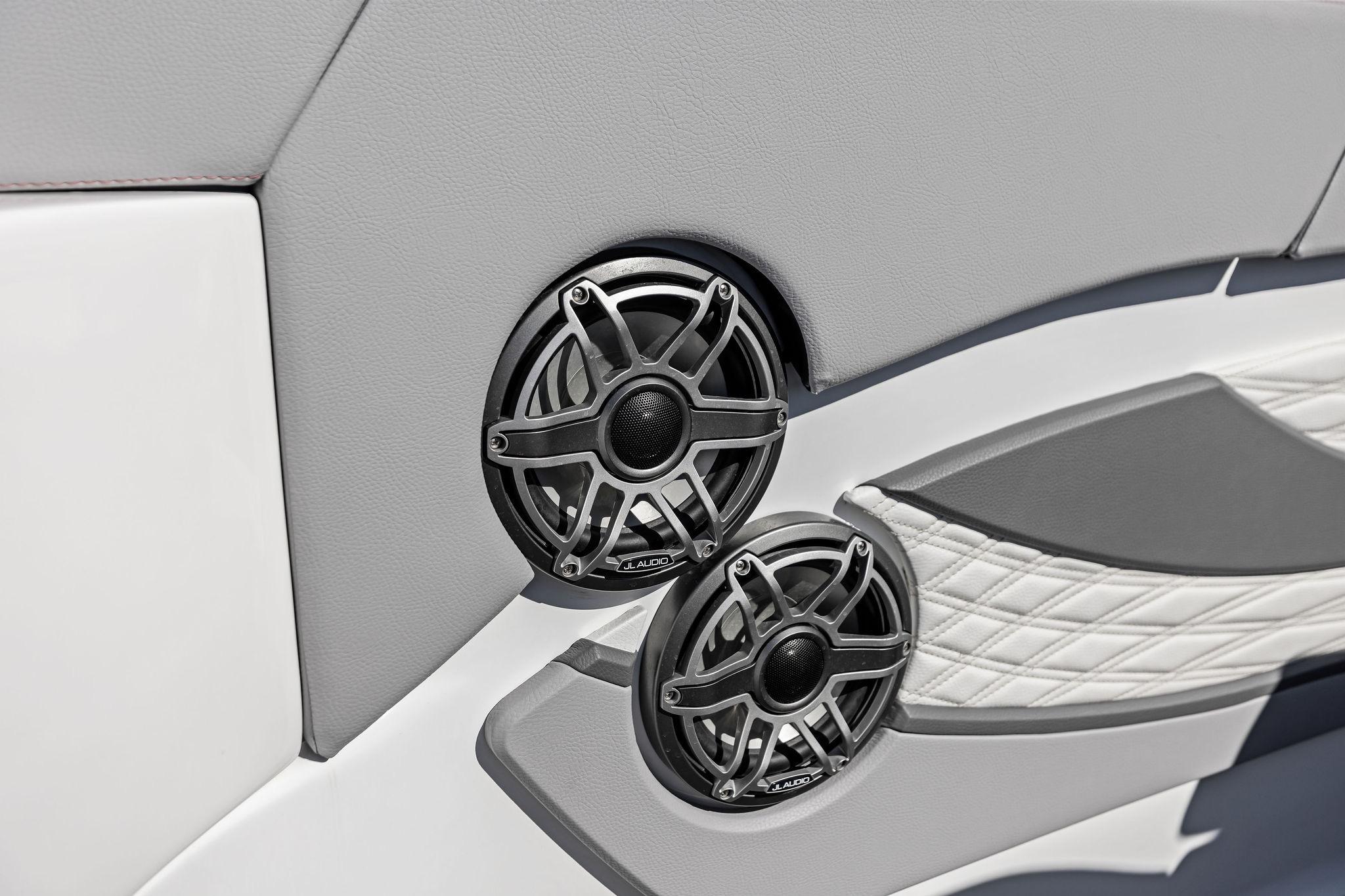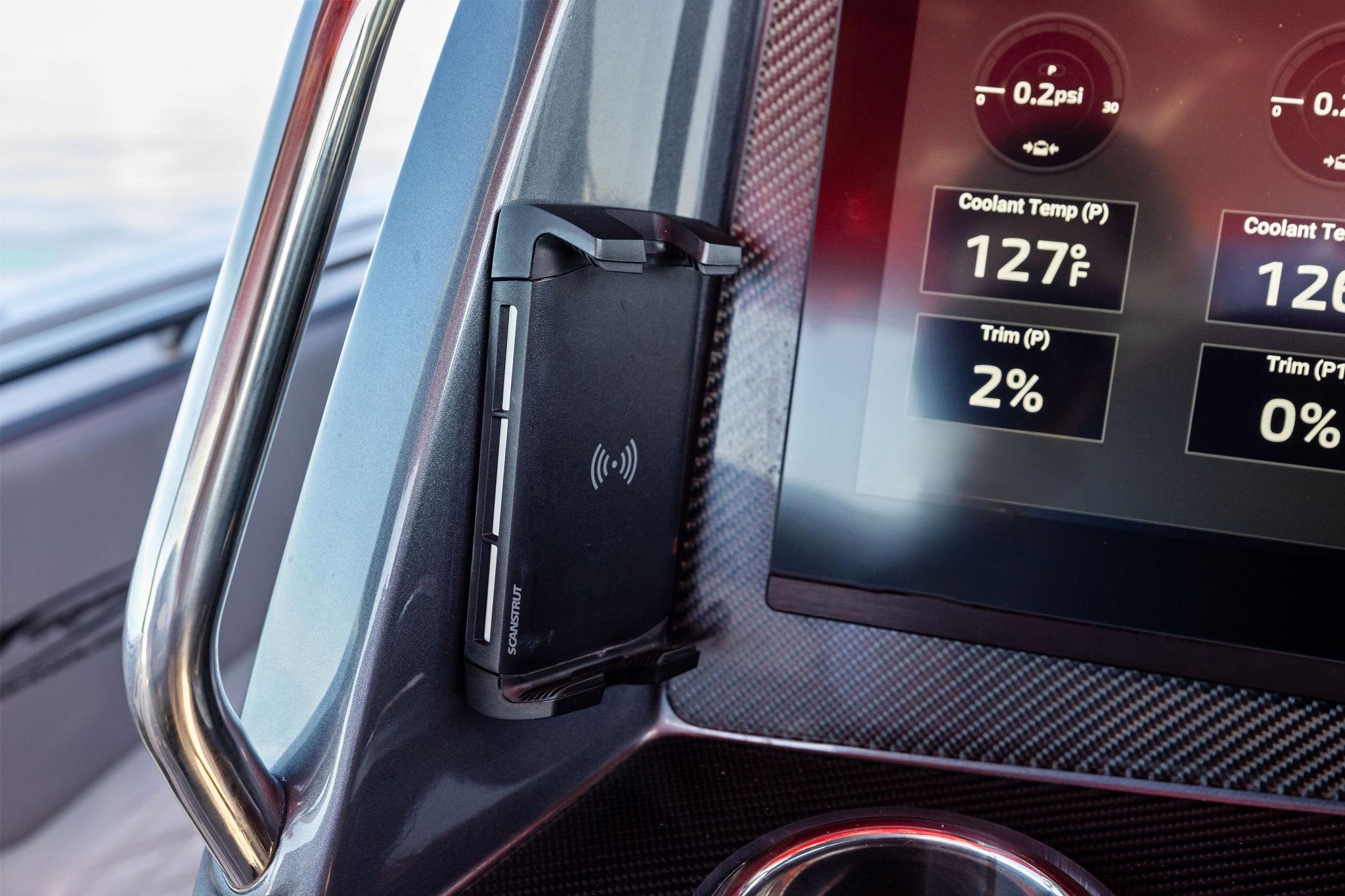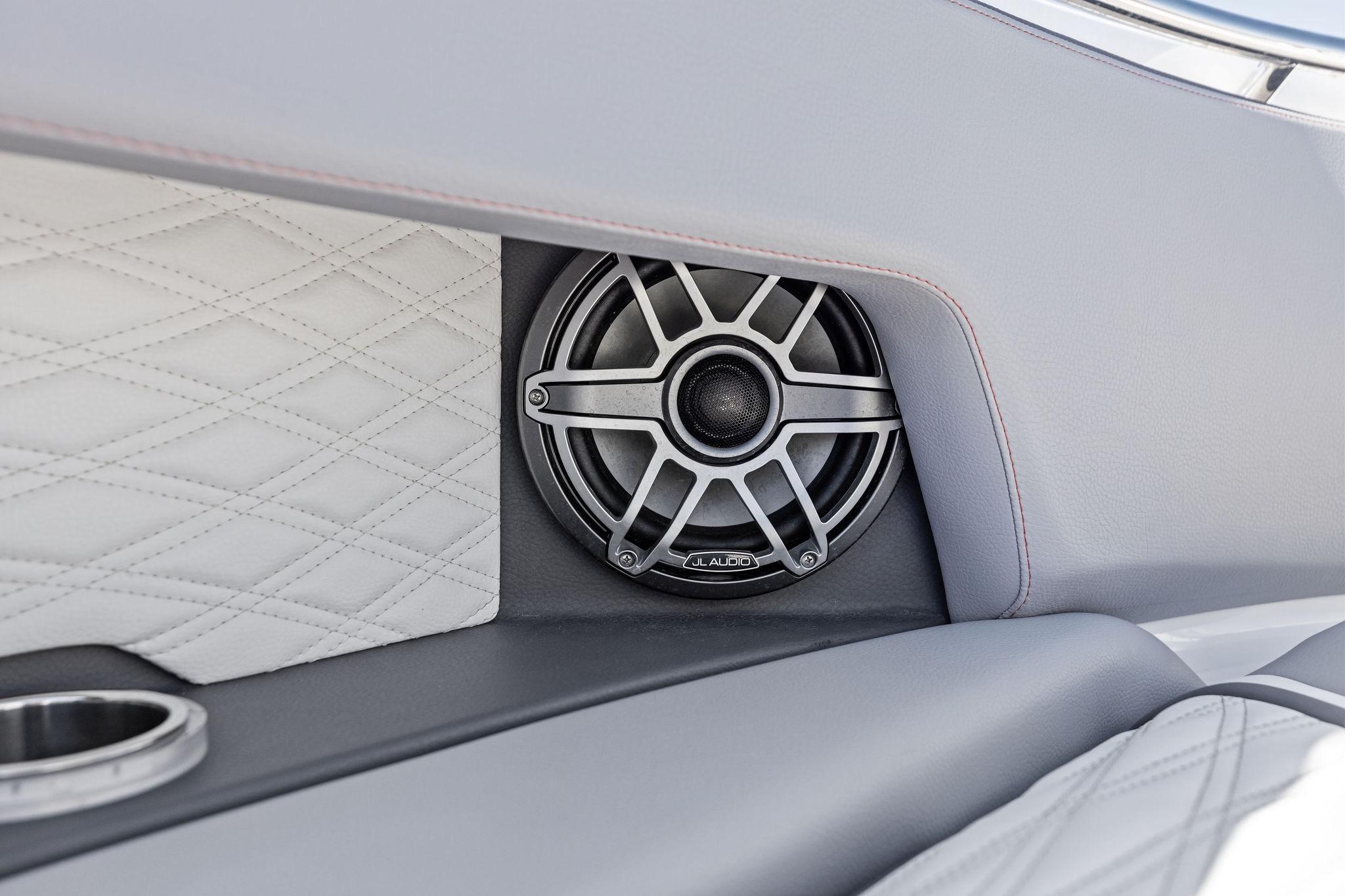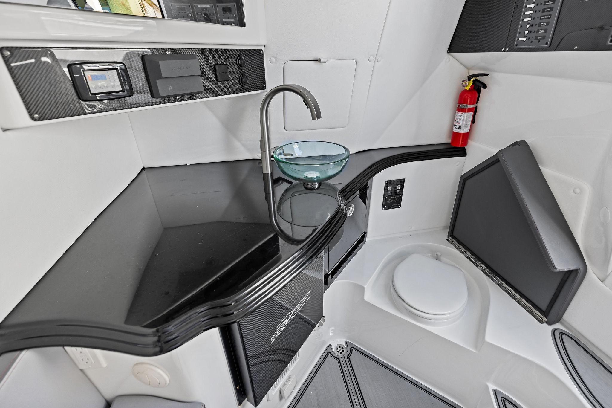 Colored Gel Coat Bottom. Stage 2 Paint job. Custom Painted Engine Body Panels. Cool Touch interior. SeaDek flooring. Cockpit Cooler and Storage. Chill Plate. Forward and Rear Shades. Stern Thruster. Full Boat Cover. Garmin 22 in center and Garmin 17’s on the sides. Garmin 22 above the helm. VHF Radio. 18-inch Garmin Radar Dome. Wireless Cellphone Charger on Dash. Stereo Stage 3. Wing Speakers. Bow Pop Up Speakers. Rear View Camera. GPS Tracking. Refrigerator in Cabin. SeaKeeper. Inverter with additional house batteries and Air Conditioning in Cabin. Large Aluminum Cleats. Bow Table with filler cushion for sun pad (table drops to floor). Helm Riser Pad. Single Point Engine Flush.