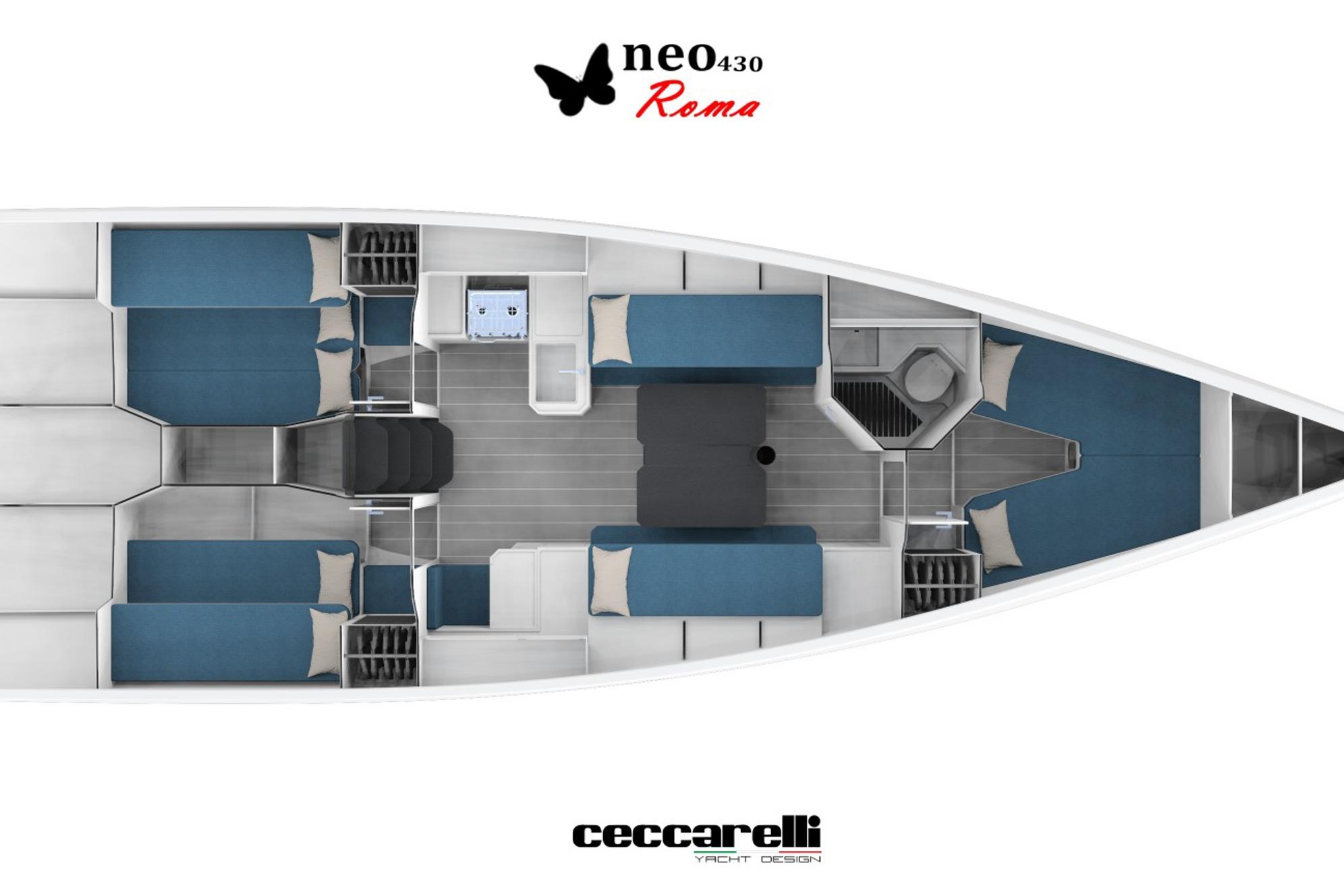 The Neo 430 Roma is a high-performance sailing yacht designed by Ceccarelli Yacht Design, renowned for its full-carbon construction that achieves an ultra-light displacement of around 5,700-5,800 kg.