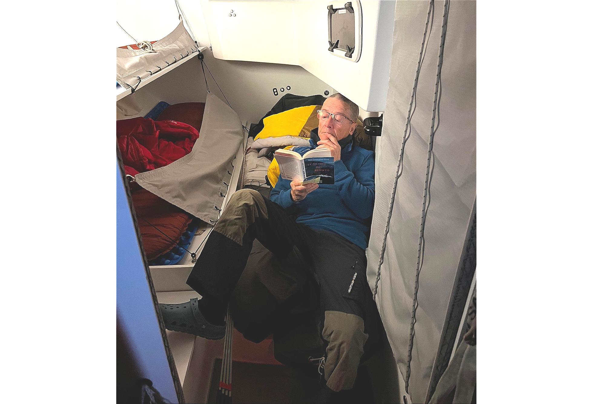 - Lee cloths added to all pivoting beds (2 in each aft cabin + 2 each side in the center through conversion of sofa), also shelves, and supplied “offshore-proof” trekking mattresses to replace cruising cushions while racing, thus ensuring adequate resting conditions while properly hiking for a 4 to 5 crew off-watch shift