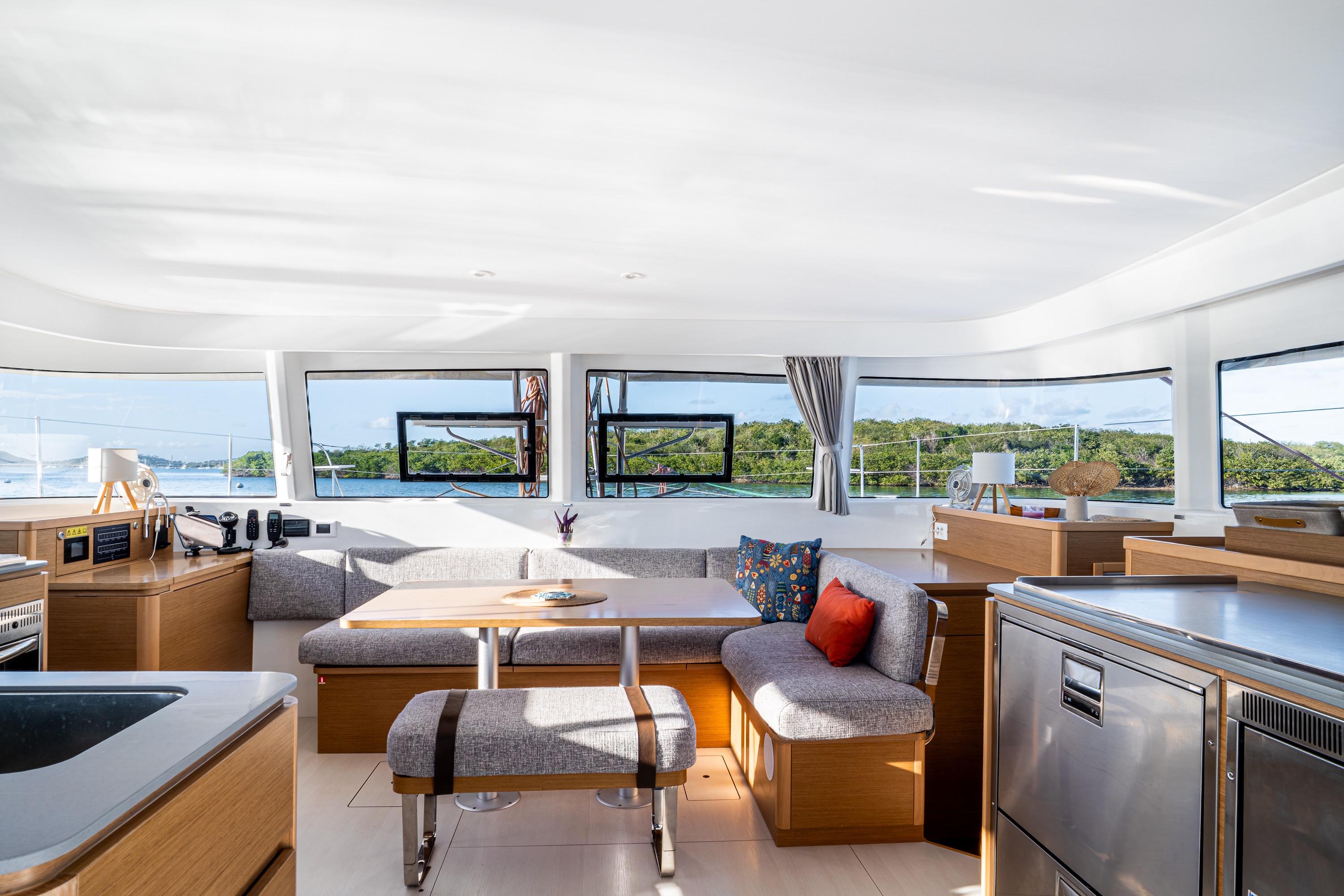 Spacious and bright central living area with panoramic visibility, ample seating and seamless connection to the cockpit.