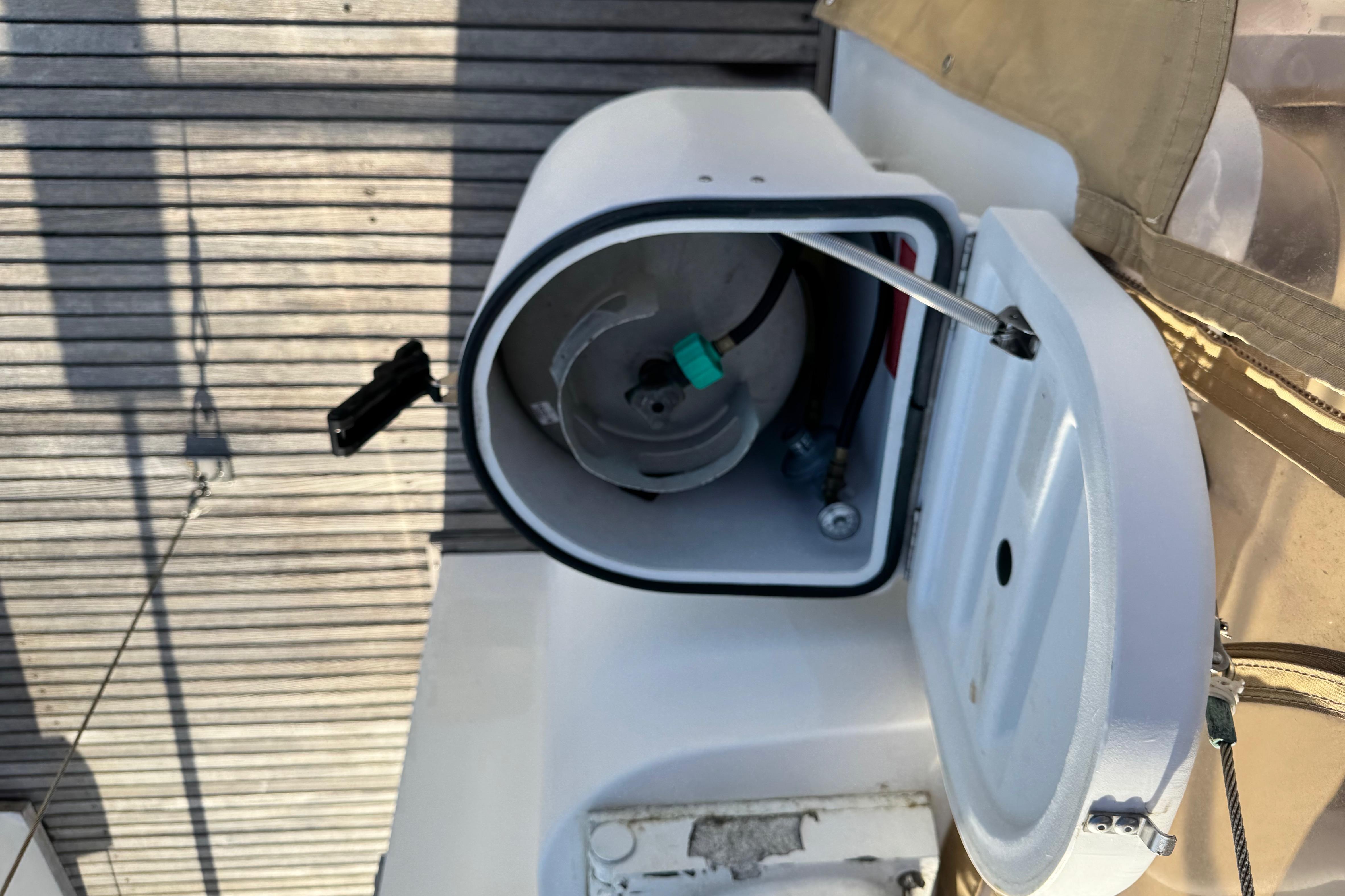 Lofrans Falkon Windlass, horizontal, rope/chain, three-station, 12V/1500W Aft DeckStaircase to flybridge, molded fiberglass w/louvered door for storage inside