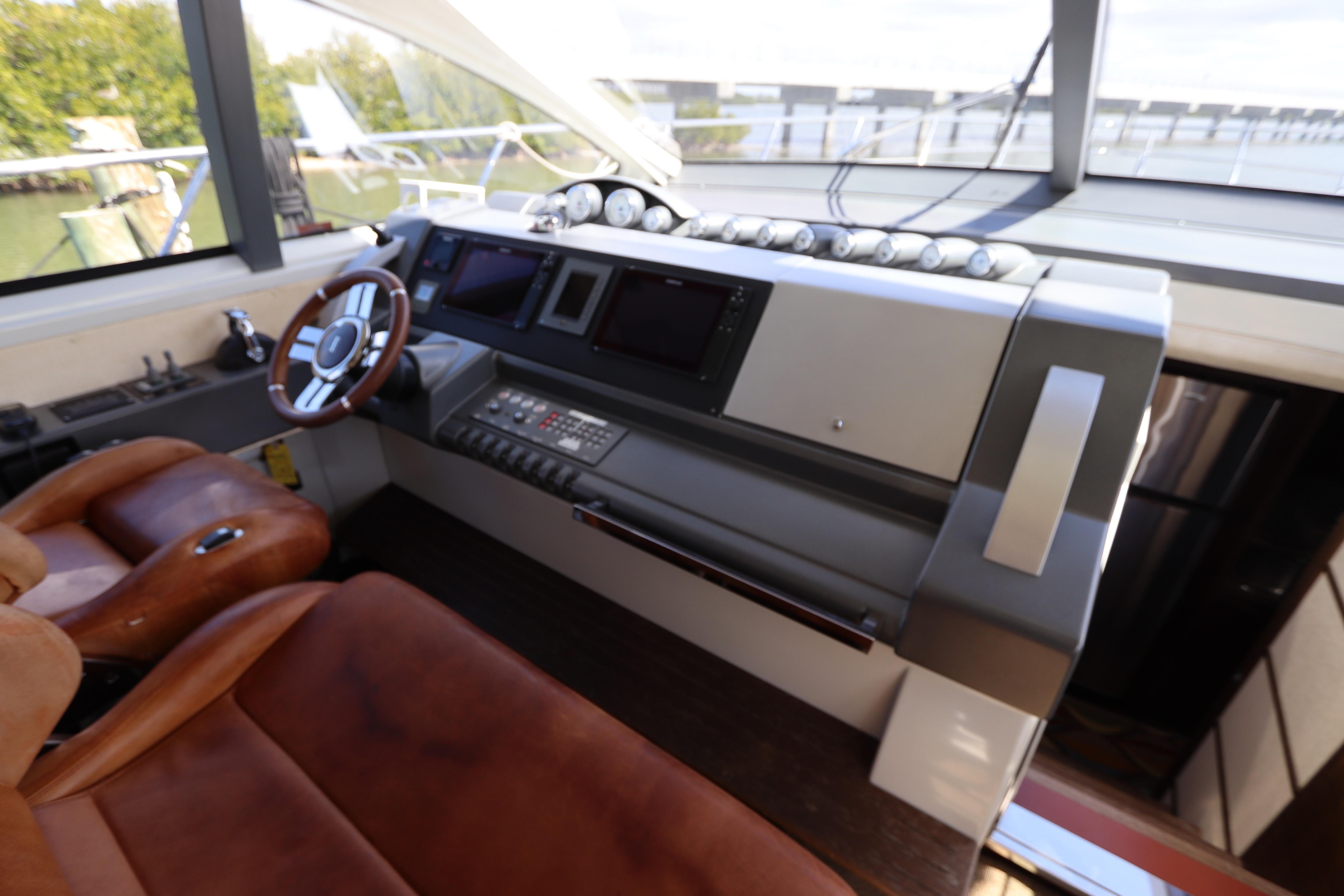 an inflatable or RIB. Finally, there’s a cut out in the forward sun pad for your wine and champagne. A good open-water performer, Cat 1,015hp C-18 V-drive diesels cruise at 28 knots (low 30s top).