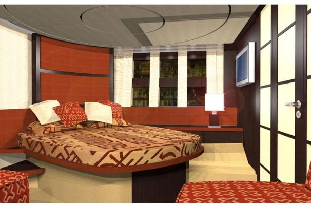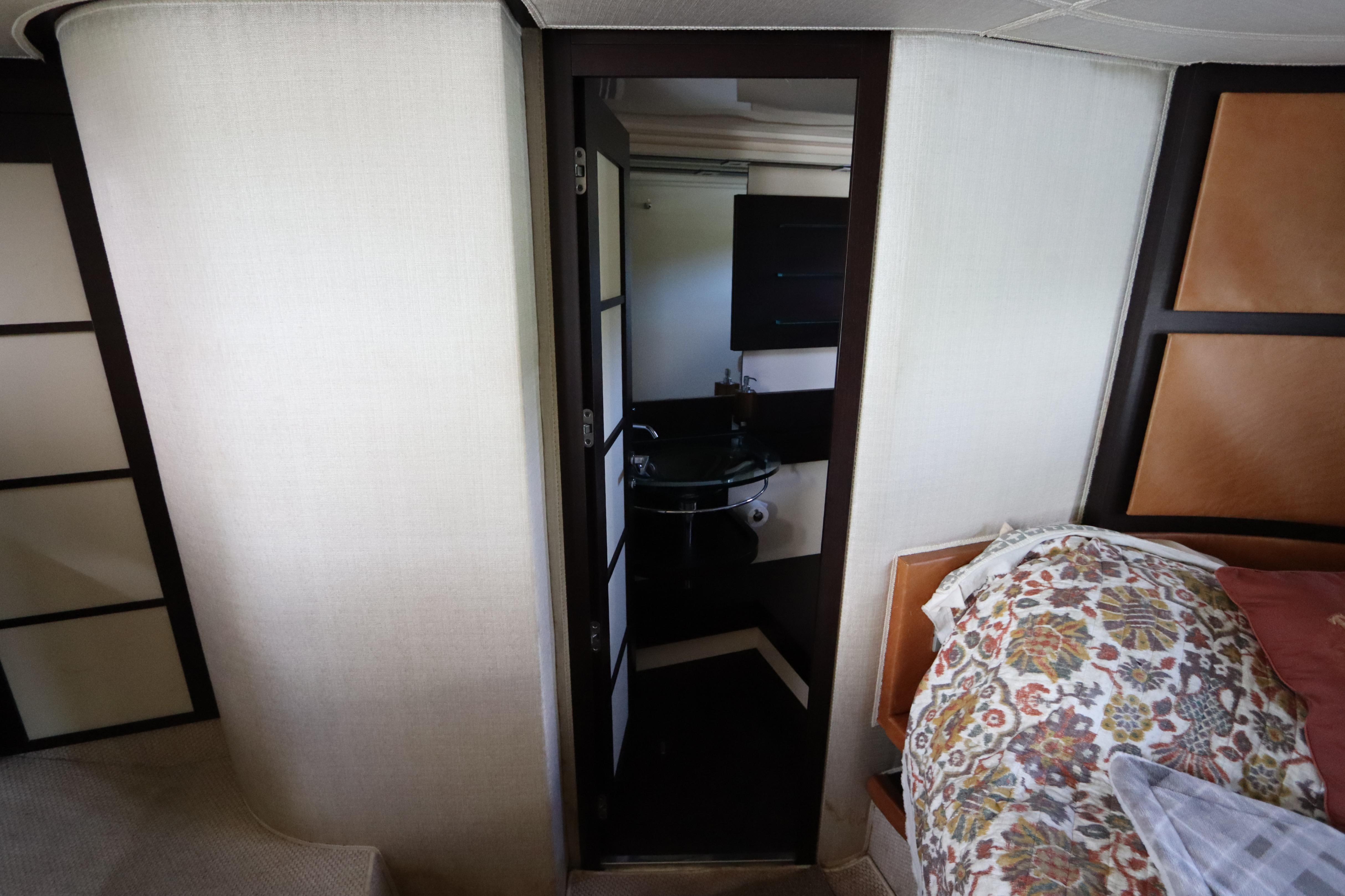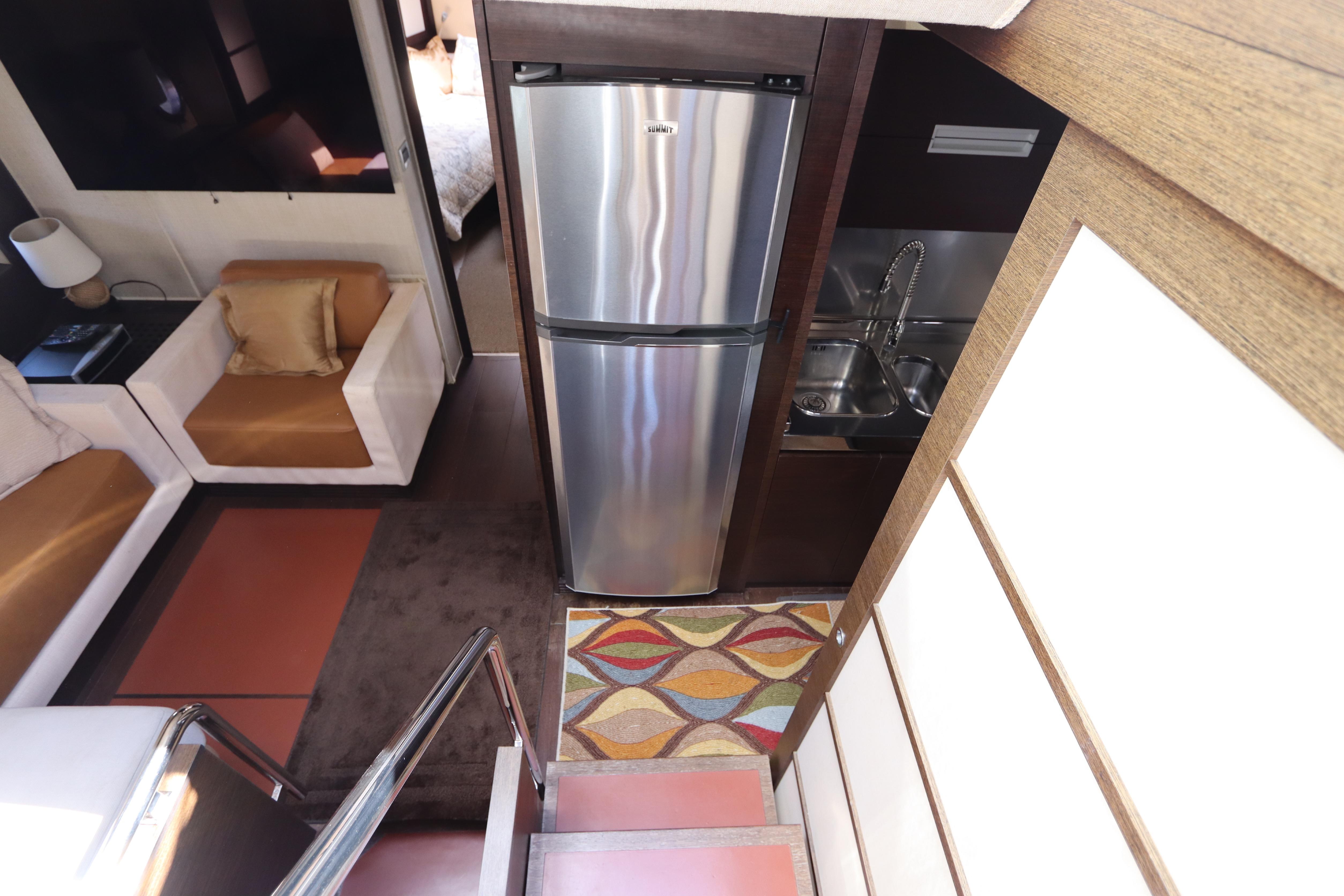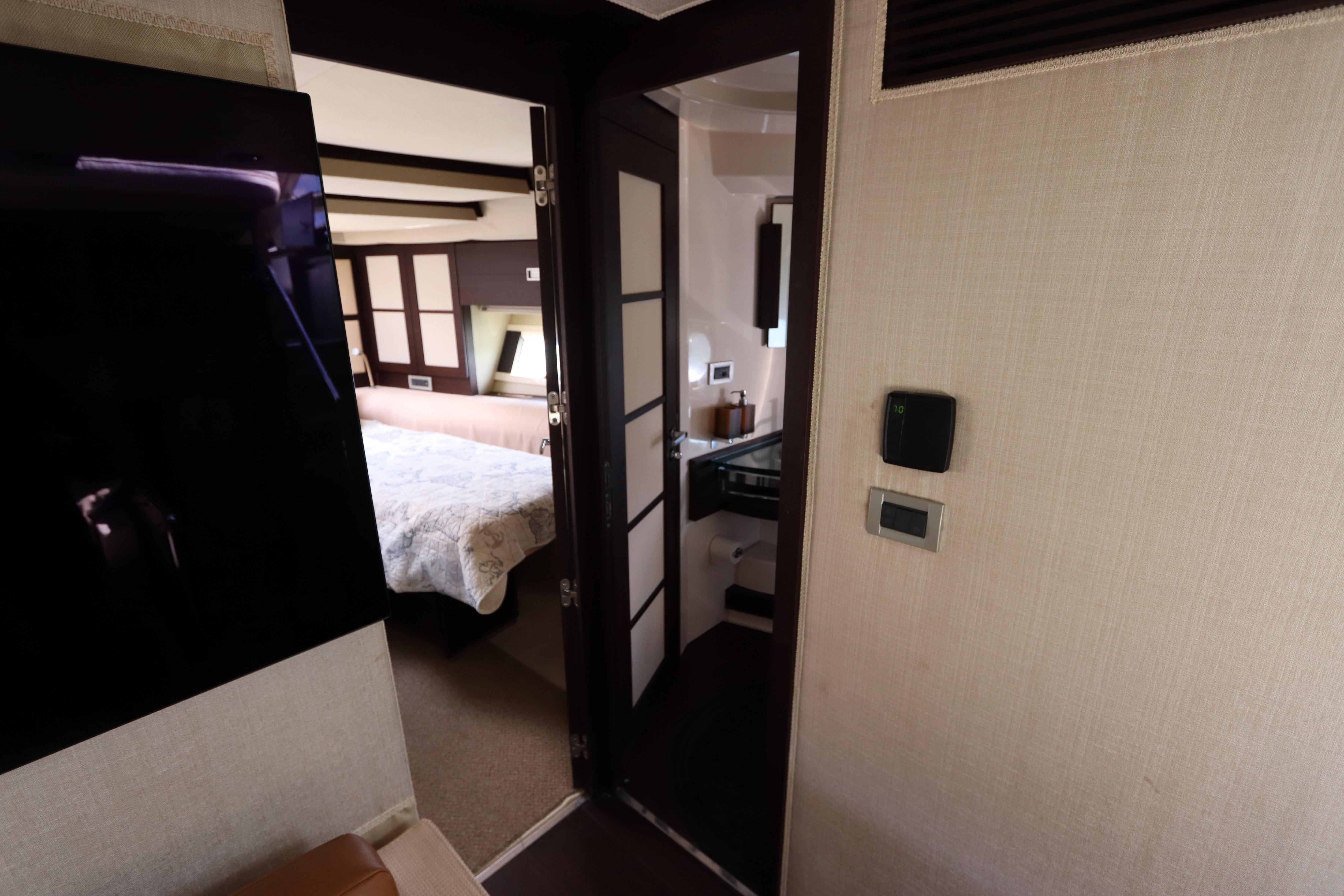 tiered side windows, the main deck layout includes a big salon with a power sunroof above. Offered with two or three staterooms, the two-stateroom floorplan replaces the second guest cabin with a versatile lower salon/lounge with self-contained galley. Both layouts feature a truly opulent amidships owner’s suite with