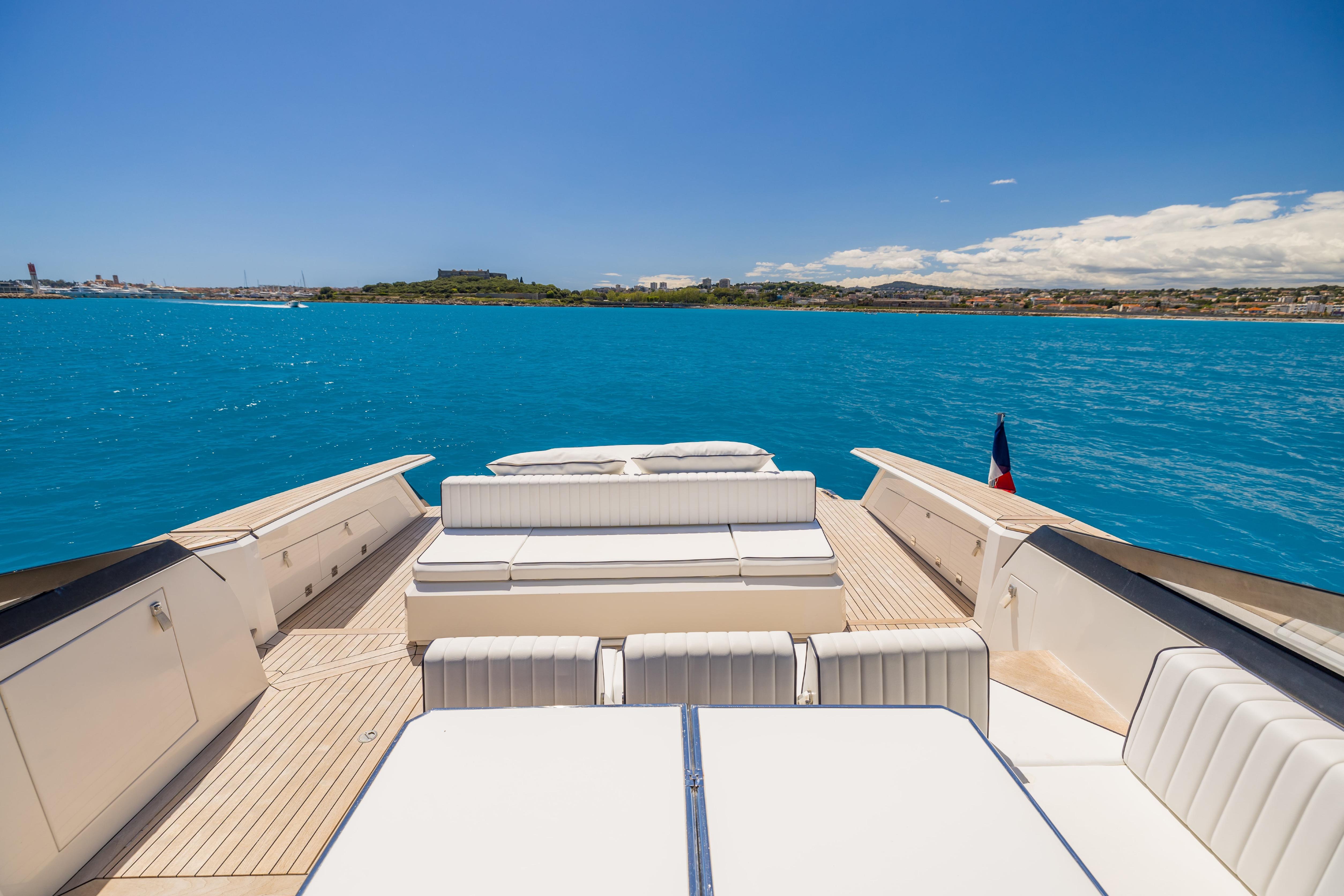 Le pont principal est pensé comme un large espace de vie ouvert, fluide et convivial. Le poste de pilotage, moderne et ergonomique, est entouré d’un salon extérieur, d’un bar entièrement équipé et d’une cuisine extérieure, permettant de profiter d’un confort total en navigation comme au mouillage. À l’avant, un vaste sunpad complète les zones de détente.