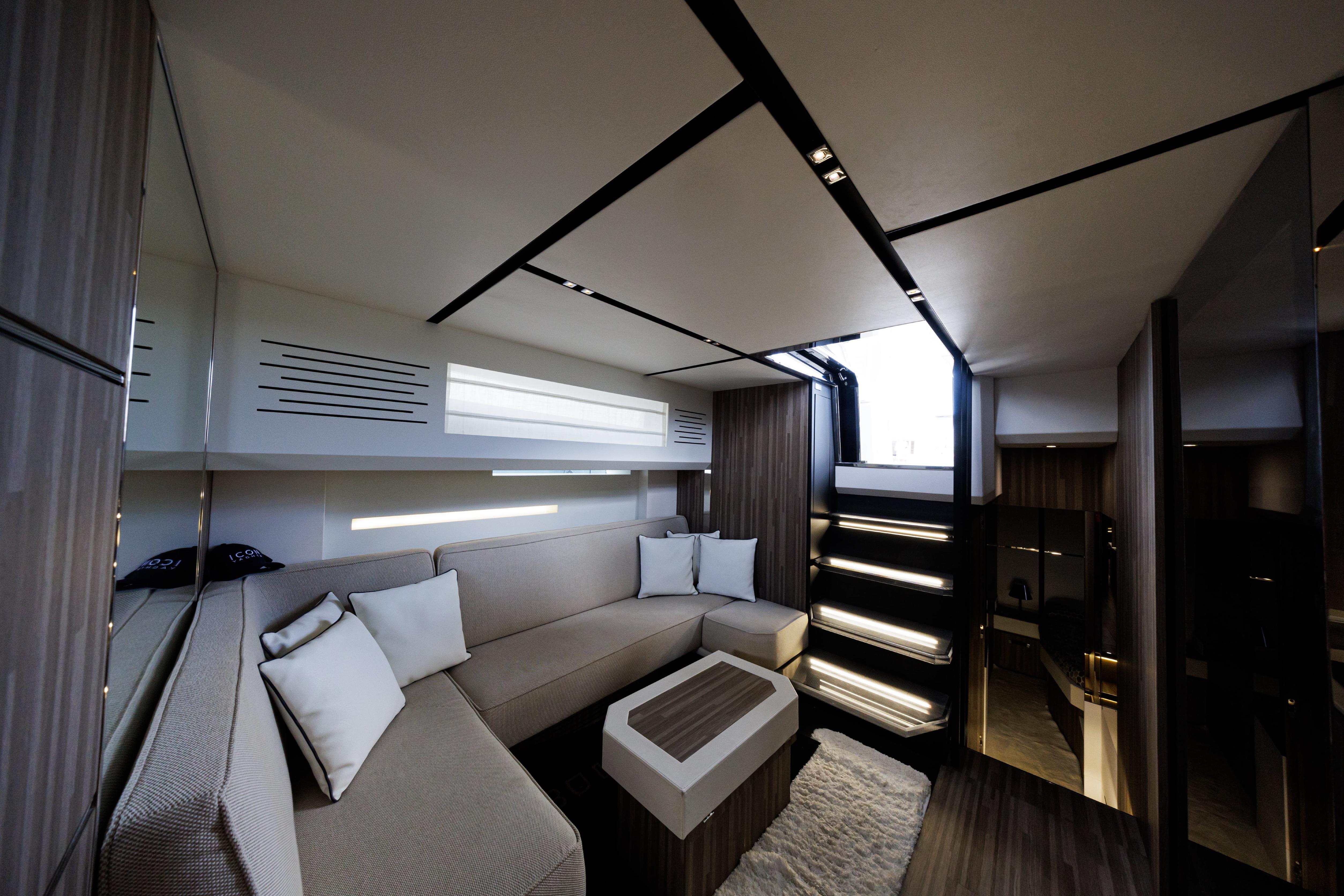 Son atout le plus spectaculaire réside dans son système XTensions : deux larges panneaux latéraux hydrauliques qui s’ouvrent en 30 secondes pour transformer la plage arrière en une immense terrasse sur l’eau. Ce véritable “beach club” offre un espace lounge modulable avec bains de soleil, coin repas, accès direct à la mer et possibilité d’ajouter la plateforme multifonction Transformer, idéale pour la baignade ou les water toys.