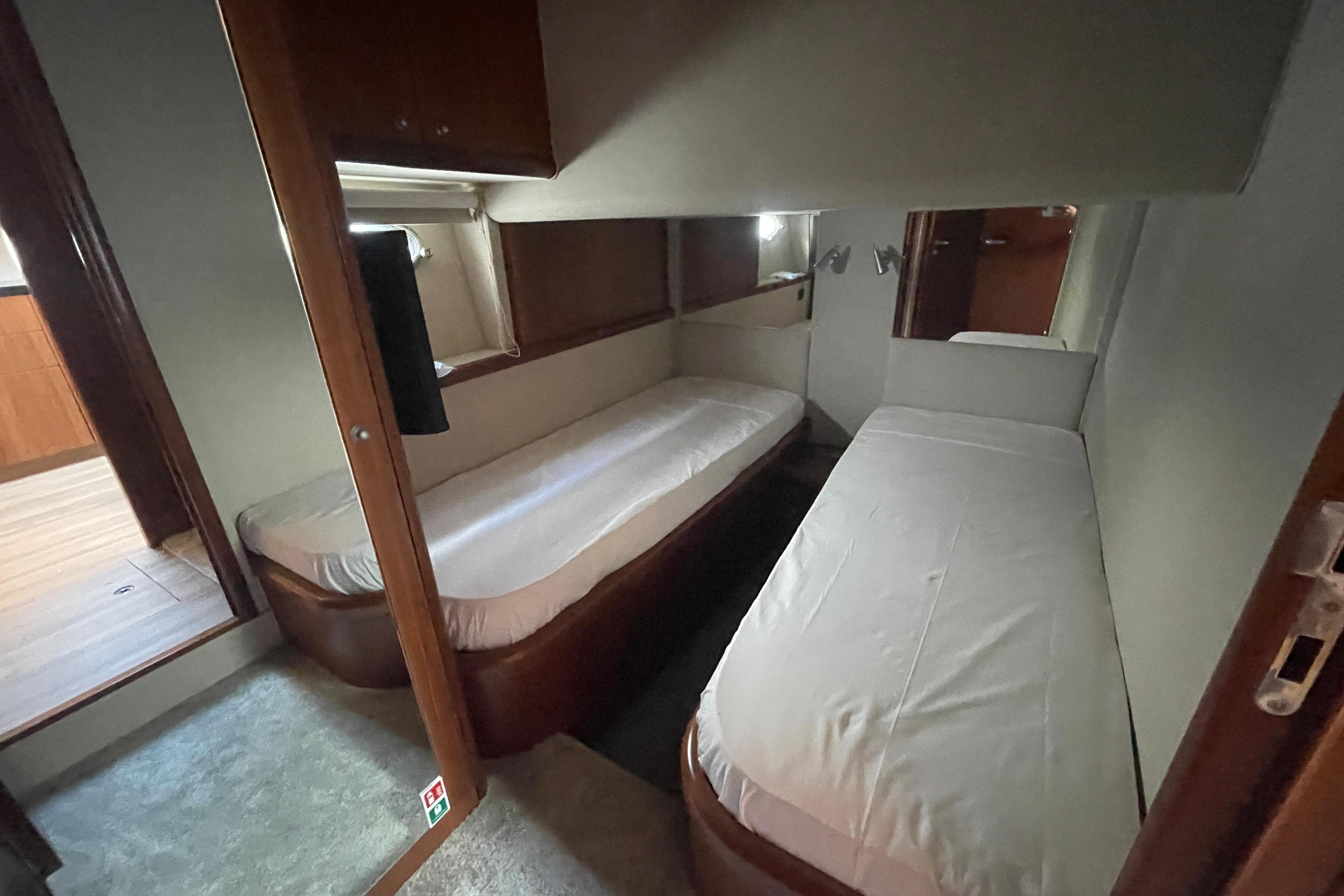 She accommodates up to 6 guests in 3 elegant ensuite cabins, plus a separate crew cabin with independent access for complete privacy. The lower deck layout is practical, comfortable, and ideal for both private cruising and charter operations.