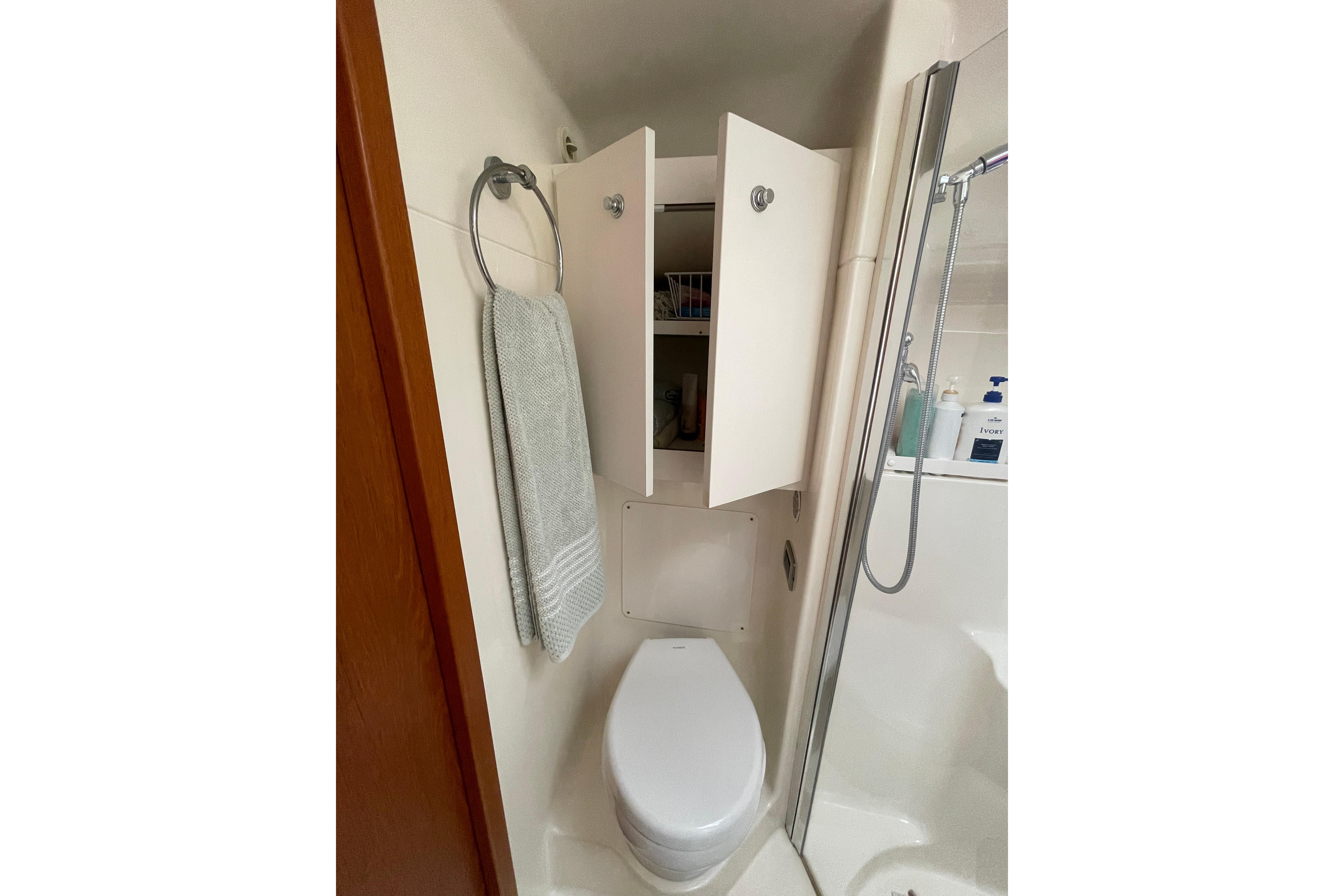 - Full fiberglass head with bi-fold glass shower door, shower sump pump, and integrated seat