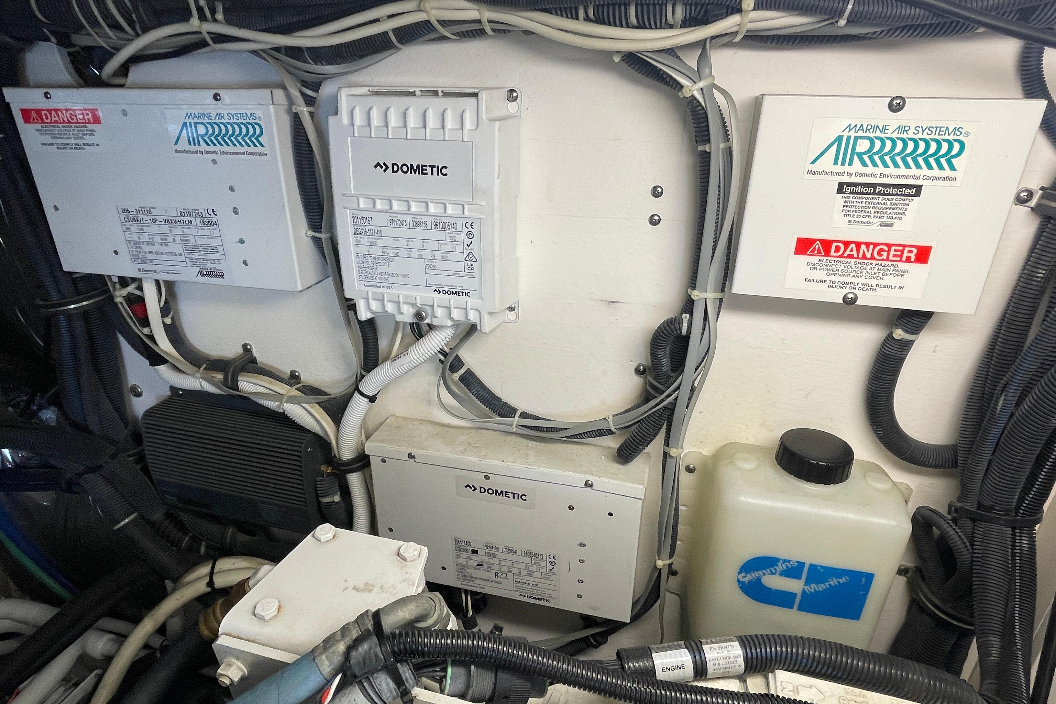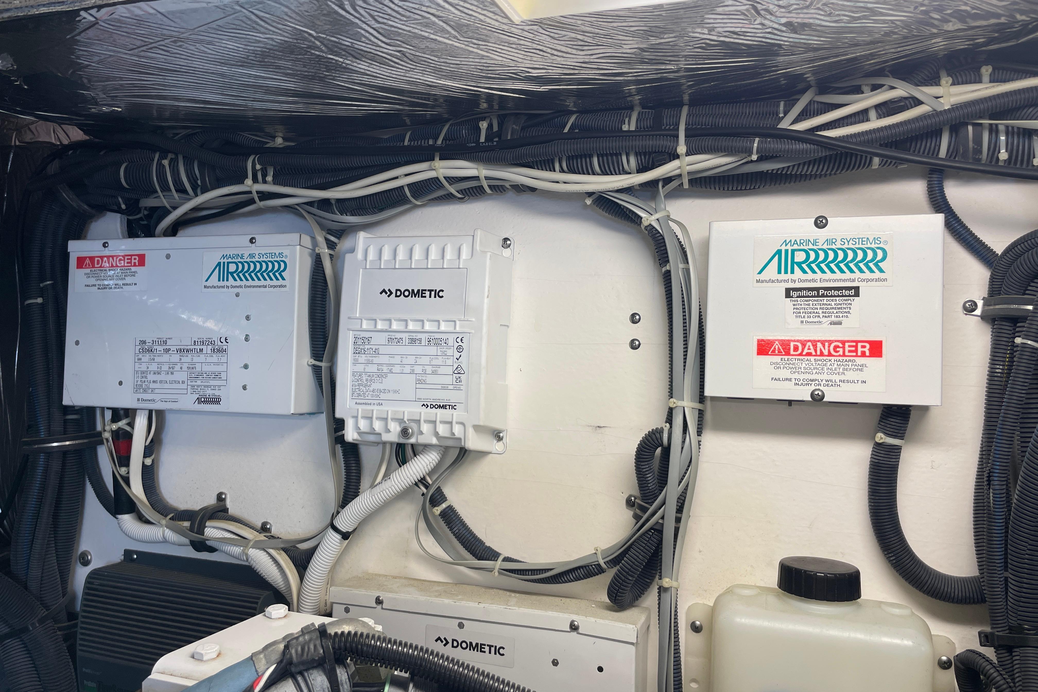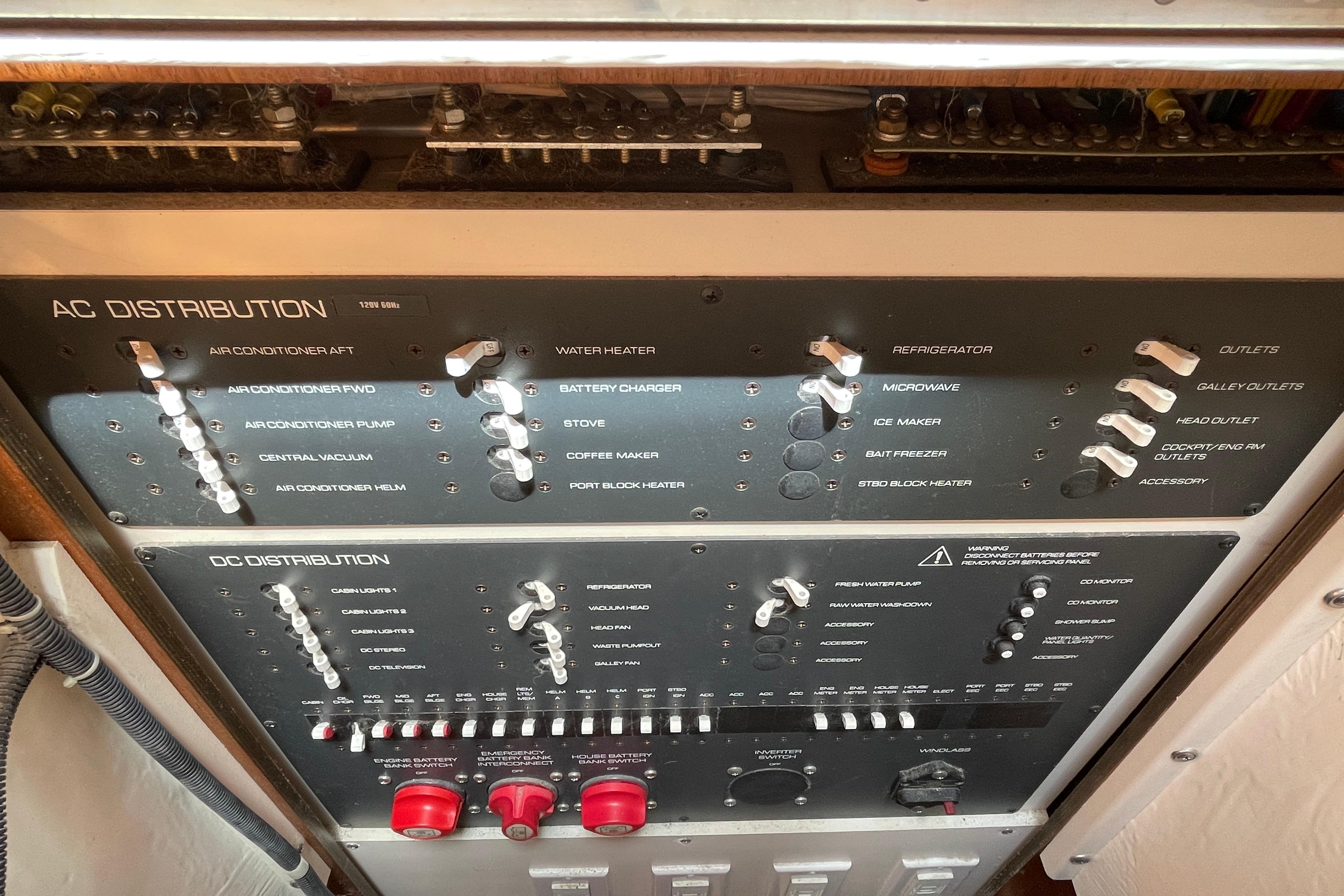 - Tiara custom 12V DC and 120V/240 AC electrical system with master distribution panel under companionway steps