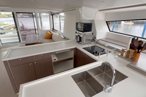 The fully equipped galley is positioned to maximize space and functionality. It includes high-end appliances, ample counter space, and storage, perfect for preparing meals while entertaining.